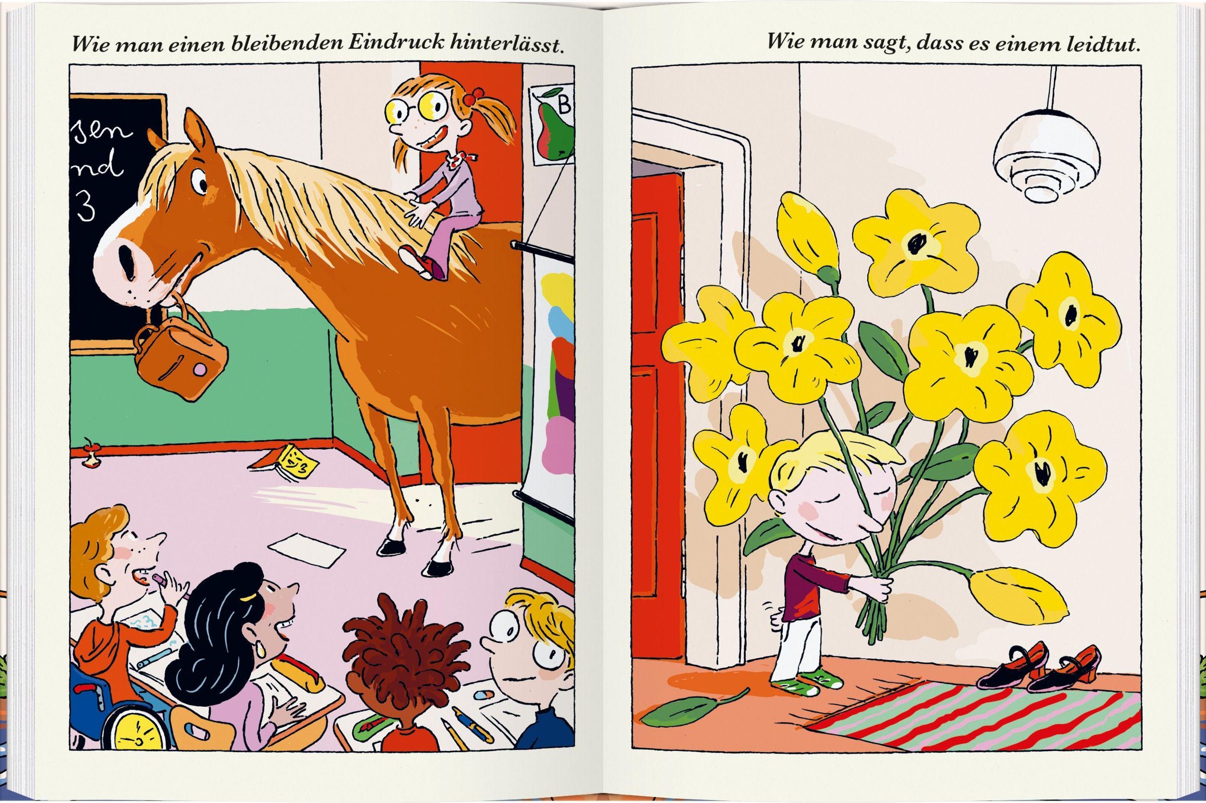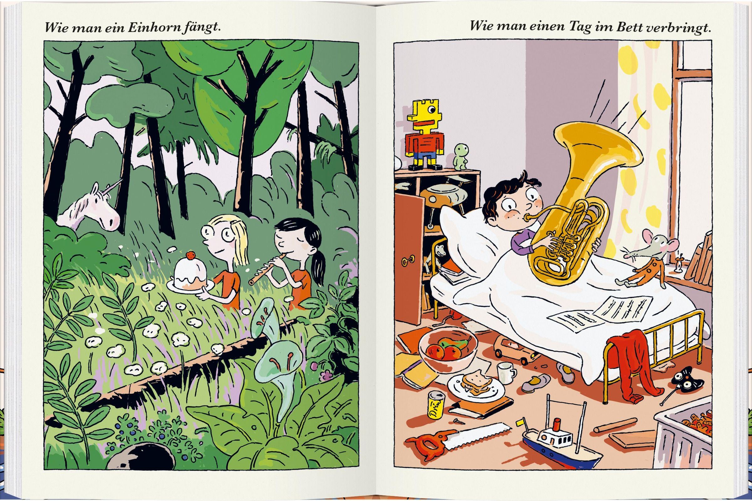 "Anleitung für alles." Ein Mädchen balanciert mit Schirm und Werkzeugkiste über einen Fluss mit einem fröhlich springenden Fisch., Buch
