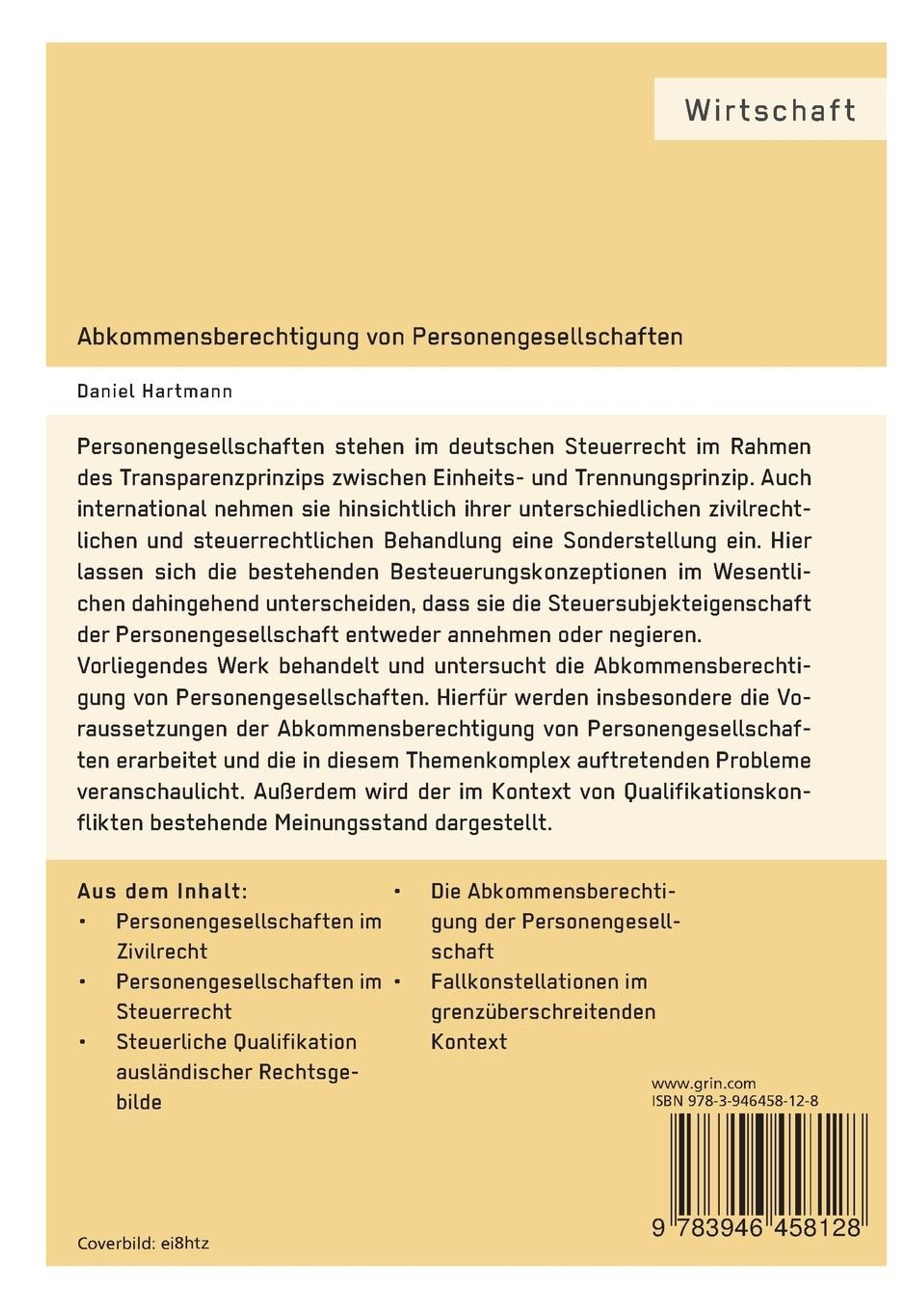 Aus dem Inhalt: Personengesellschaften im Zivilrecht Personengesellschaften im Steuerrecht Steuerliche Qualifikation ausländischer Rechtsgebilde Die Abkommensberechtigung der Personengesellschaft Fallkonstellationen im grenzüberschreitenden Kontext