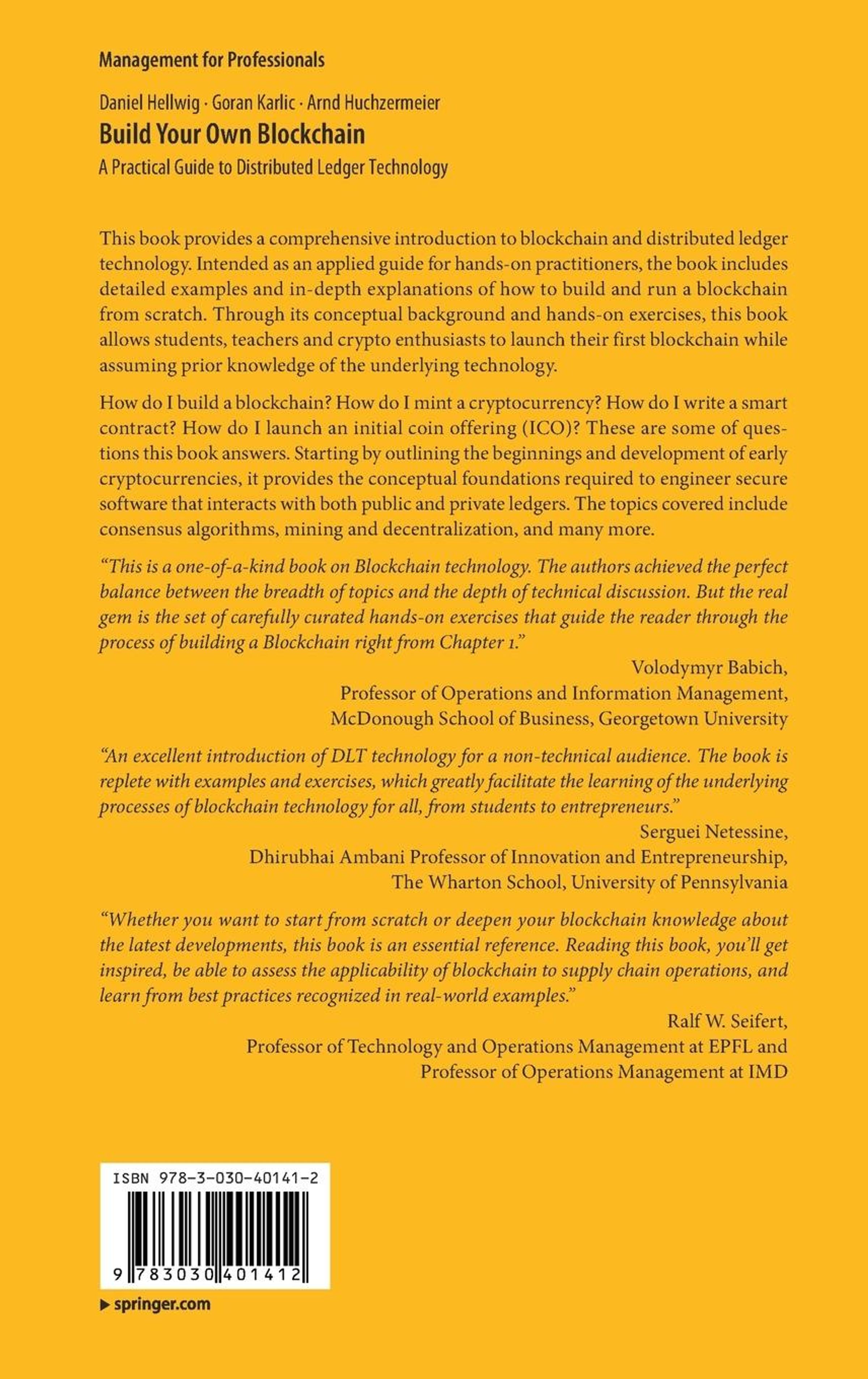 "This is a one-of-a-kind book on Blockchain technology. The authors achieved the perfect balance between the breadth of topics and the depth of technical discussion. But the real gem is the set of carefully curated hands-on exercises that guide the reader through the process of building a Blockchain right from Chapter 1." Volodymyr Babich, Professor of Operations and Information Management, McDonough School of Business, Georgetown University