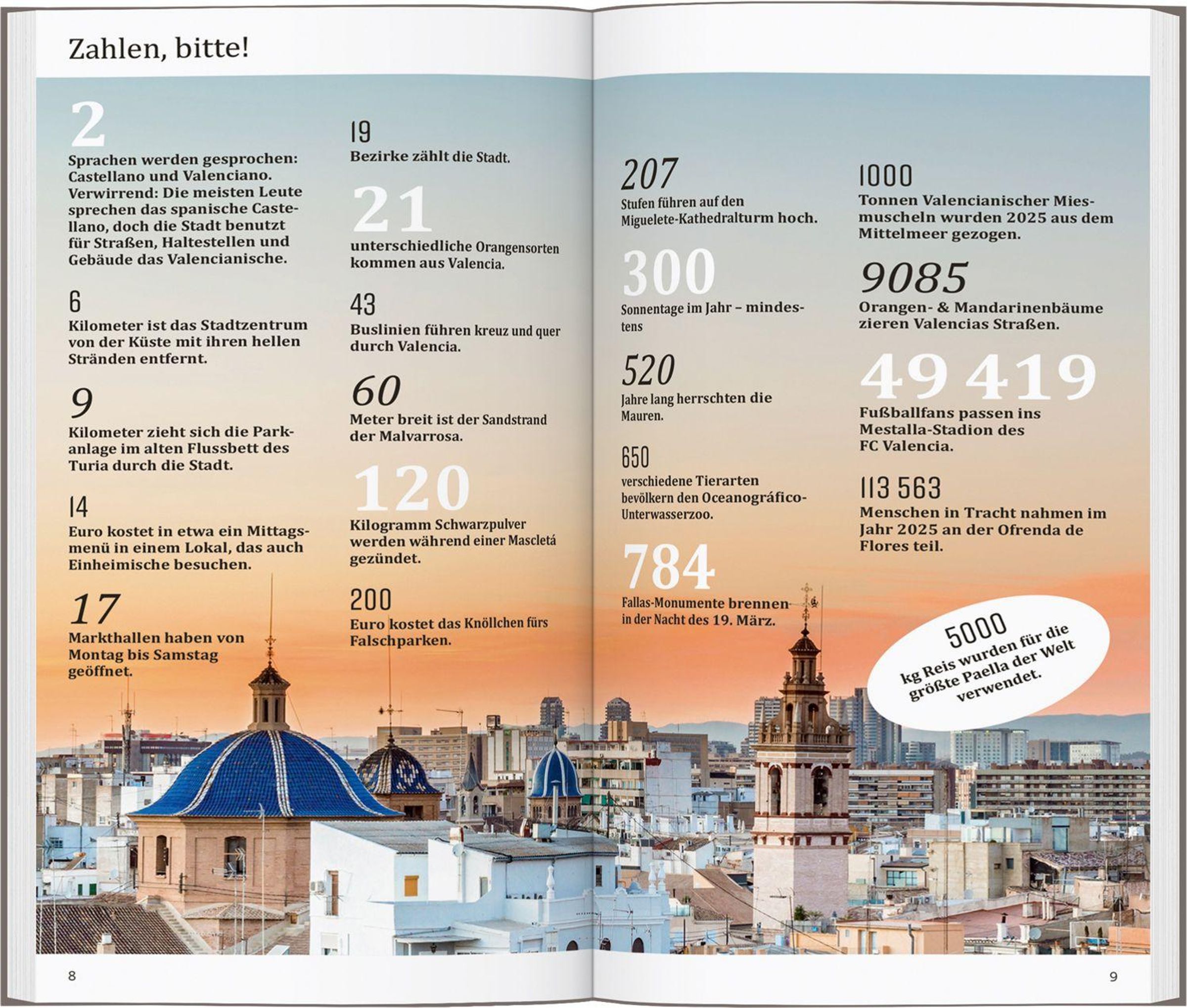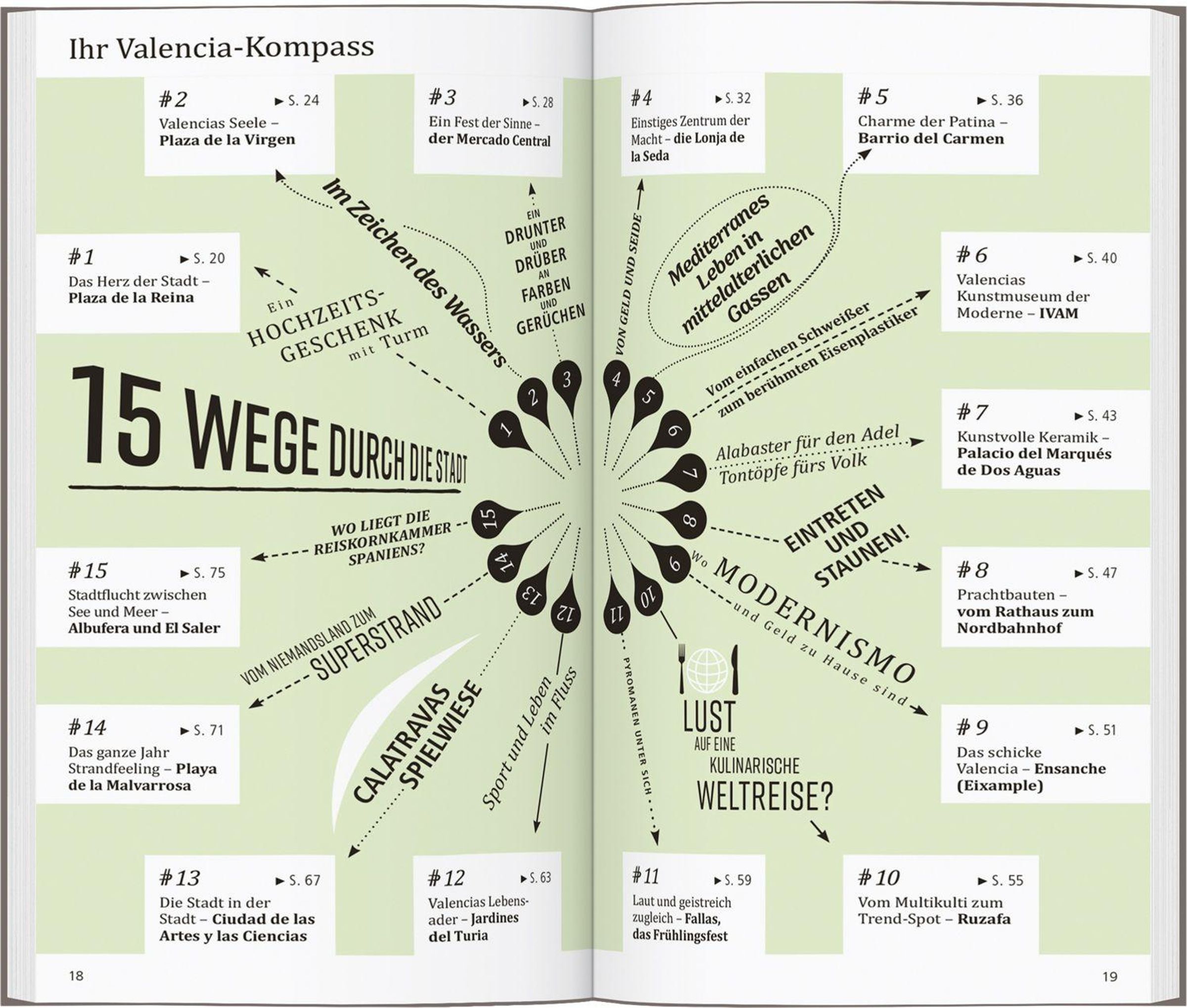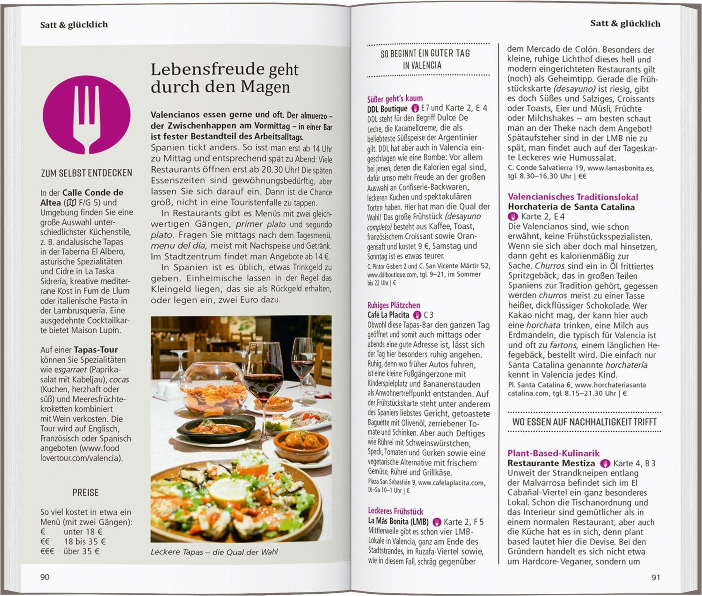 In eigenen Kapiteln erfahren Sie, wo es sich in fremden Betten gut schläft, wo Sie glücklich satt werden, wohin die Valencianos zum Stöbern und Entdecken gehen und wohin es sie zieht, wenn die Nacht beginnt.