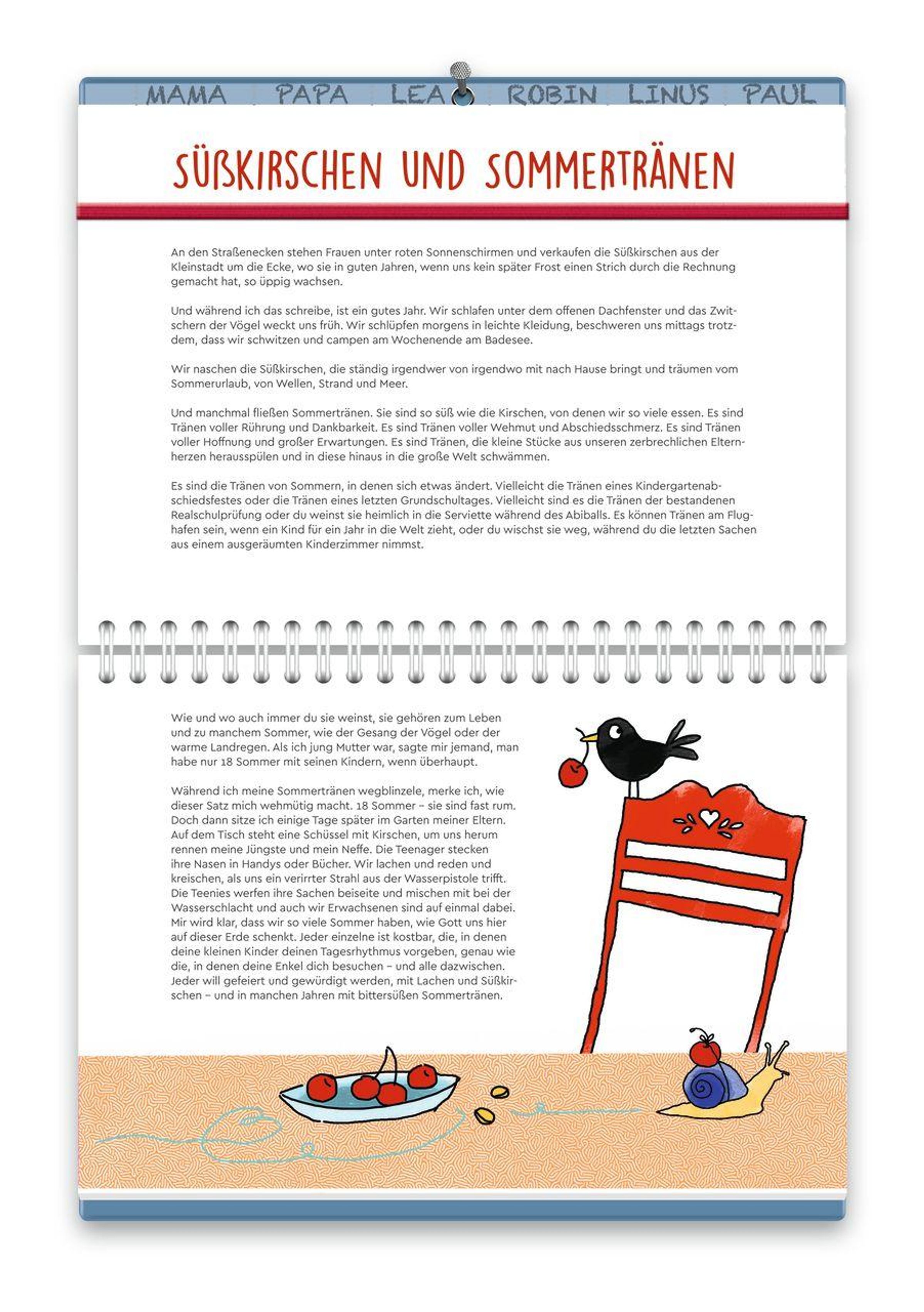 Der Kalender ist für bis zu sechs Familienmitglieder geeignet, die dank der praktischen Gestaltung nur einmal für alle Monate oben auf dem Einband eintragen werden. Das großzügige Kalendarium mit einer Woche pro Doppelseite bietet viel Platz für Termine und ToDos. Zu den hilfreichen Listen und Übersichten im Anhang gehören u. a. Stundenpläne, Urlaubspackliste, Haushaltsdienste, Gemüsekalender, Ferientermine und eine Jahresübersicht.