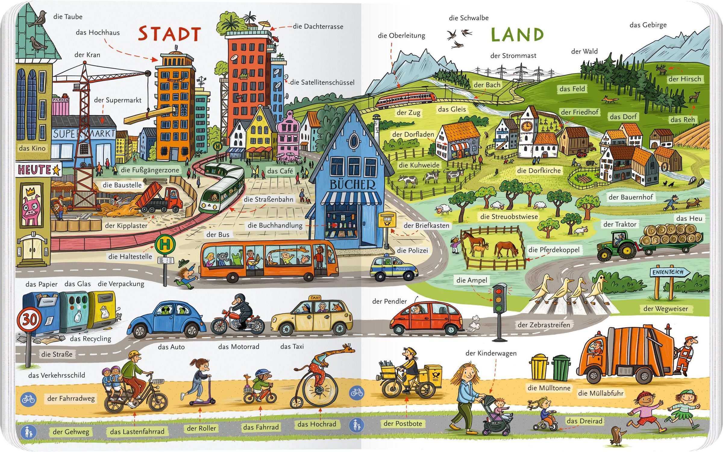 Menschen und Tiere, Stadt und Land, spielen, essen, sich bewegen ... all das und vieles mehr gibt es in diesem Bildwörterbuch zu entdecken! Die Welt ist voller Dinge und damit Wörter, die nur darauf warten, dass wir uns mit ihnen vertraut machen. Egal, ob als kleines Kind beim Spracherwerb oder wenn wir eine neue Sprache lernen. Kleine Szenen regen zum Entdecken, Benennen, Erzählen und Fantasieren an und laden dazu ein, miteinander ins Gespräche zu kommen. Ein Bildwörterbuch für alle!