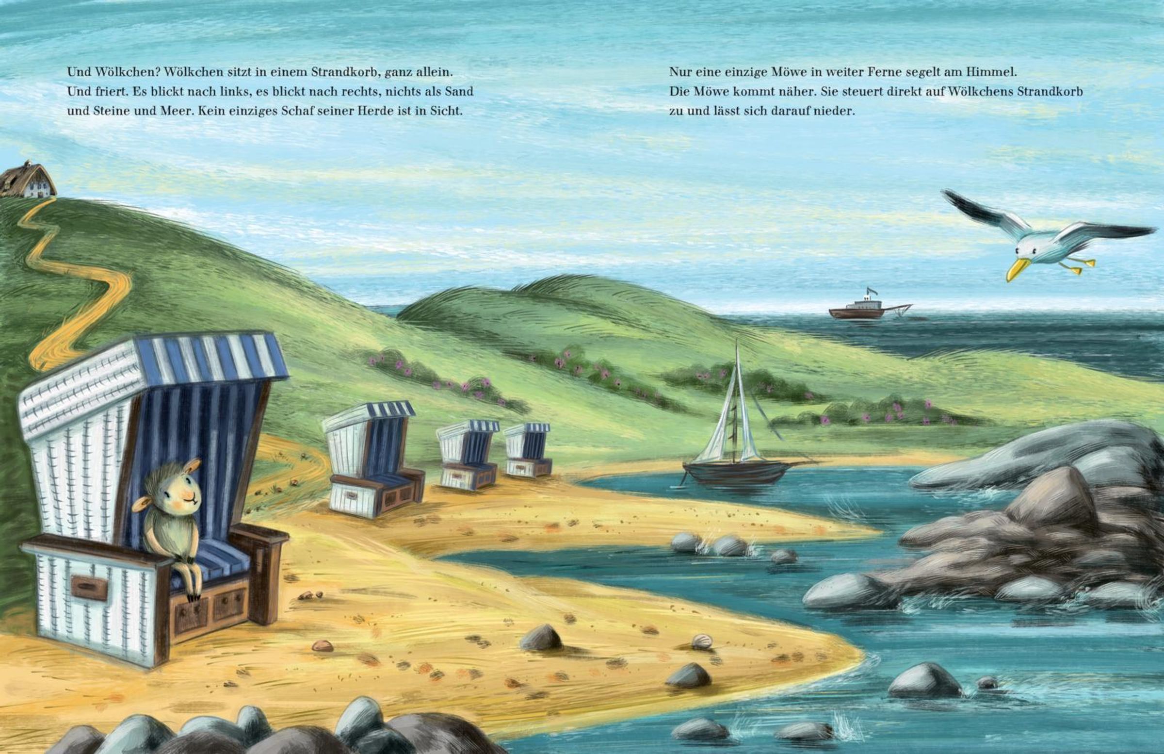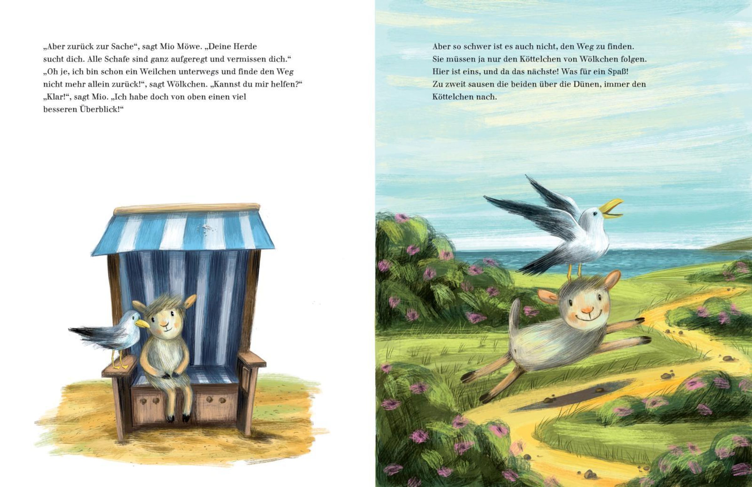 Wölkchen, das kleinste Schaf der Herde, träumt von Freiheit und Weite - und verirrt sich dabei in die Dünen an der Küste. Dort trifft es völlig allein auf Mio Möwe, die das verirrte Schaf neugierig beobachtet. Obwohl Schafe und Möwen einander eigentlich aus dem Weg gehen, entsteht zwischen den beiden eine besondere Freundschaft. Gemeinsam finden sie den Weg zurück, und sogar Möwen und Schafe rücken etwas näher zusammen.