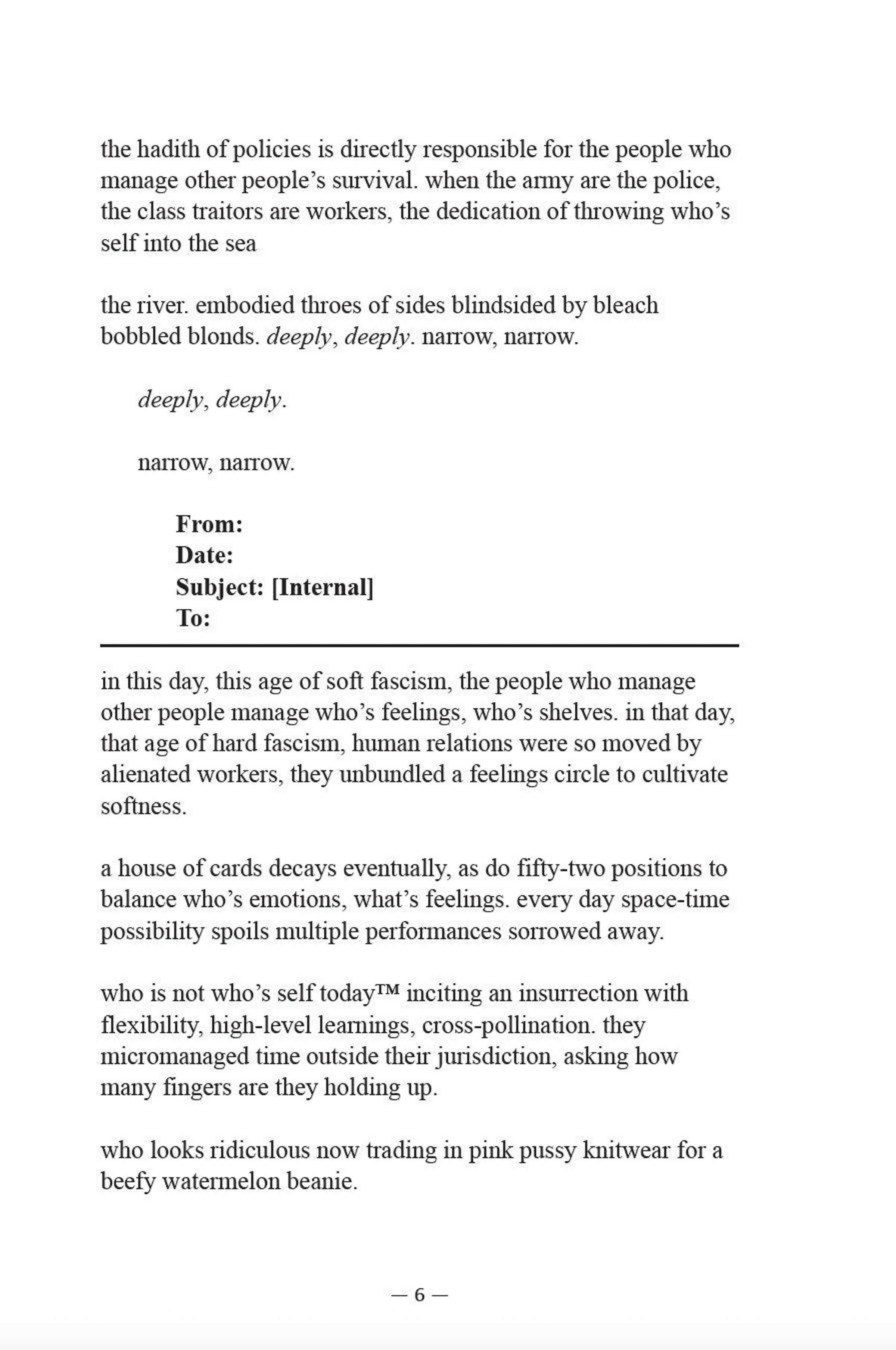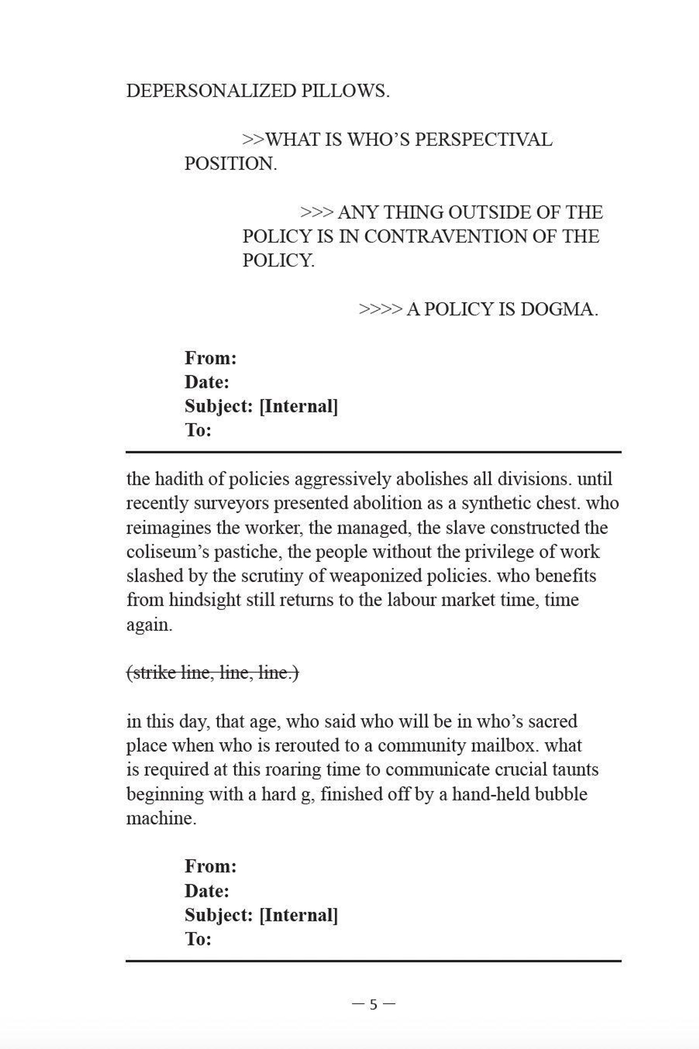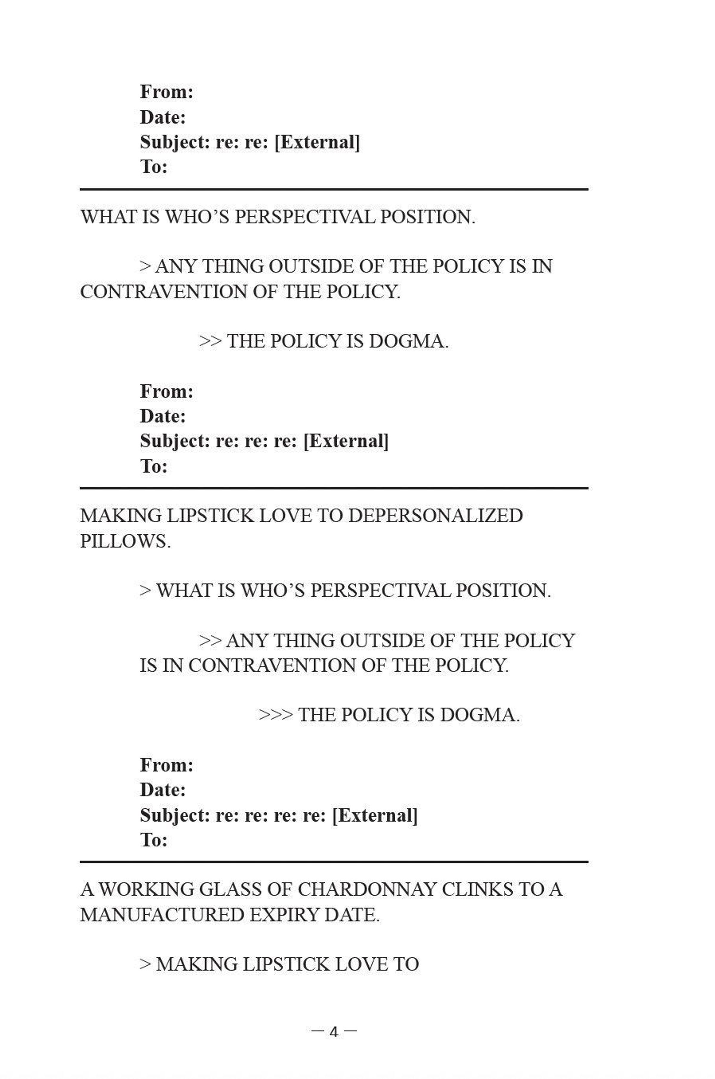 Verbal Violence unravels, dissects, and shreds the language of the professional managerial class. Here the master's house and tools are in flames, fire fanned from within, as their colosseum is turned quarry. Critically straining the email thread, the Freedom of Information Request, and the white paper through an aesthetics of anger that appropriates their last gasps at relevancy, Verbal Violence registers the absurdities of a purposeless people "just doing their job." Hacking up neoliberal doublespeak, ideological reproduction, and progressive-except-Palestine rhetoric, La France spits it out time and time again, scheduling a meeting to verbalize the what and the who liberal democratic institutions systematically shut down. Verbal Violence confronts capitalism's managerial style guide for saying nothing at all with the fiery and empathetic conscience of the managed, their cri de cœur cracking the straight-faced bureaucracy of our most banal communications.