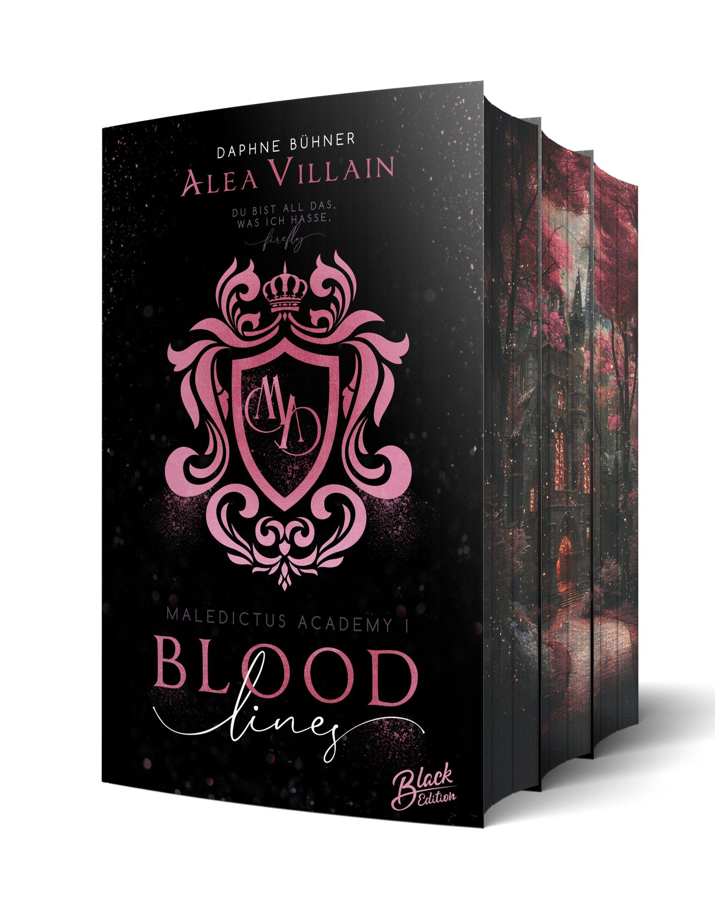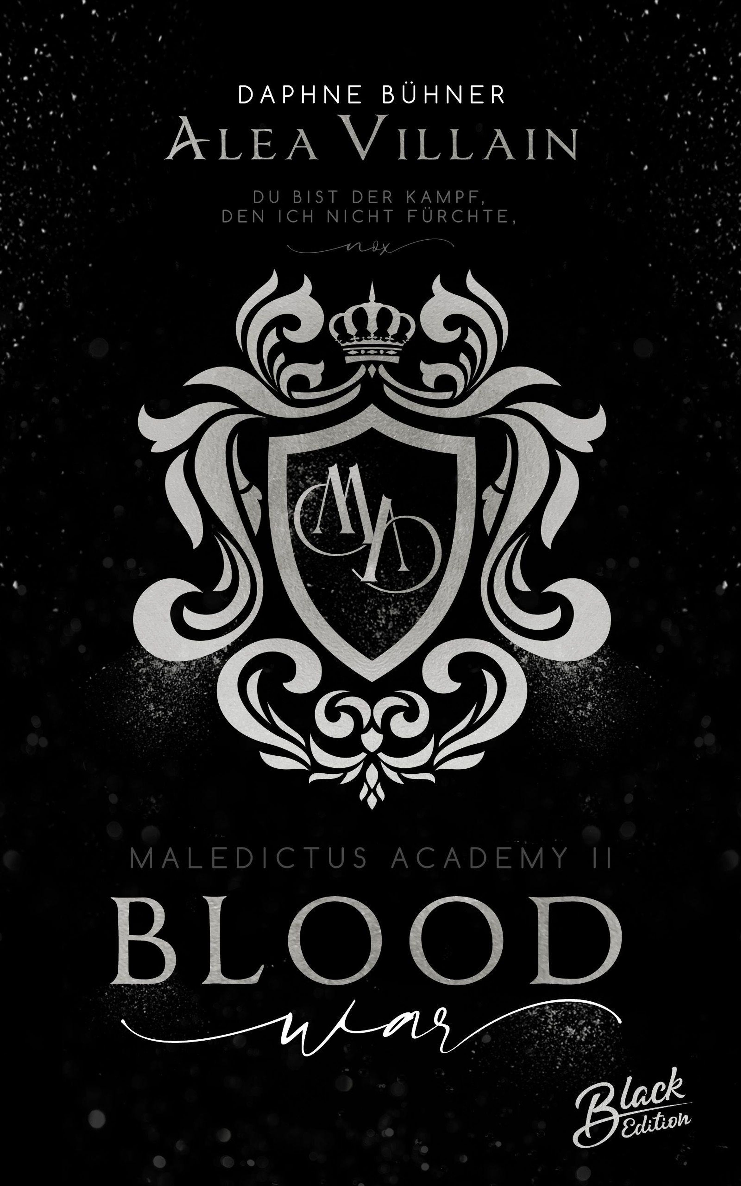 „Daphne Bühner“, „Alea Villain“, „Du bist der Kampf, den ich nicht fürchte“, „Maledictus Academy II“, „Blood War“ mit einem kunstvollen Wappen., Buch