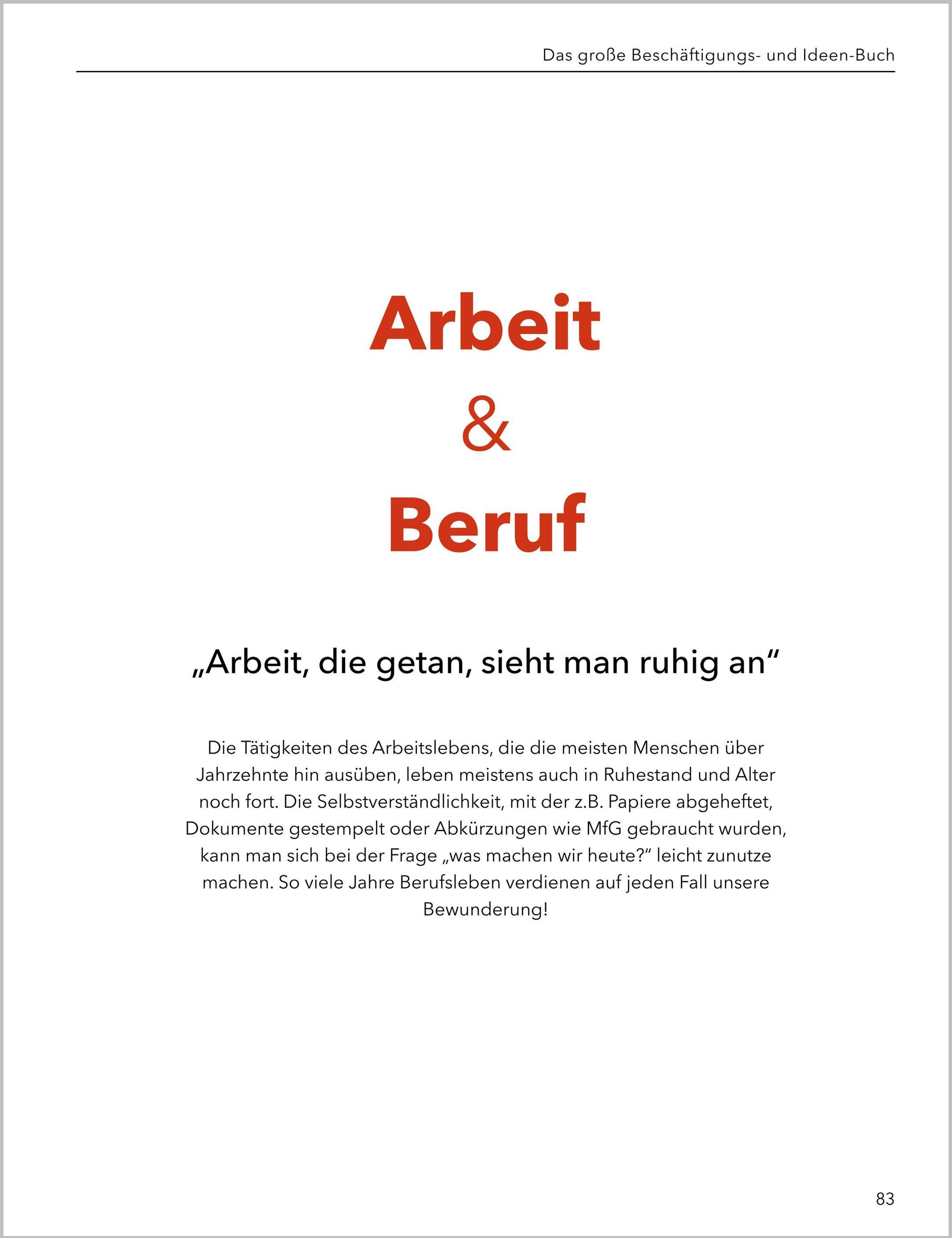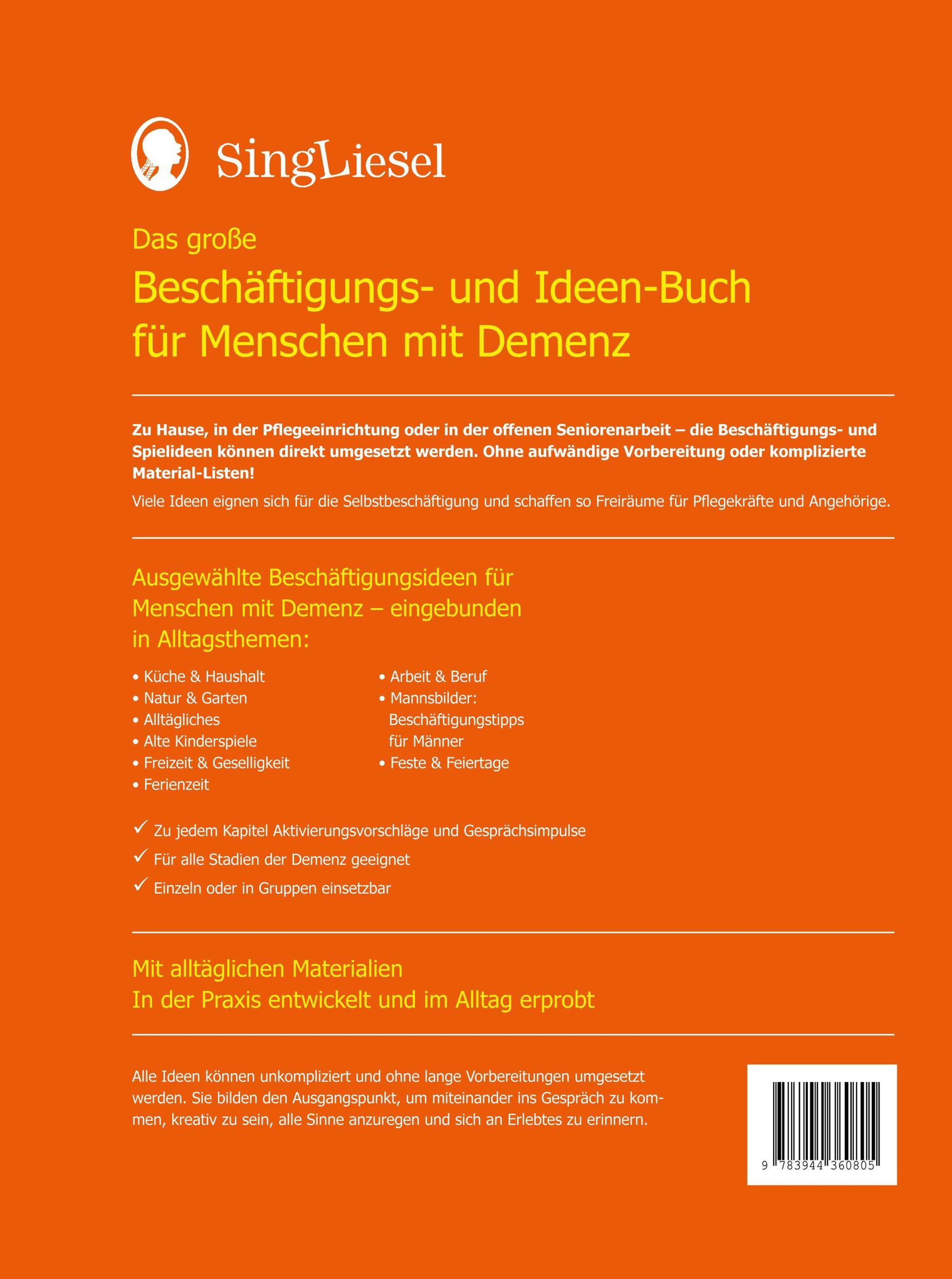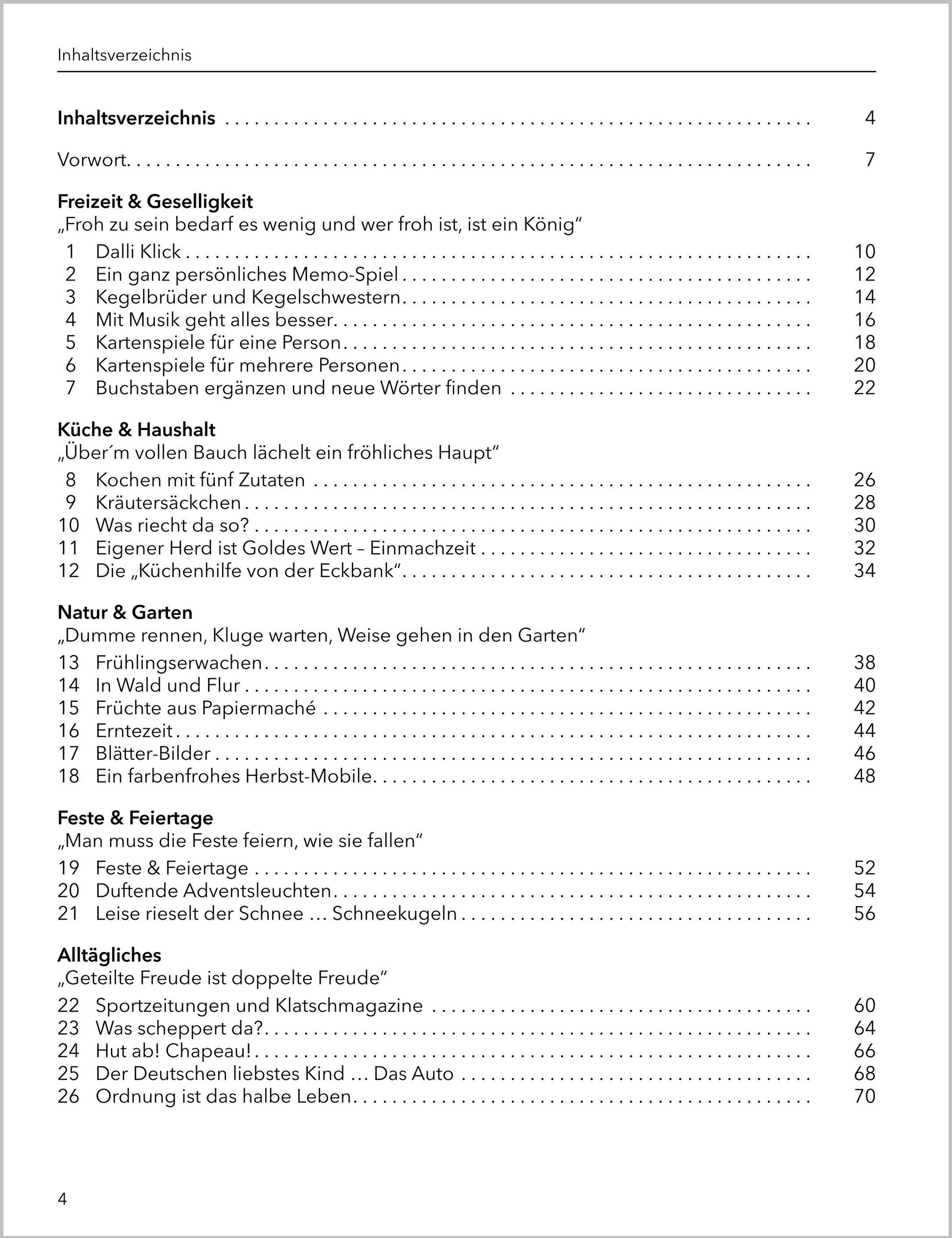 Viele Ideen aus diesem Buch eignen sich für die Selbstbeschäftigung von Menschen mit Alzheimer und anderen Demenzformen und schaffen so Freiräume für Pflegekräfte und Angehörige. Die im Buch vorgestellten Beschäftigungsideen für Menschen mit Demenz sind in Alltagsthemen eingebunden: Küche und Haushalt, Natur und Garten, Alte Kinderspiele, Freizeit und Geselligkeit, Feste und Feiertage, Alltägliches, Ferienzeit, Arbeit und Beruf