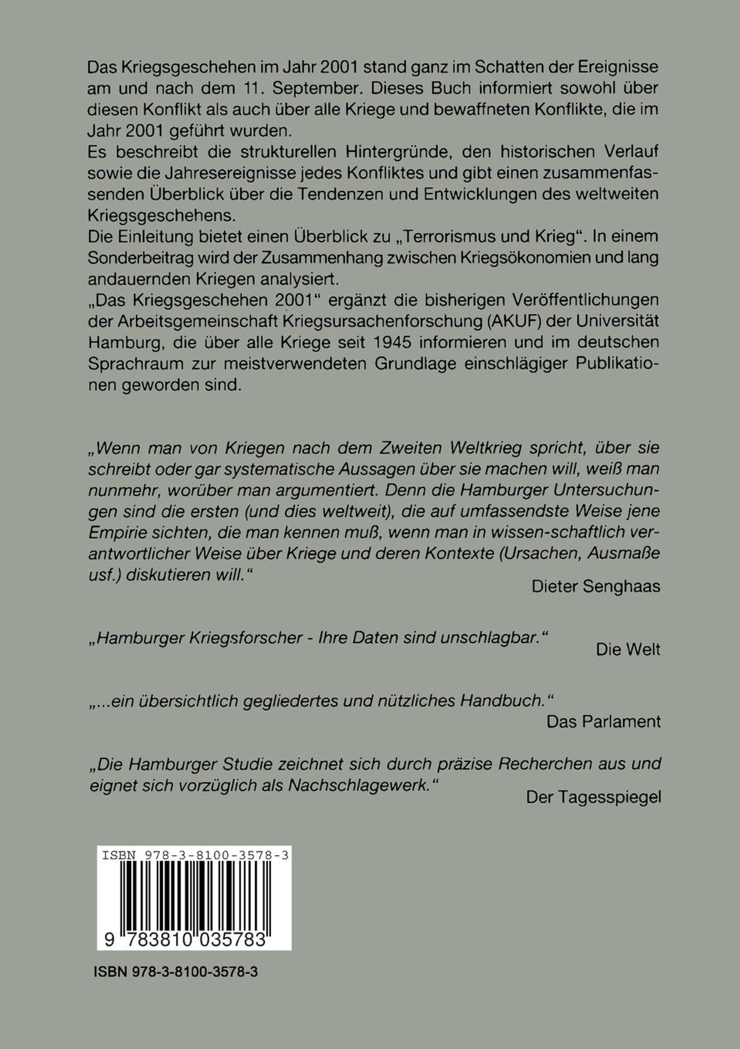 Das Kriegsgeschehen im Jahr 2001 stand ganz im Schatten der Ereignisse am und nach dem 11. September. Dieses Buch informiert sowohl über diesen Konflikt als auch über alle Kriege und bewaffneten Konflikte, die im Jahr 2001 geführt wurden. Es beschreibt die strukturellen Hintergründe, den historischen Verlauf sowie die Jahresereignisse jedes Konfliktes und gibt einen zusammenfassenden Überblick über die Tendenzen und Entwicklungen des weltweiten Kriegsgeschehens. Die Einleitung bietet einen Überblick zu "Terrorismus und Krieg". In einem Sonderbeitrag wird der Zusammenhang zwischen Kriegsökonomien und lang andauernden Kriegen analysiert. "Das Kriegsgeschehen 2001" ergänzt die bisherigen Veröffentlichungen der Arbeitsgemeinschaft Kriegsursachenforschung (AKUF) der Universität Hamburg, die über alle Kriege seit 1945 informieren und im deutschen Sprachraum zur meistverwendeten Grundlage einschlägiger Publikationen geworden sind.
