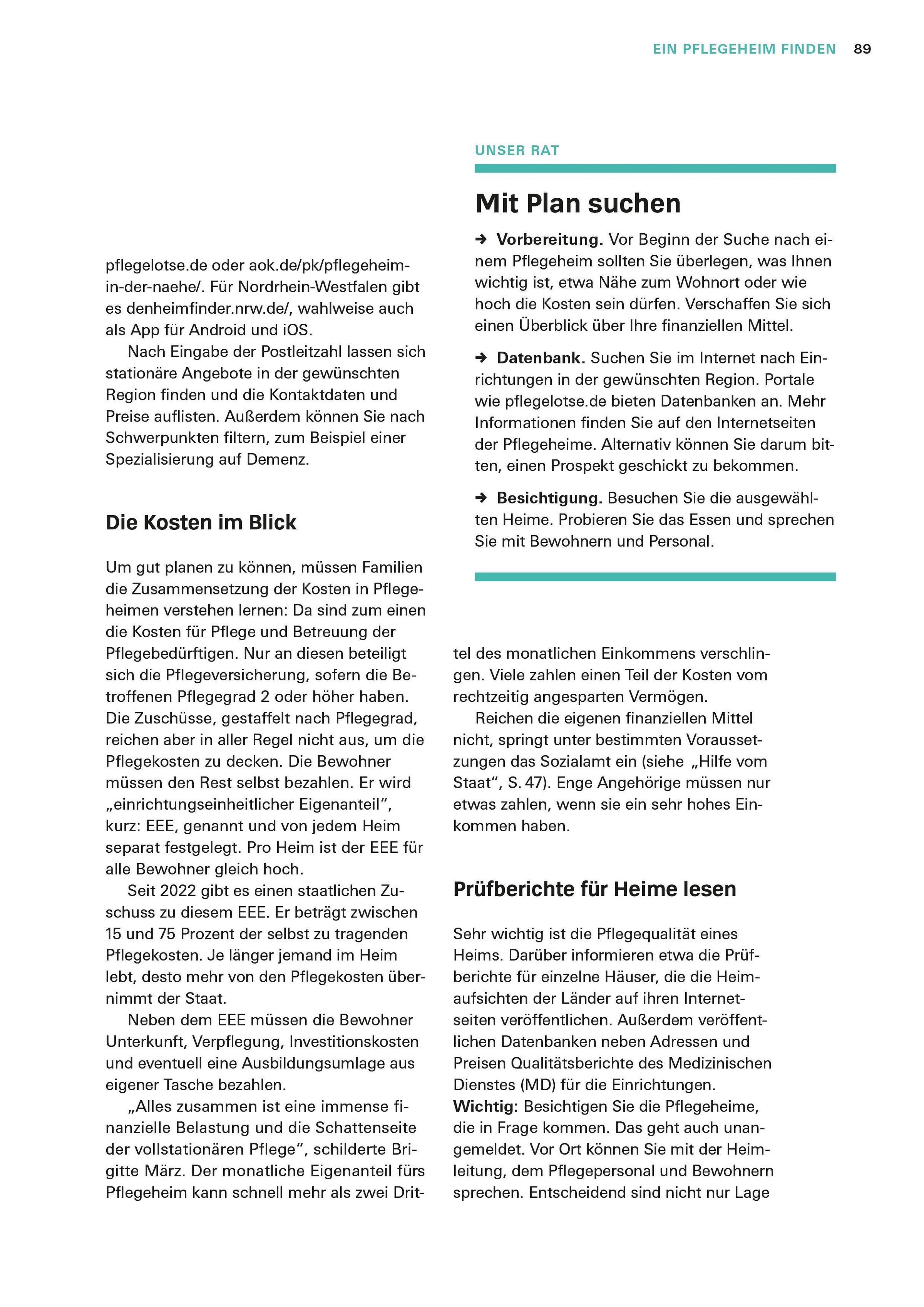 Umso hilfreicher ist ein Ratgeber, der ganz praktische Unterstützung leistet und schnell und übersichtlich Antworten auf die wichtigsten Fragen bietet: Wie lässt sich Pflege organisieren? Wo gibt es finanzielle Unterstützung? Wer berät? Und wie können wir entscheiden, ob wir zu Hause pflegen oder ob ein Pflegeheim die bessere Lösung ist? Welche Alternativen gibt es zum Pflegeheim?