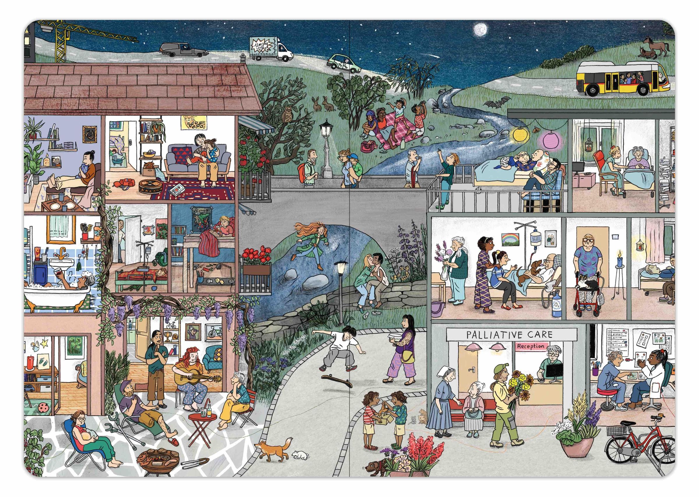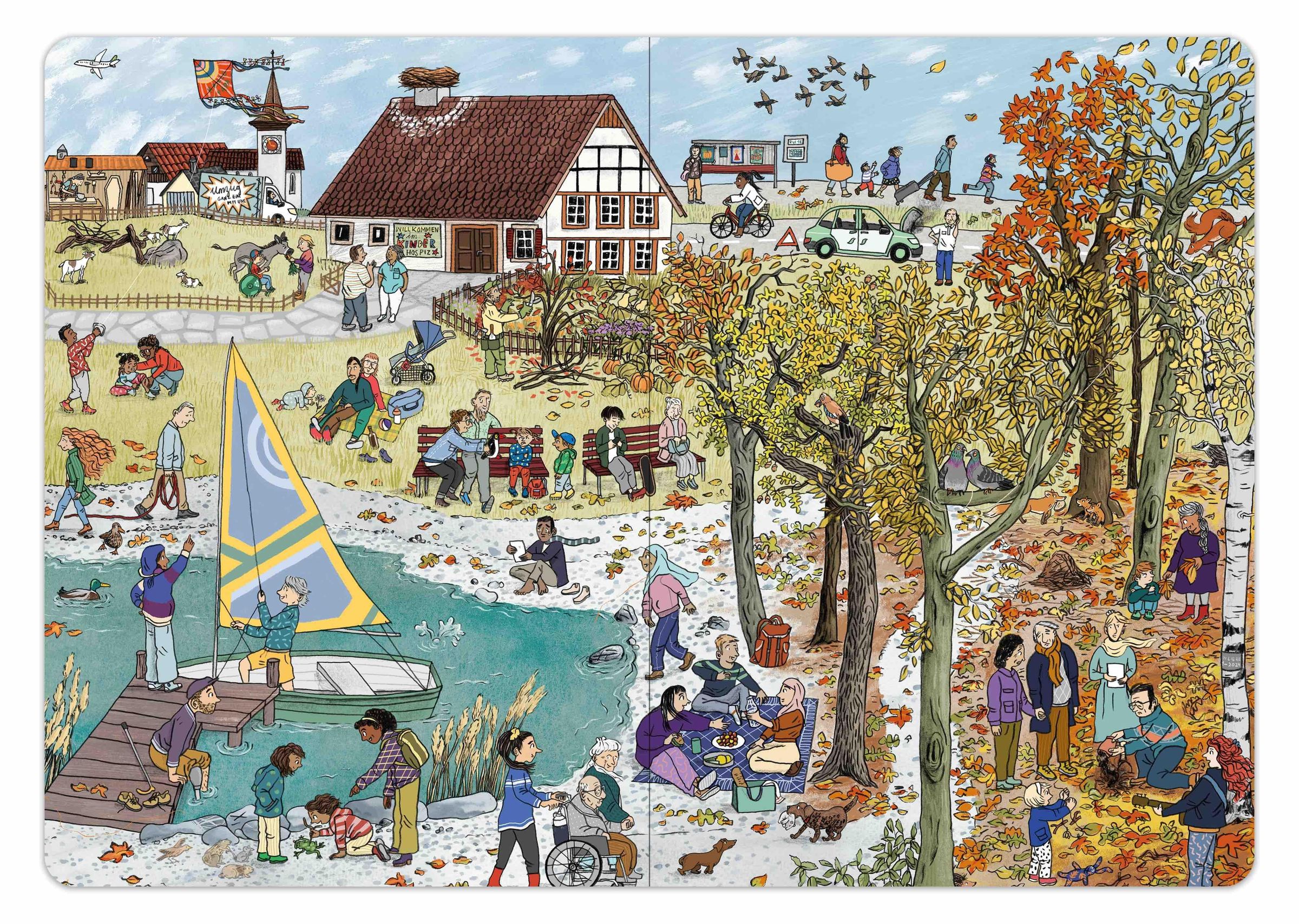 Für Menschen, die einen Verlust erleben, steht die Welt still. Nichts ist mehr so, wie es vorher war, alles steht Kopf, während draussen das normale Leben weiterwimmelt, so als wäre nichts gewesen. Das Wimmelbuch vom Abschiednehmen thematisiert die Gleichzeitigkeit von Leben und Leid und begleitet ganz unterschiedliche Menschen, die einen Abschied verkraften müssen, über ein Jahr hinweg: In den sechs grossformatigen Wimmelbildern durchleben sie inmitten des wuseligen Alltags Phasen und Rituale der Trauer, erfahren dabei auch immer wieder schöne Begegnungen mit ihren Mitmenschen und Momente von Freude, Hoffnung und Trost. Geeignet für die Trauerbegleitung und für alle lebensinteressierten Menschen ab 2 Jahren.