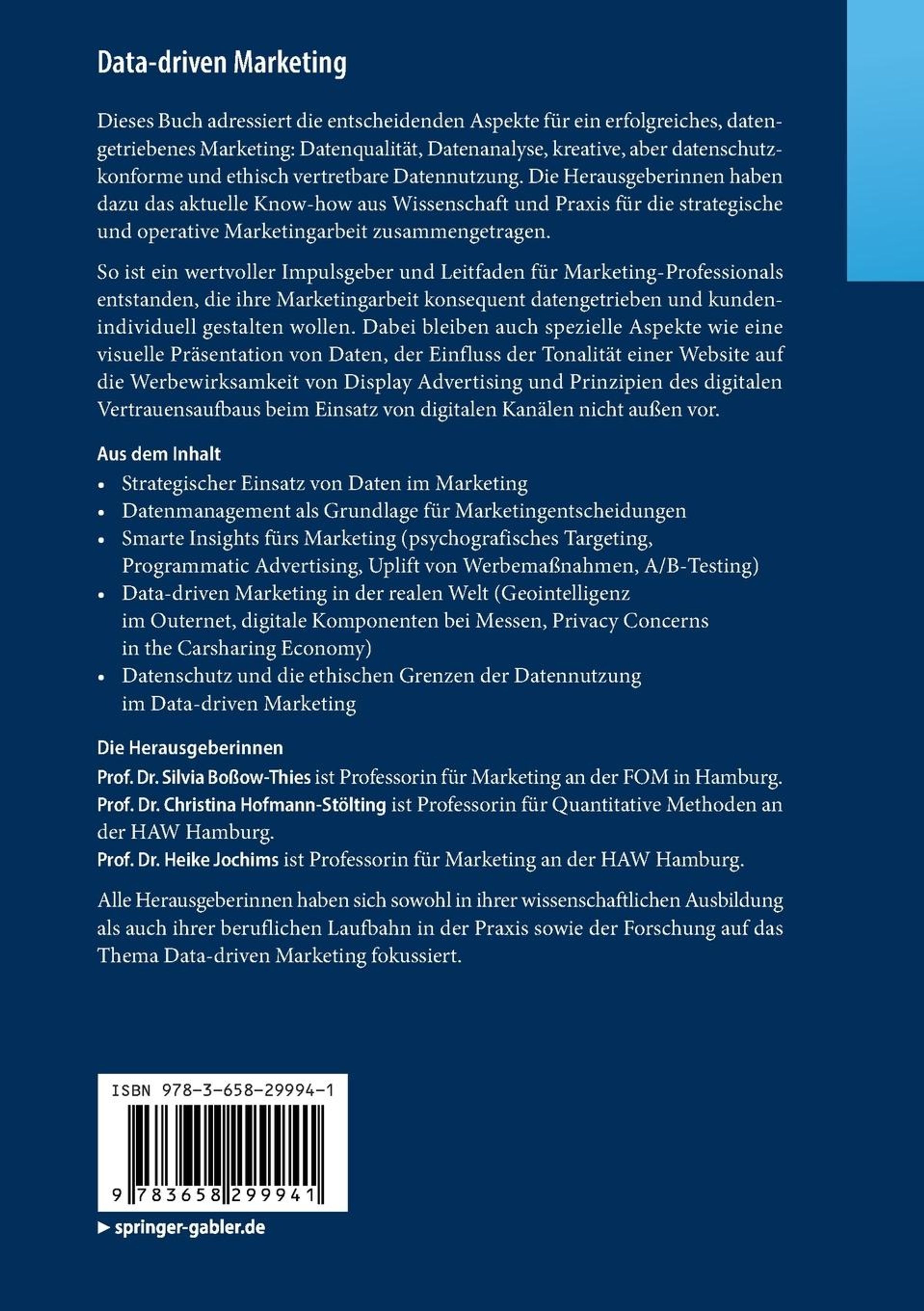 Teil I: Data-driven Marketing im Überblick.- Teil II: Datenmanagement als Grundlage für Marketingentscheidungen.- Teil III: Smarte Insights fürs Marketing.- Teil IV: Praxisbeispiele.- Teil V Datenschutz und Ethik im Data-driven Marketing