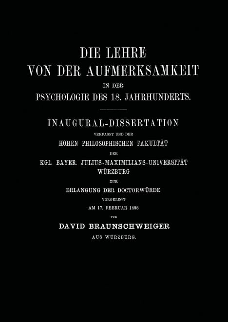Inaugural-Dissertation verfasst und der hohen Philosophischen Fakultät der königlichen Bayerischen Julius-Maximilians-Universität Würzburg zur Erlangung der Doctorwürde vorgelegt am 17. Februar 1898 von David Braunschweiger aus Würzburg. Sorgfältig lektorierter, reprofotografischer Nachdruck der Erstauflage von 1899. Inhalt: Vorwort; Einleitung; 1. Sinnliche und intellectuelle Aufmerksamkeit - Wesen der Aufmerksamkeit; 2. Grade und Eigenschaften der Aufmerksamkeit; 3. Reize der Aufmerksamkeit - Willkürliche und unwillkürliche Aufmerksamkeit; 4. Das physiologische Correlat der Aufmerksamkeit; 5. Wirkungen der Aufmerksamkeit; 6. Verbesserung der Aufmerksamkeit; 7. Verringerung und Verhinderung der Aufmerksamkeit; Schluss; Quellen- und Litteraturverzeichnis; Berichtigungen; Vita