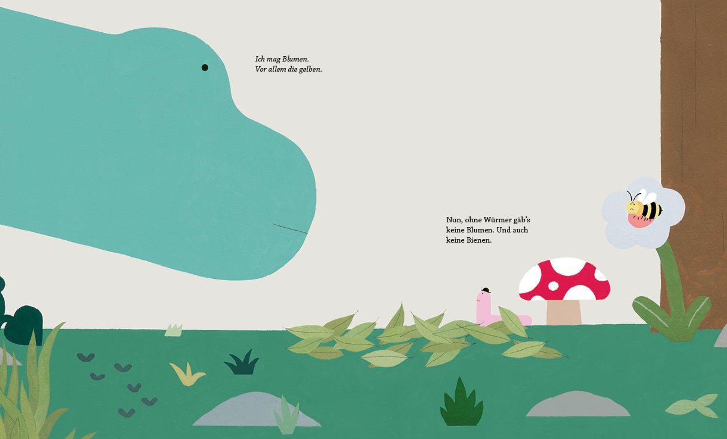 Urkomisch, ehrlich und lebensbejahend erzählt dieses BIlderbuch vom Kreislauf des Lebens: Ist das eine zu Ende, startet gleich ein neues. Der Wurm Toni und ein Dinosaurier lernen sich kennen, als der Riese seinen Fuß versehentlich auf Tonis Kumpel stellt. Toni nimmt den Verlust gelassen. Er und seine Freunde werden den armen Kerl essen. Das machen Würmer so: Sie essen, was tot ist und geben es dem Boden zurück, damit er Neues wachsen lässt. "Dich ess ich auch noch", verkündet Toni dem verblüfften Dino. Aber bis dahin haben die beiden noch eine gute Zeit miteinander. Und wenn es soweit ist, verspricht der Wurm, dann macht er was Schönes aus seinem großen Freund.