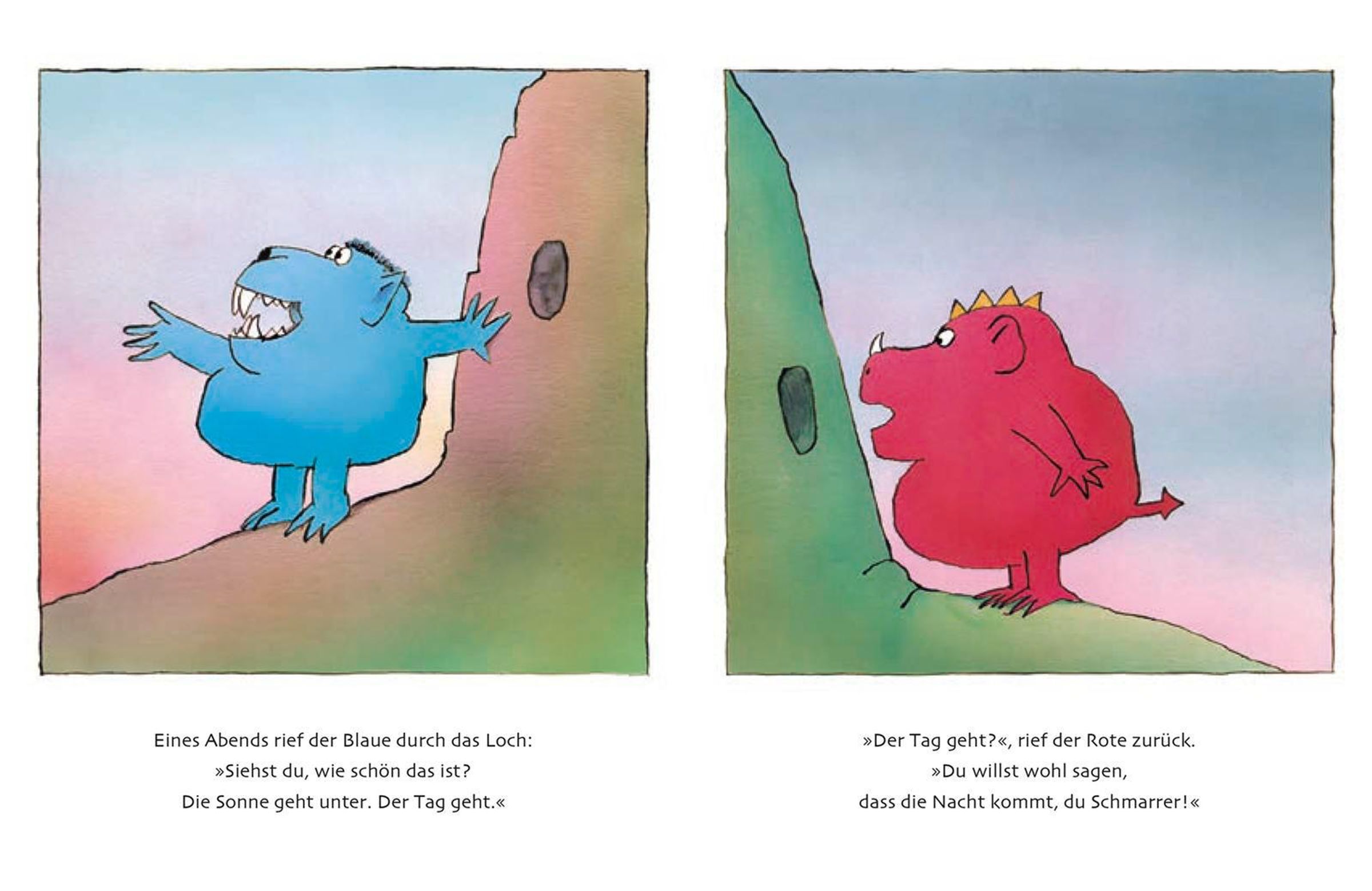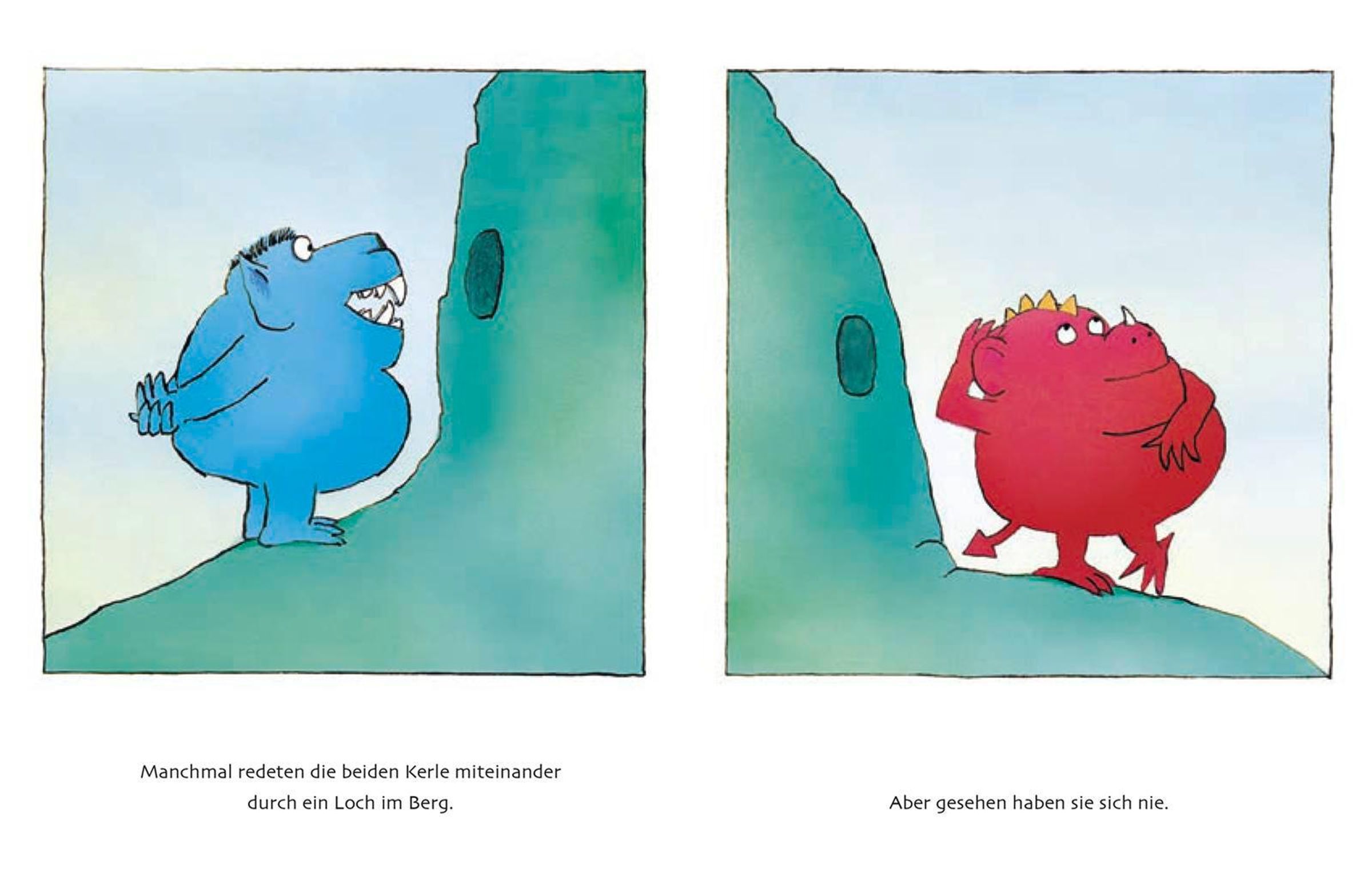 Es war einmal ein blauer Kerl, der lebte an der Westseite eines Berges, wo die Sonne untergeht. Und an der Ostseite, wo die Sonne aufgeht, da lebte ein roter Kerl. Manchmal redeten die beiden miteinander durch ein Loch im Berg. Aber gesehen hatten sie sich noch nie. Und obwohl sich beide kaum kannten, entstand eines Tages ein heftiger Streit. Diese Geschichte ist sicher eines der besten Bücher zum Thema "Streiten" und ein Geschenk für alle, die sich wieder vertragen wollen. Schon 1987 mit dem Deutschen Jugendliteraturpreis ausgezeichnet und immer noch schmerzlich aktuell, gibt es diesen Klassiker nun auch als Pappbilderbuchausgabe.