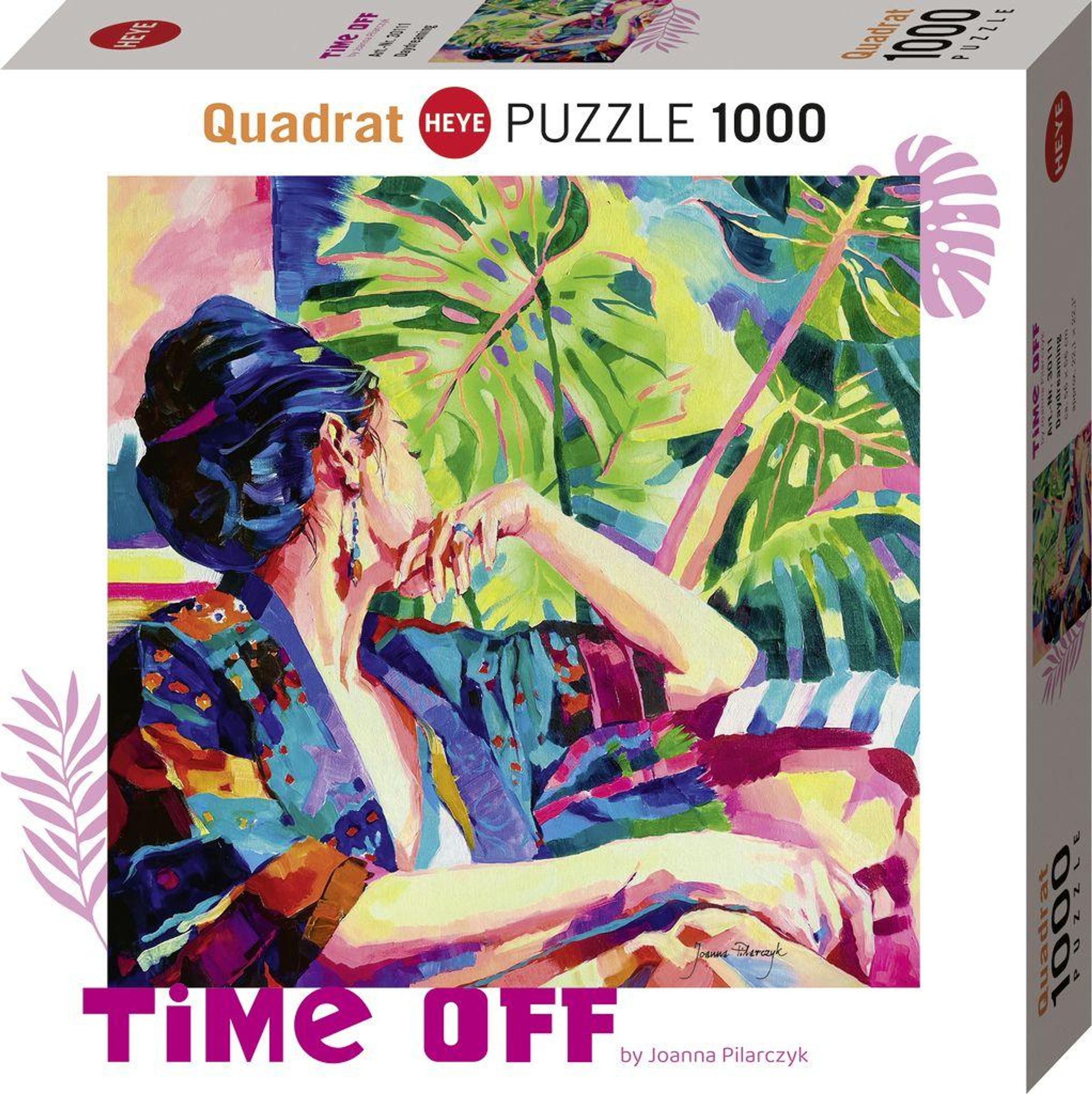 "PUZZLE 1000", "TIME OFF". Buntes, modernes Gemälde einer Frau in tropischer Kulisse, üppiges Blattwerk im Hintergrund., Spiele