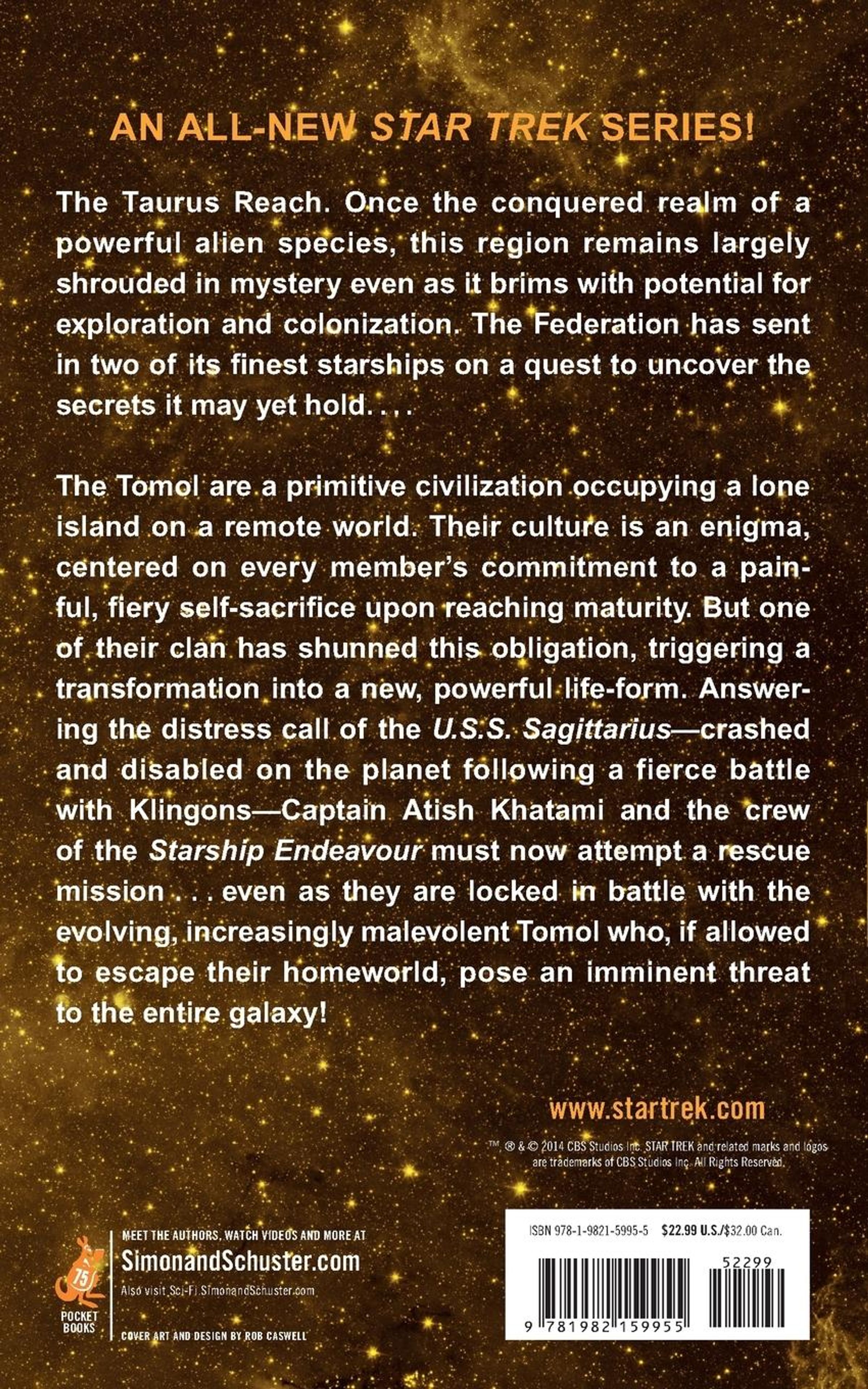 The Tomol are a primitive civilization occupying a lone island on a remote world. Their culture is an enigma, centered on every member's commitment to a painful, fiery self-sacrifice upon reaching maturity. But one of their clan has shunned this obligation, triggering a transformation into a new, powerful life form. Answering the distress call of the U. S.S.Sagittarius--- which has crashed on the planet following a fierce battle with the Klingons---Captain Atish Khatami and the crew of the U. S.S. Endeavour must now attempt a rescue mission...even as they are locked in battle with the evolving, increasingly malevolent Tomol who, if allowed to escape their home world, pose an imminent threat to the entire galaxy.