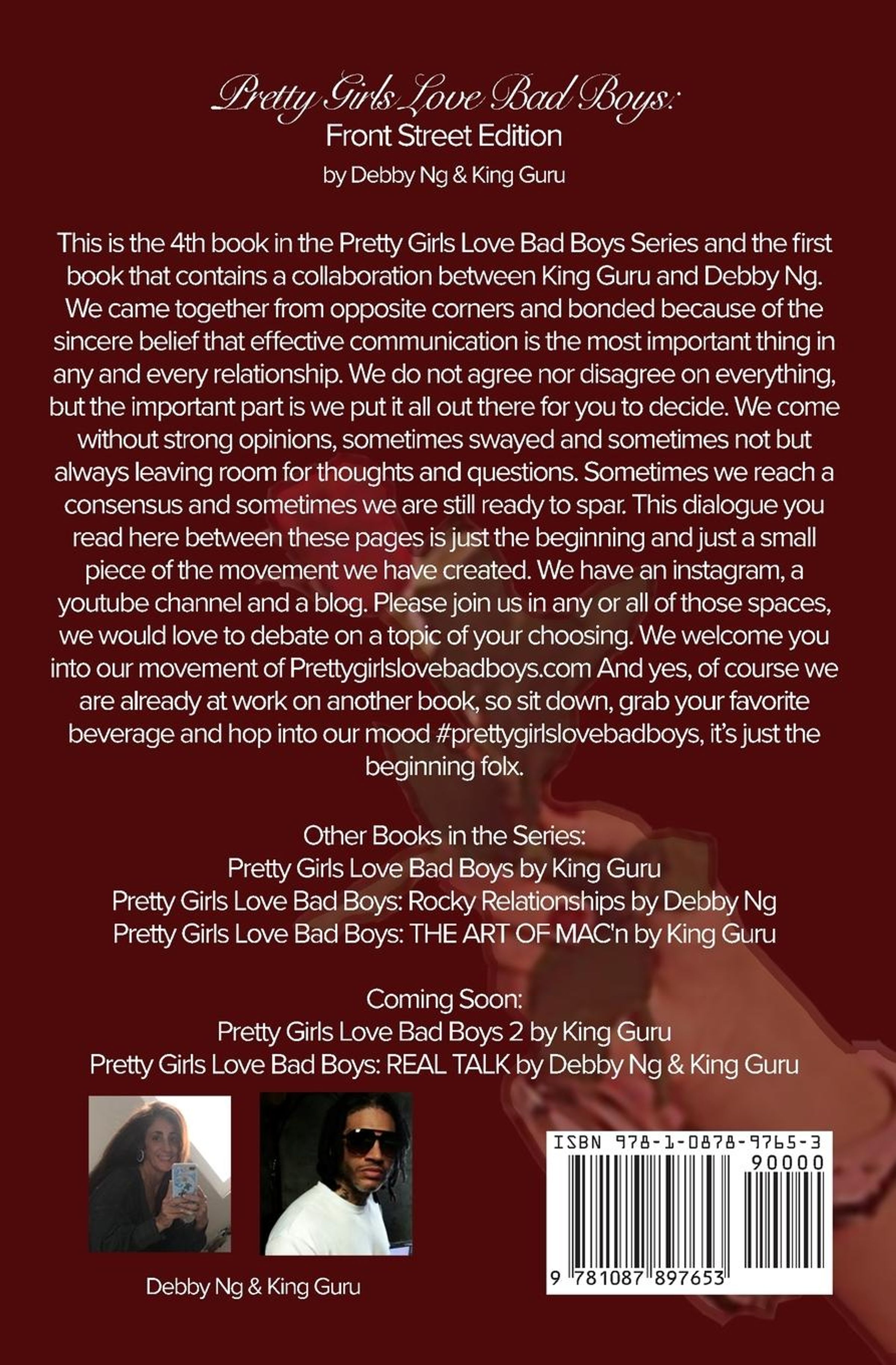 Pretty Girls Love Bad Boys: FRONT STREET EDITION This is the 4th book in the Pretty Girls Love Bad Boys Series and the first book that contains a collaboration between King Guru and Debby Ng. We came together from opposite corners and bonded because of the sincere belief that effective communication is the most important thing in any and every relationship. We do not agree nor disagree on everything, but the important part is we put it all out there for you to decide. We come without strong opinions, sometimes swayed and sometimes not but always leaving room for thoughts and questions. Sometimes we reach a consensus and sometimes we are still ready to spar. This dialogue you read here between these pages is just the beginning and just a small piece of the movement we have created. We have an instagram, a youtube channel and a blog. Please join us in any or all of those spaces, we would love to debate on a topic of your choosing. We welcome you into our movement of Prettygirlslovebadboys. com And yes, of course we are already at work on another book, so sit down, grab your favorite beverage and hop into our mood #prettygirlslovebadboys, it's just the beginning folx.