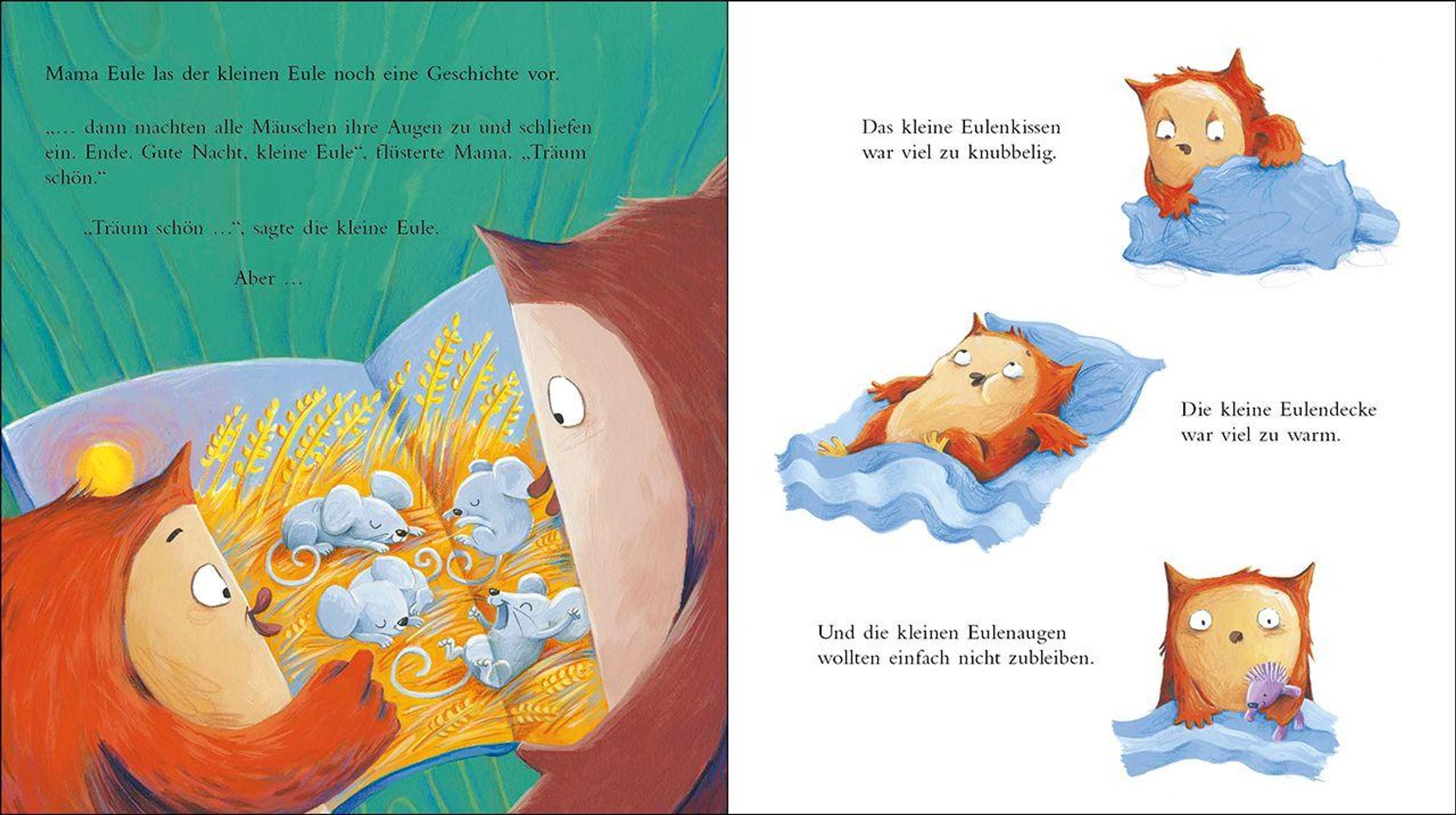 "Süße Träume, kleine Eule." Es ist schon spät, aber die kleine Eule will einfach noch nicht schlafen. Mama soll ihr lieber noch eine Geschichte vorlesen! Doch auch das hilft nicht, denn das Eulenkissen ist viel zu knubbelig und die Eulendecke viel zu warm. Und dann ist plötzlich auch noch ihr Kuscheltier verschwunden! Wie soll die kleine Eule denn jetzt nur einschlafen? Aber dann verrät Mama ihr ein Geheimnis: Wenn die kleine Eule jetzt ihre Augen zu macht, ist viel schneller morgen. Und morgen haben sie doch etwas Großes vor ...