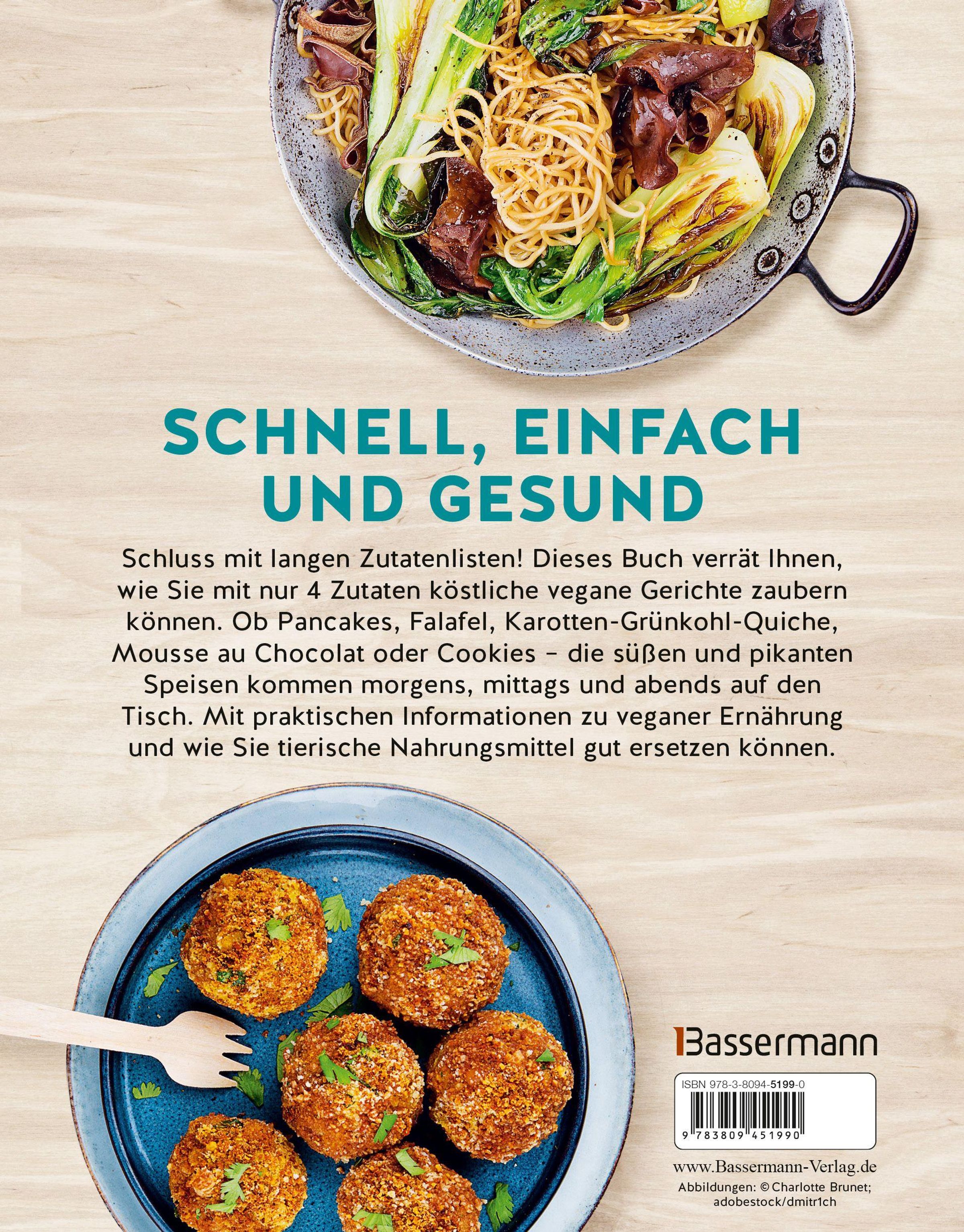 Schluss mit langen Zutatenlisten! Die veganen Gerichte aus diesem Buch zeigen mit nur 4 Zutaten kreative und köstliche Geschmackskombinationen. Pancakes, Falafel, Karotten-Grünkohl-Quiche, Spaghetti "Bolognese", Mousse au Chocolat, Kekse - die süßen und pikanten Gerichte kommen morgens, mittags und abends auf den Tisch. Mit praktischen Informationen zu veganer Ernährung und wie man tierische Nahrungsmittel gut ersetzen kann - ohne Geschmacksverlust.