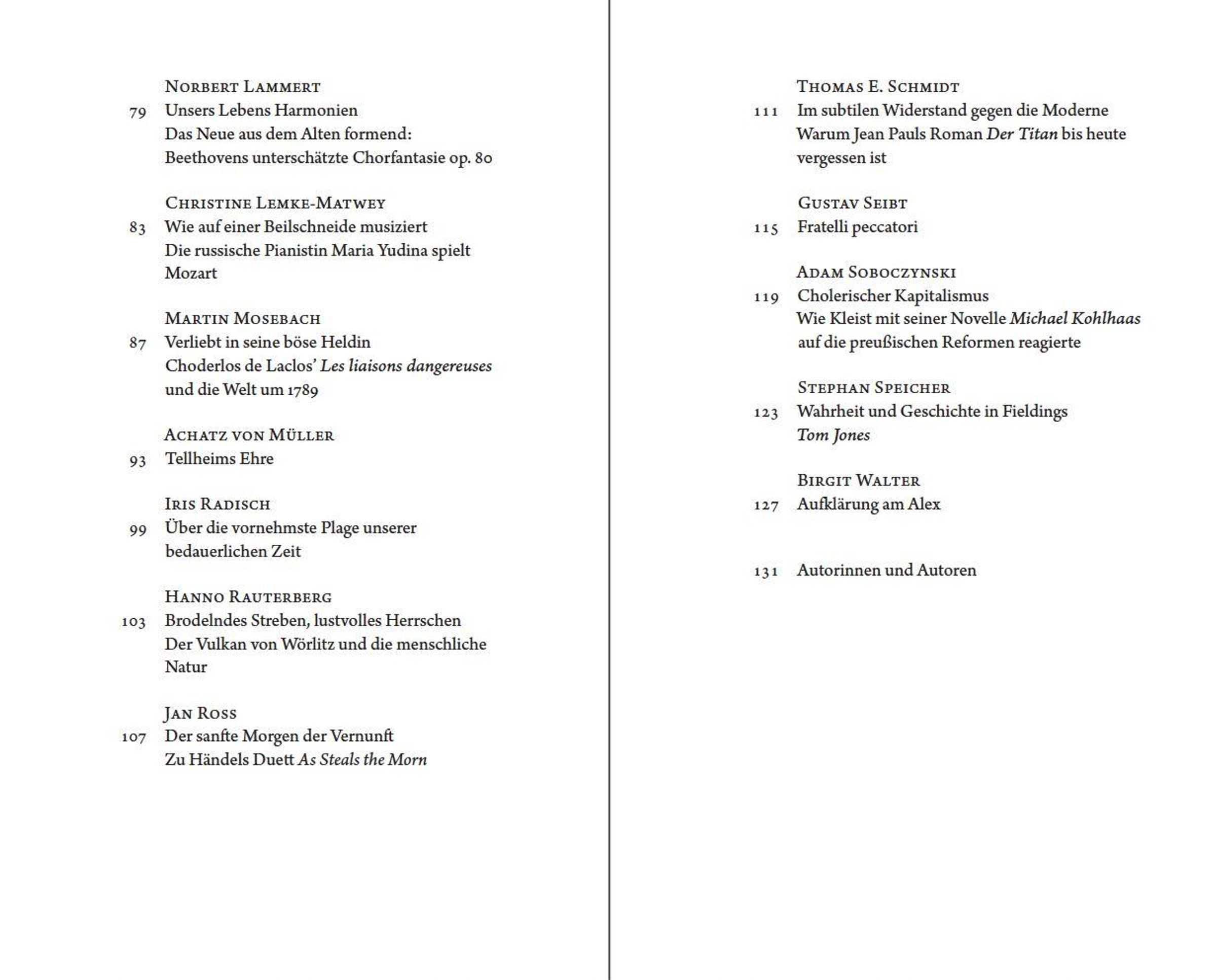 Heiterkeit, Esprit und scharfe Kritik, Seelenkunde und Mitgefühl kennzeichnen das geistige 18. Jahrhundert. Die Beiträge des Bandes widmen sich diesem Zeitraum und seinem Nachwirken; Musik, Literatur, Kunst, Geschichte und Denken haben ihre Auftritte. Sein Titel geht auf Wolf von Niebelschütz' 1949 erschienenen Roman 'Der Blaue Kammerherr' zurück, der das gesellschaftliche und kulturelle Niveau jener aufgeklärten Modellepoche formulierte.