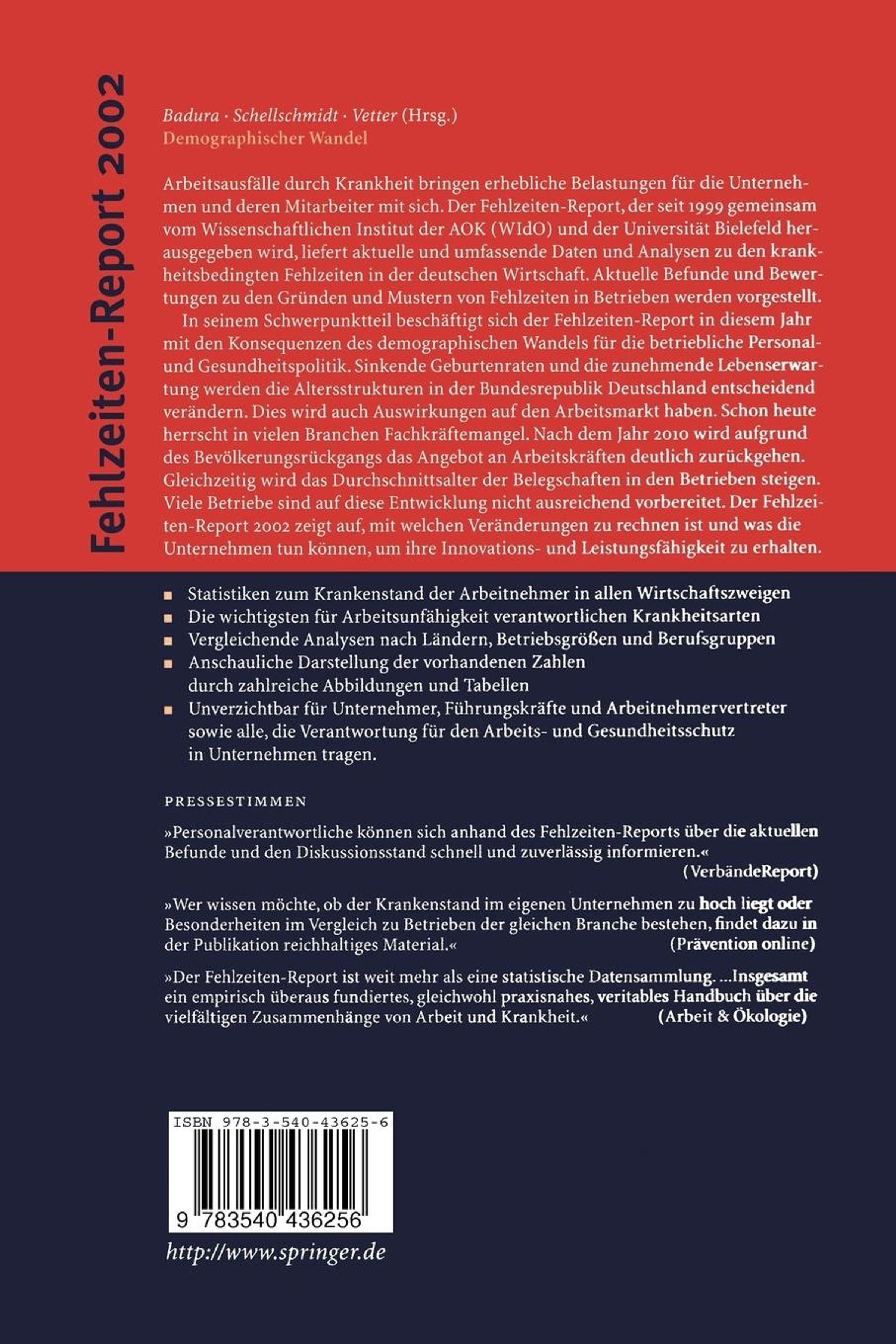 Der Report liefert umfassende und differenzierte Daten zu den krankheitsbedingten Fehlzeiten in der deutschen Wirtschaft. Er zeigt Gründe und Auslöser von Fehlzeiten in Betrieben auf, bietet Vergleichsmöglichkeiten mit Mitbewerbern und Grundlagen für eigene Lösungsansätze. Diesjähriges Schwerpunkt-Thema: "Demographischer Wandel". "Der Fehlzeiten-Report ist weit mehr als eine statistische Datensammlung. ...Insgesamt ein empirisch überaus fundiertes, gleichwohl praxisnahes, veritables Handbuch über die vielfältigen Zusammenhänge von Arbeit, Gesundheit und Krankheit..." (Arbeit & Ökologie)