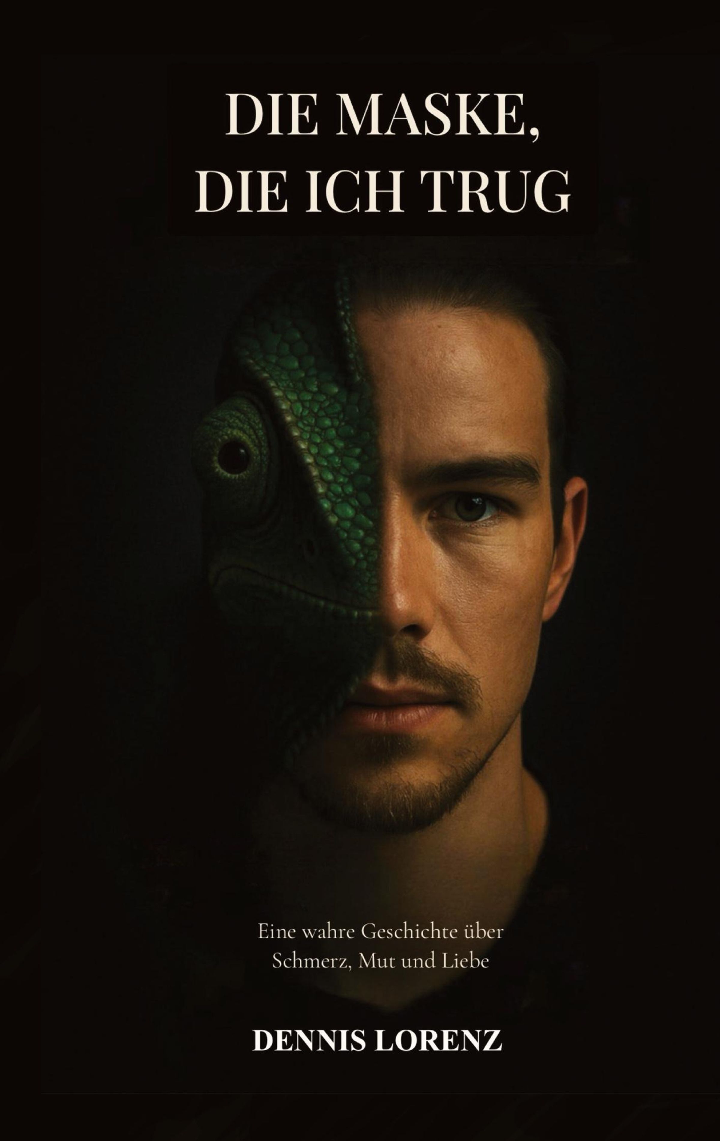 "Die Maske, die ich trug"; Untertitel: "Eine wahre Geschichte über Schmerz, Mut und Liebe"; Autor: Dennis Lorenz. Gesicht halb Mensch, halb Chamäleon., Buch