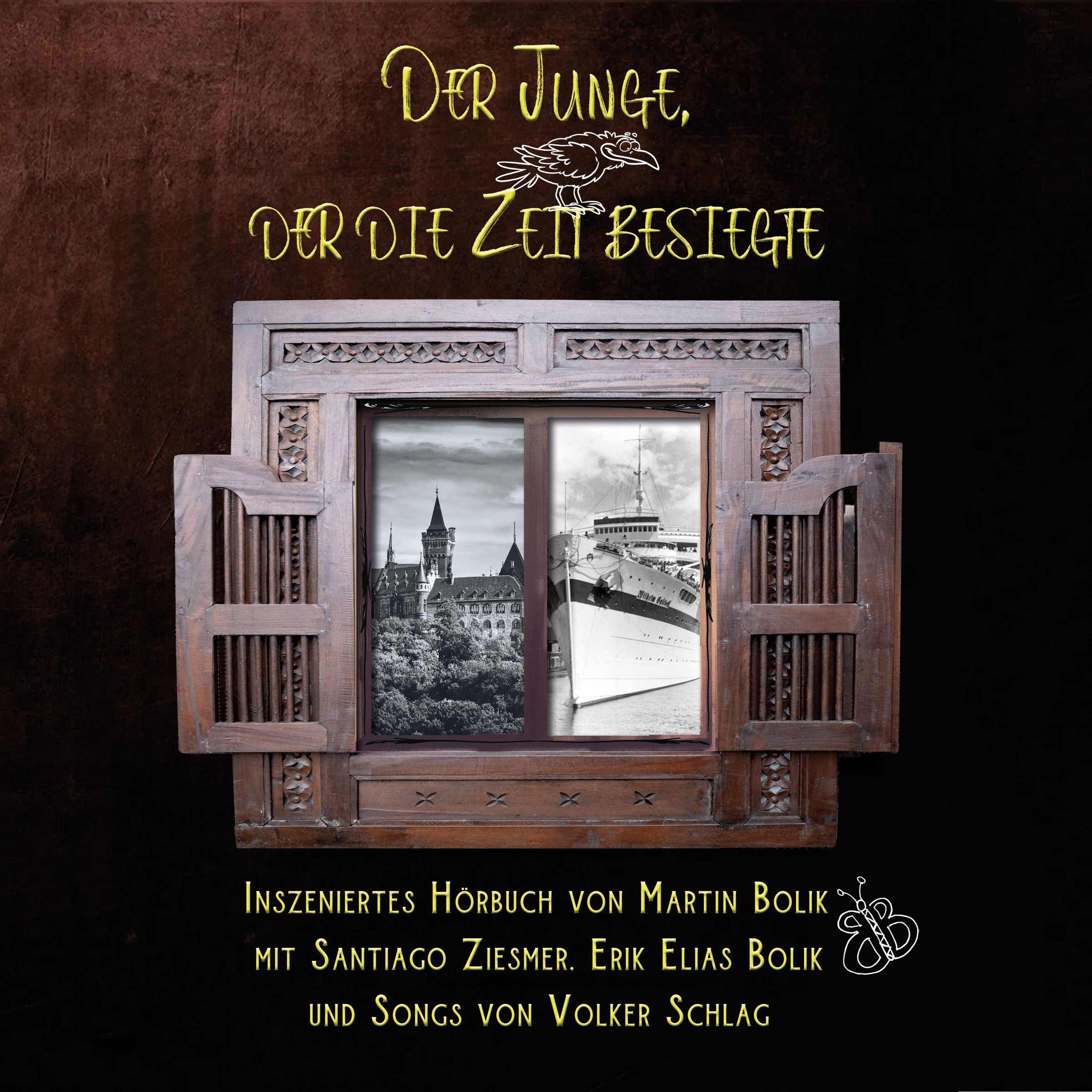 „Der Junge, der die Zeit besiegte“. Schwarz-weißes Fensterbild von einem Schloss und einem Schiff darunter., MP3-CD