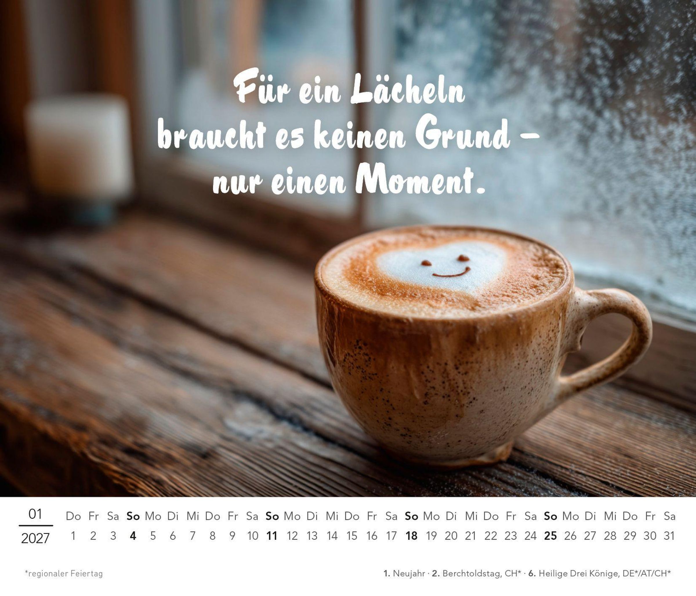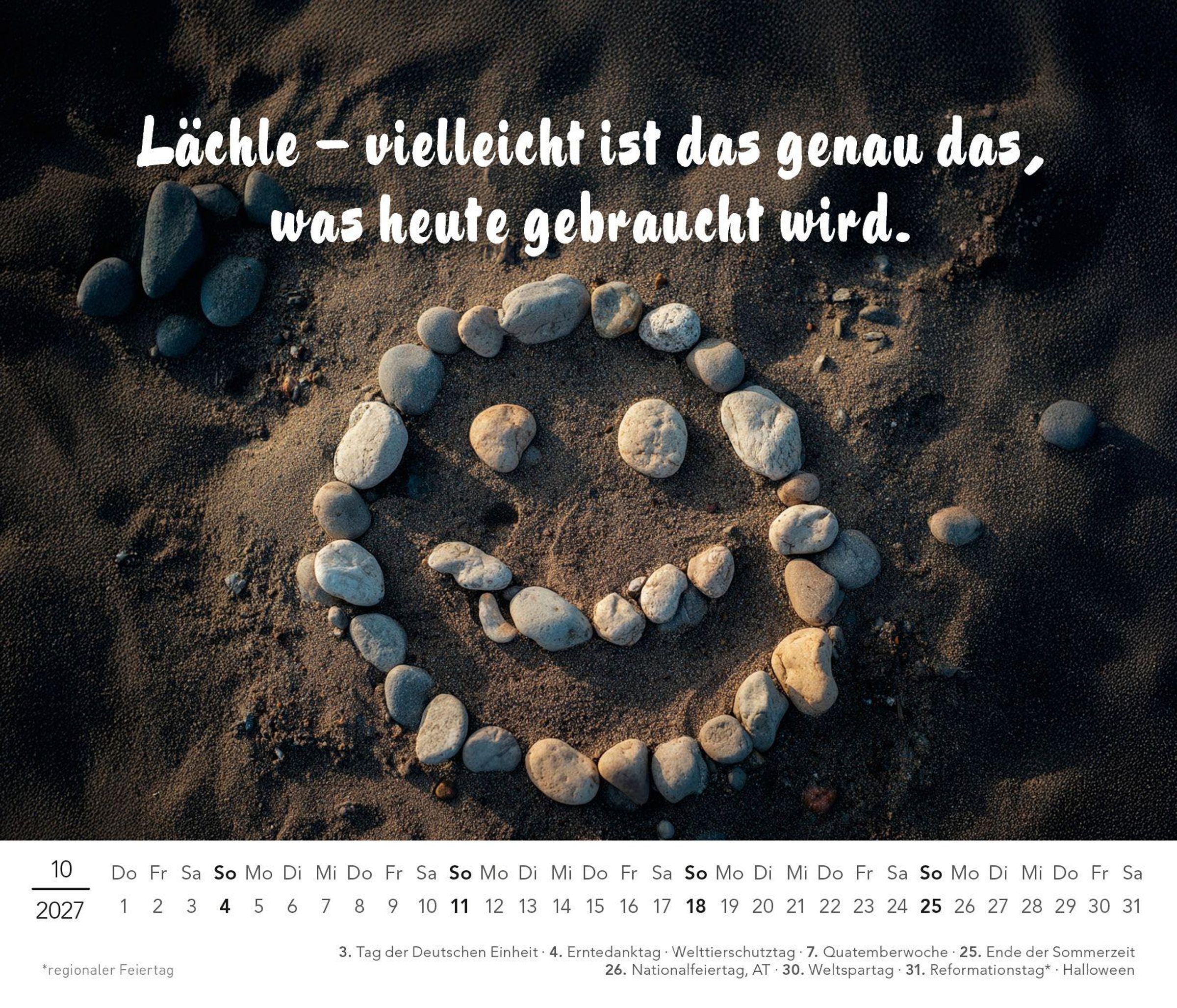 Bringen Sie Freude und positive Energie in Ihren Alltag mit dem „Der kleine Kalender zum Lächeln 2027". Dieser charmante Tischaufstellkalender zaubert Ihnen mit 12 fröhlichen Motiven und aufmunternden Sprüchen Monat für Monat ein Lächeln ins Gesicht.