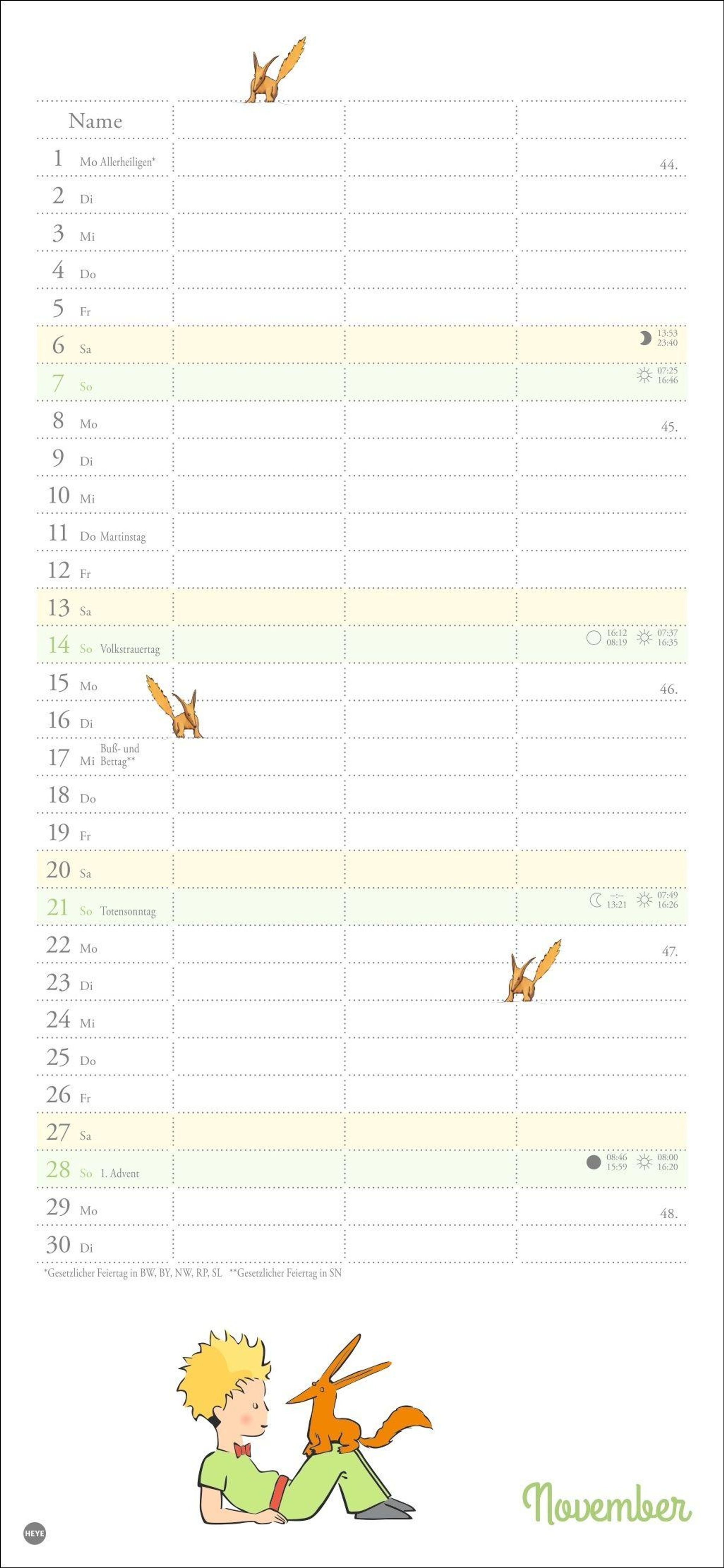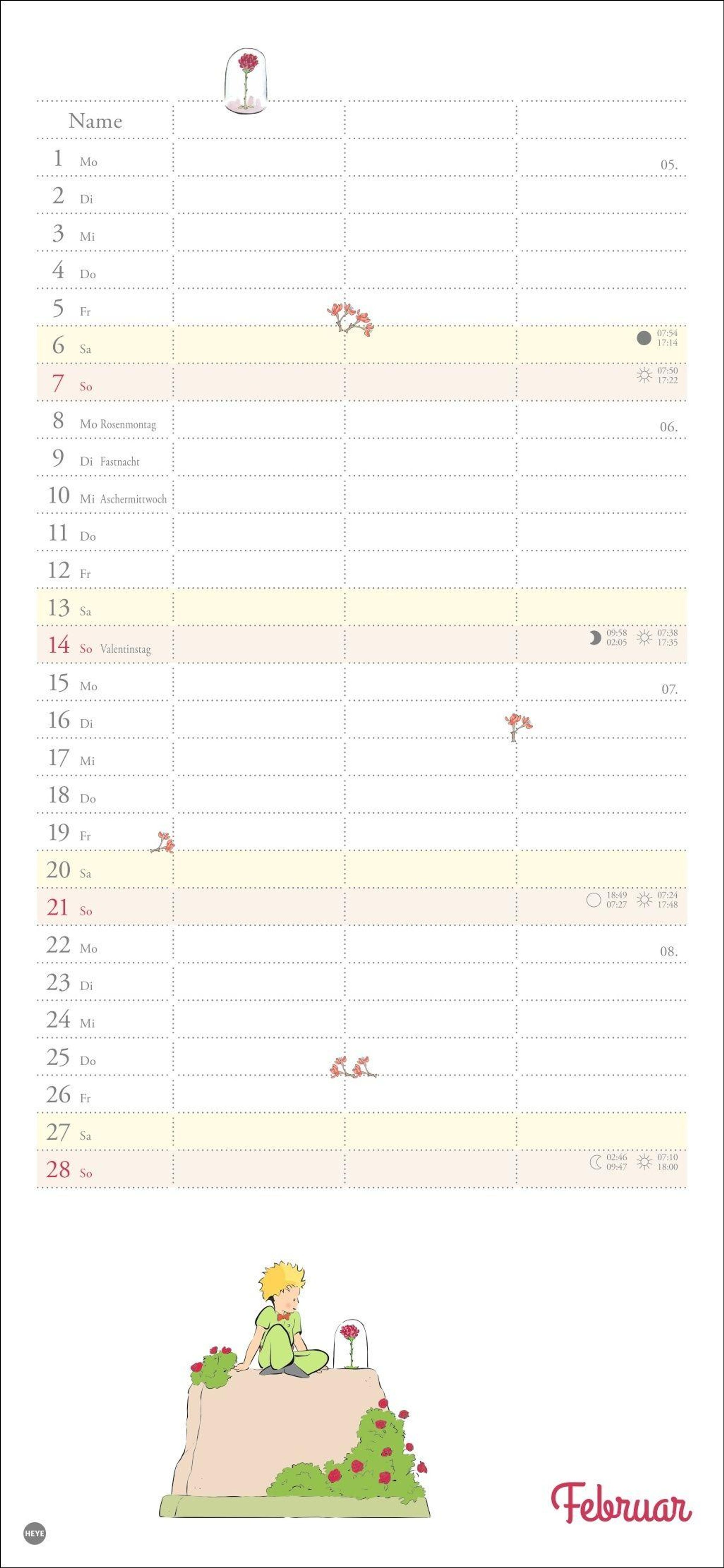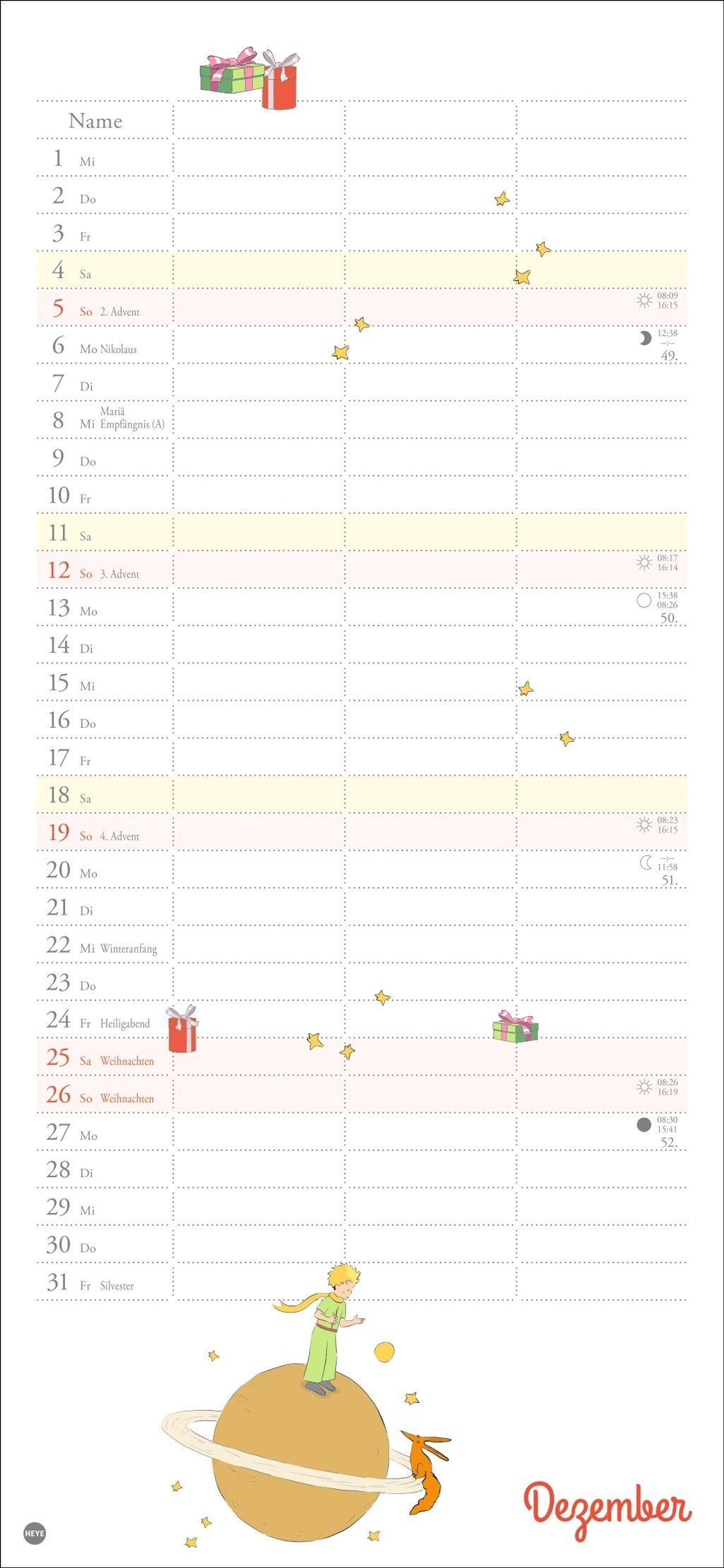 Mit Rose, Fuchs und dem kleinen Prinzen immer den Überblick bewahren: Der praktische Wandkalender mit drei Spalten Platz für alle Eintragungen, die wichtig sind