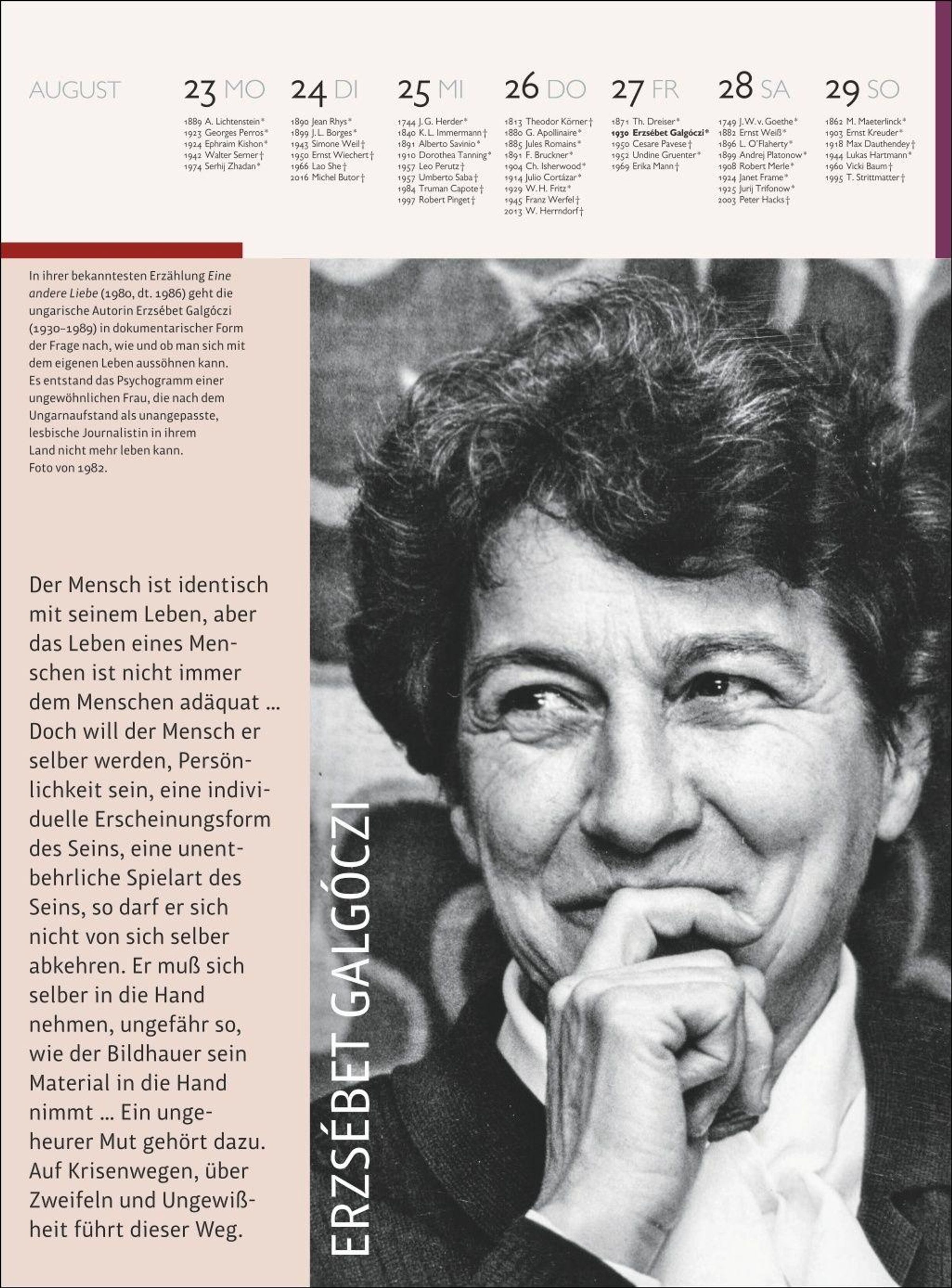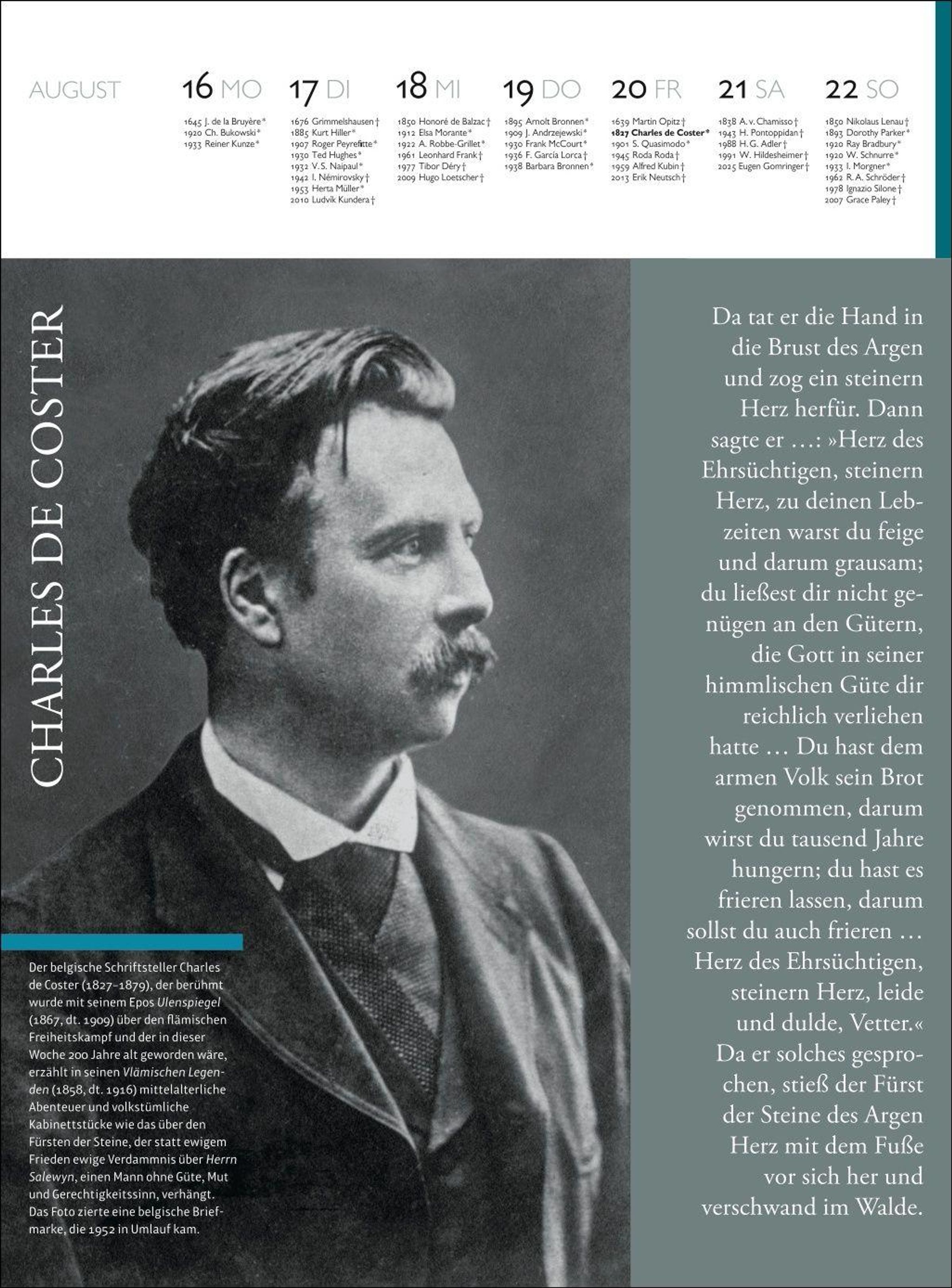 Ein Wandkalender, der Woche für Woche begeistert: Mit unbekannten Fotos, ausführlichen Bild- und Textinfos, Kurzbiografien und einem aktualisierten Kalendarium ist der Literatur Kalender 2027 nach wie vor für treue wie neue Leserinnen und Leser ein unbedingtes Muss.