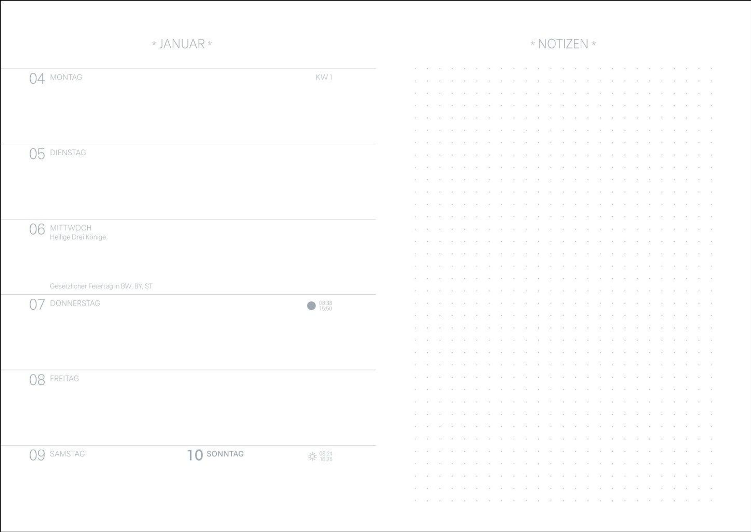 Terminkalender im DIN A5-Format für den stilvollen Überblick: Wochenübersicht mit viel Raum für Notizen und Extraseiten für Organisatorisches