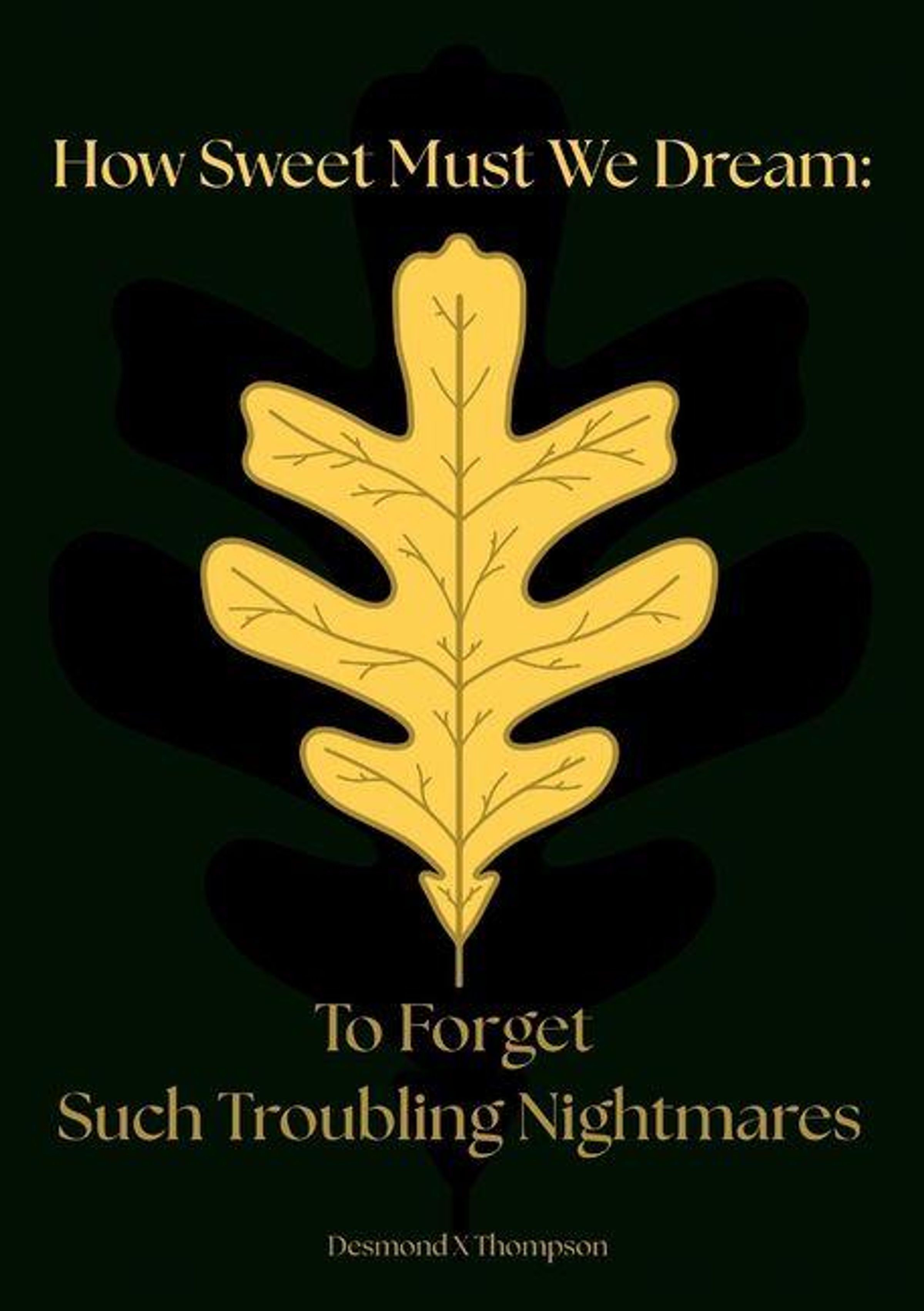 „How Sweet Must We Dream: To Forget Such Troubling Nightmares“ über einem stilisierten gelben Blatt auf dunklem Hintergrund., Buch