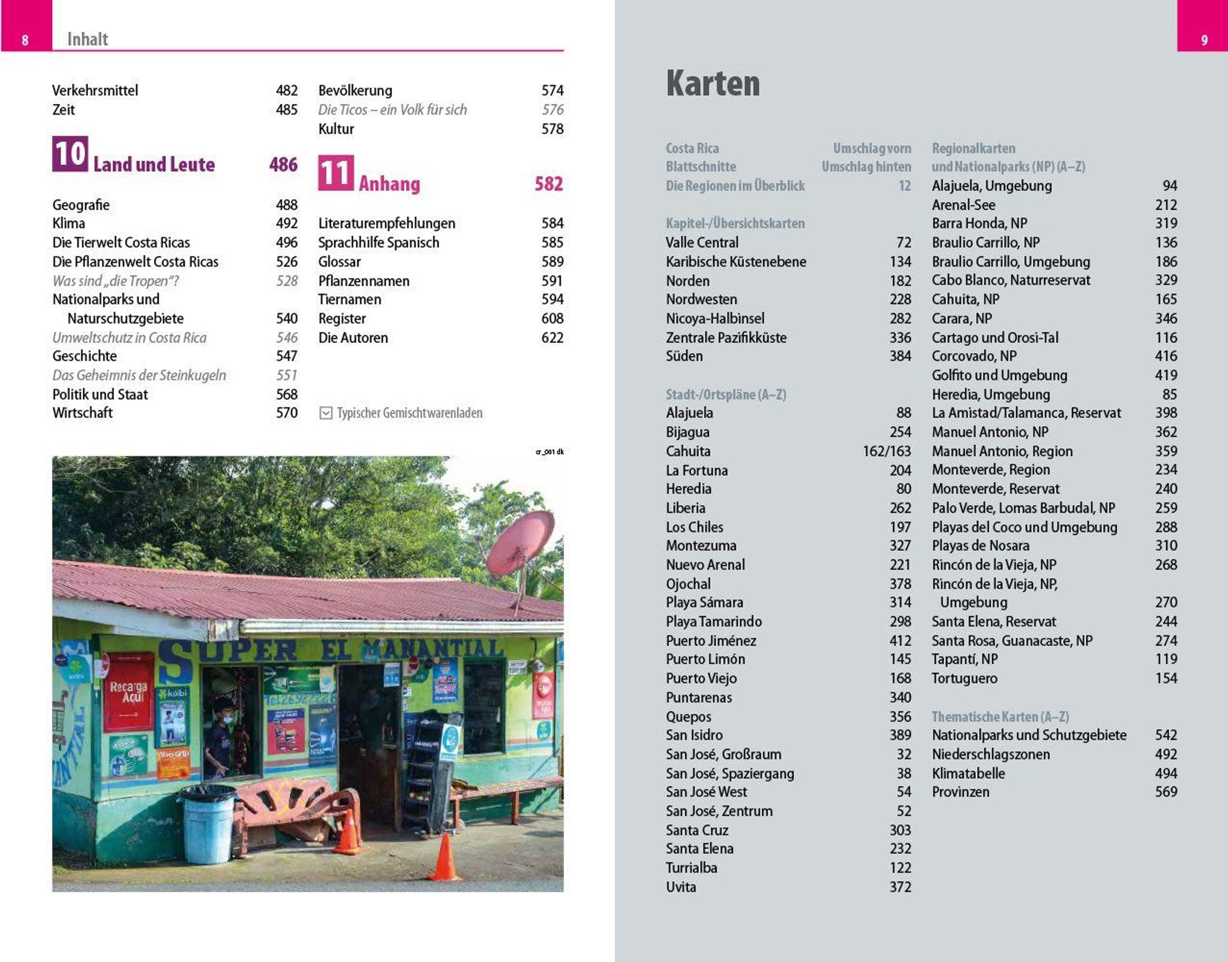 Übersichtsseiten mit den bedeutendsten Regionen im Überblick: San José, Valle Central, Karibik, der Norden, der Nordwesten, die Halbinsel Nicoya, die zentrale Pazifikküste und der Süden