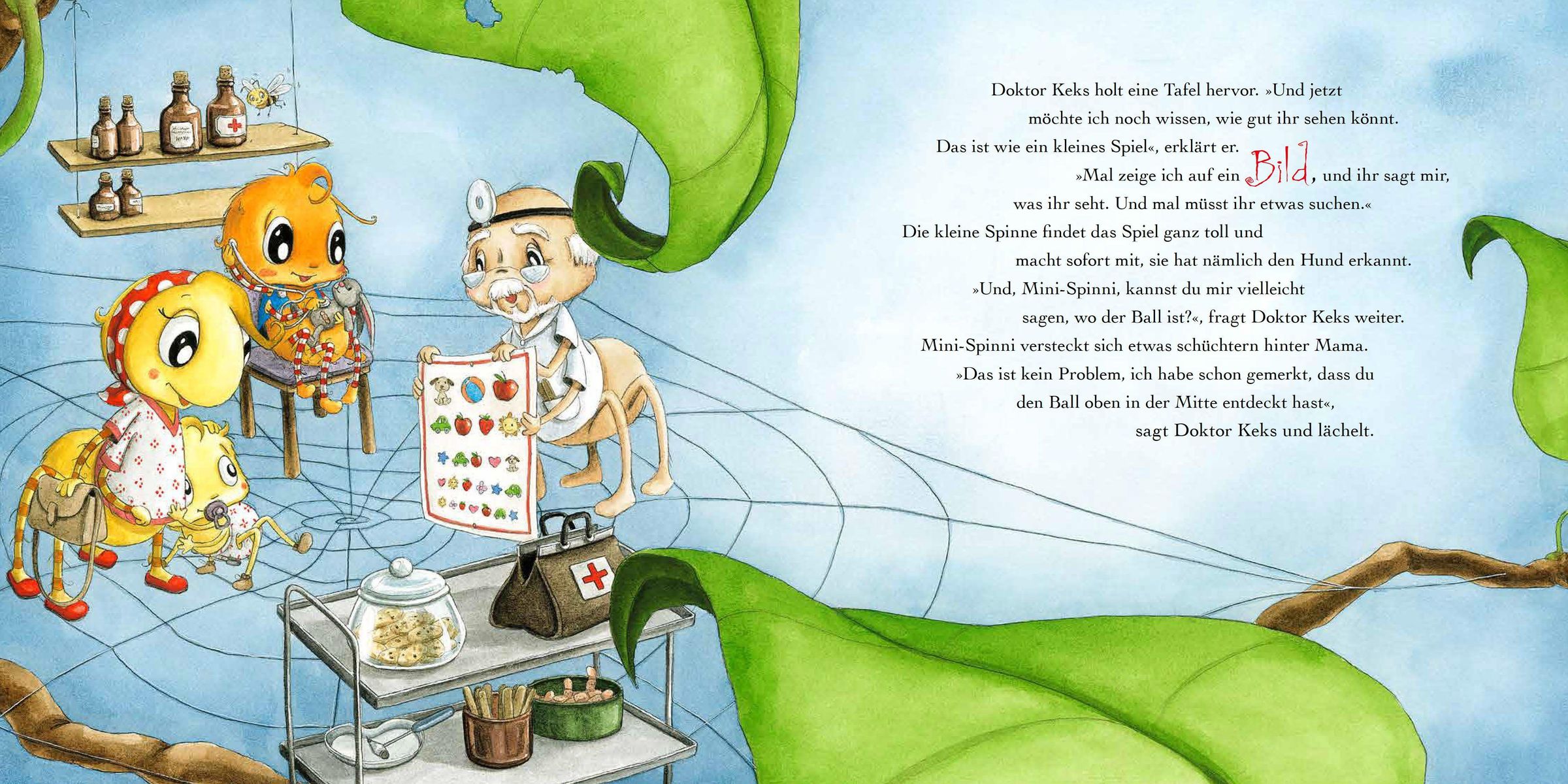 Die kleine Spinne ist ganz aufgeregt. Heute besuchen sie und Mini-Spinni den Doktor, um sich untersuchen zu lassen. Sie werden gemessen und gewogen, machen einen Sehtest und erfahren sogar, wie ein Stethoskop funktioniert. Das ist nicht nur richtig spannend, dabei merken sie vor allem eines: Vor Dr. Keks braucht keiner Angst zu haben!