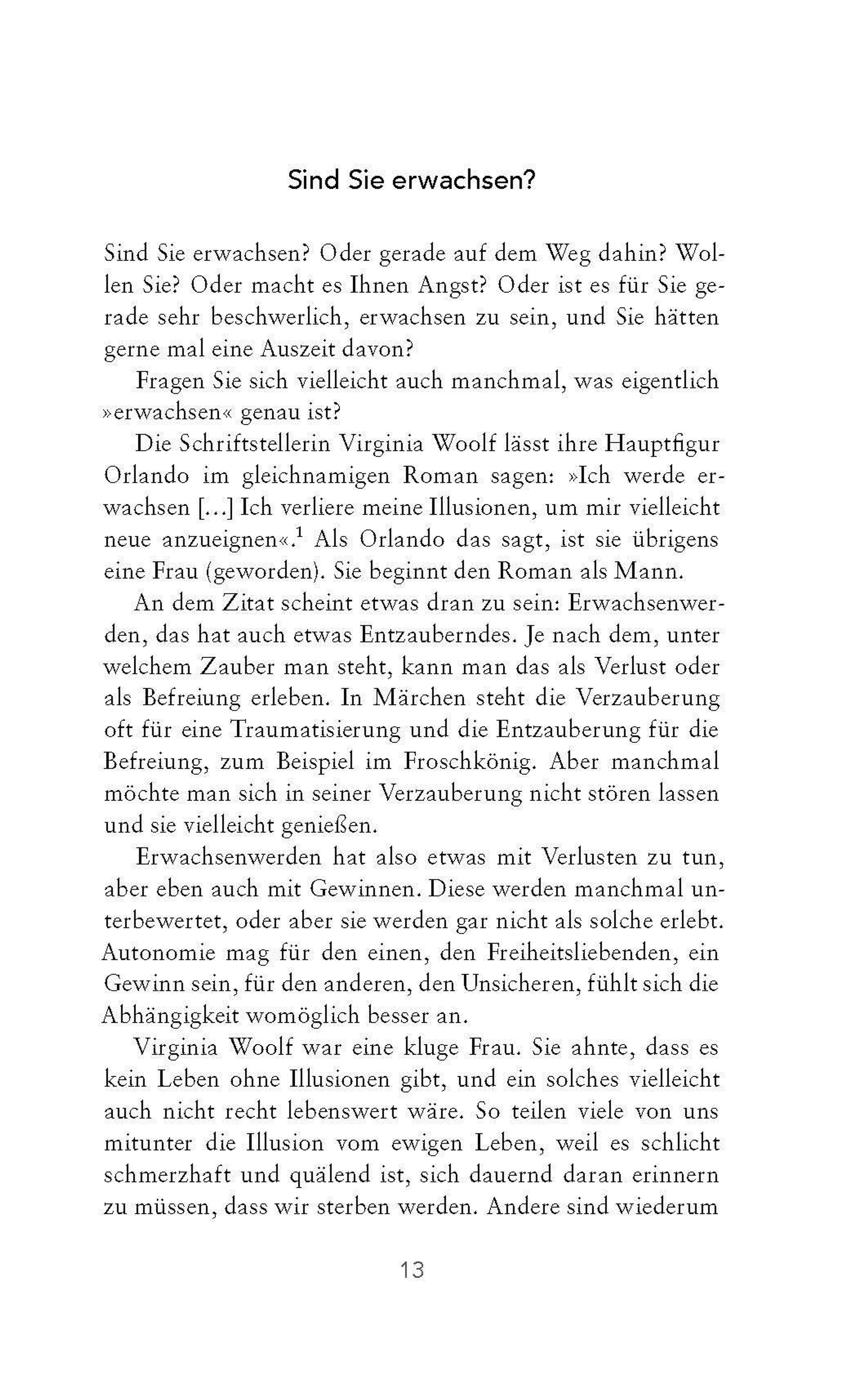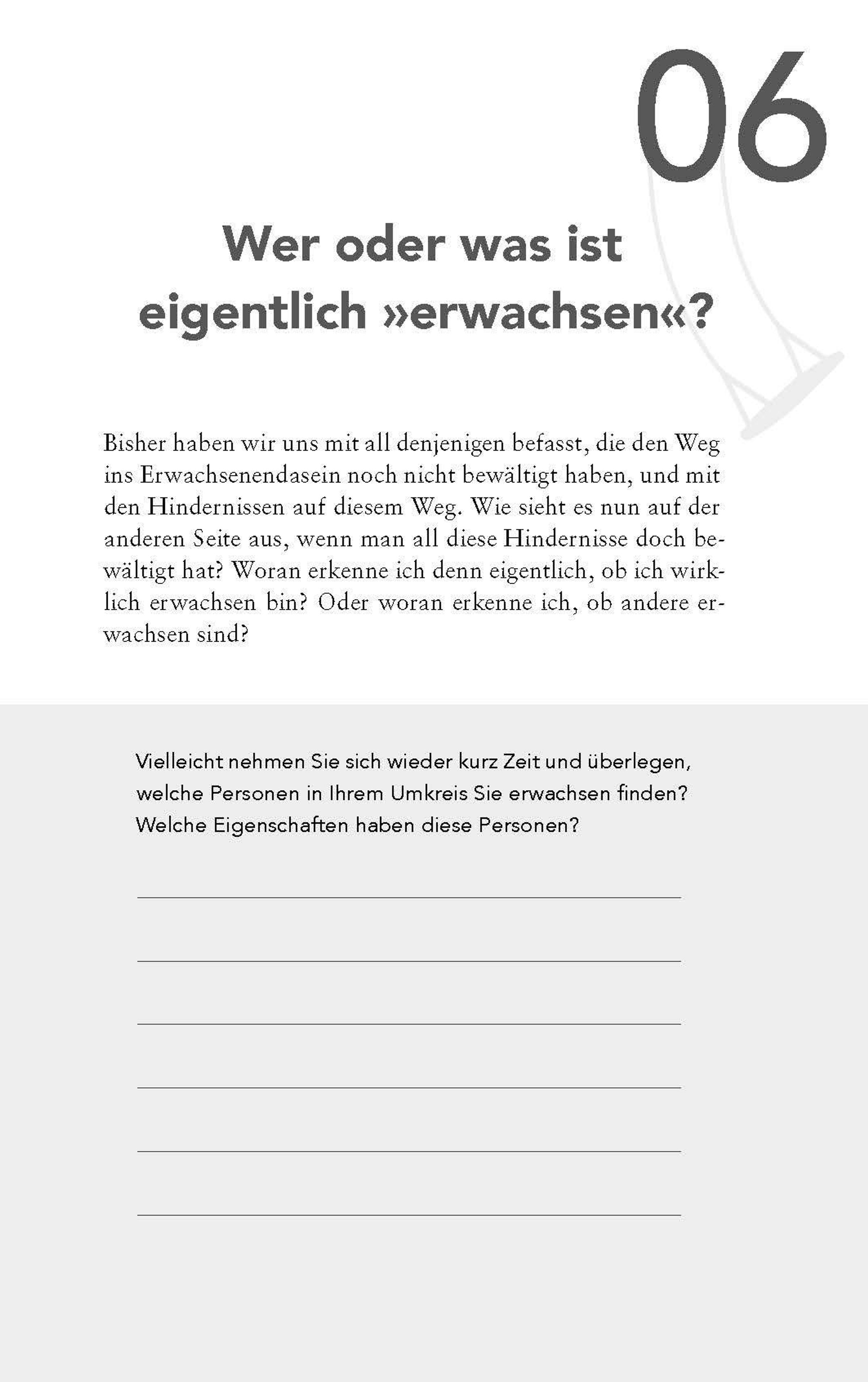 Das Buch räumt dabei mit gängigen Mythen über das Erwachsensein auf und wirft einen kritischen Blick auf Ratgeber, die den Rückzug in kindliche Bedürfnisse propagieren, statt zur Entwicklung und einem reflektierten Umgang mit den kindlicheren Seiten unserer Persönlichkeit zu ermutigen.