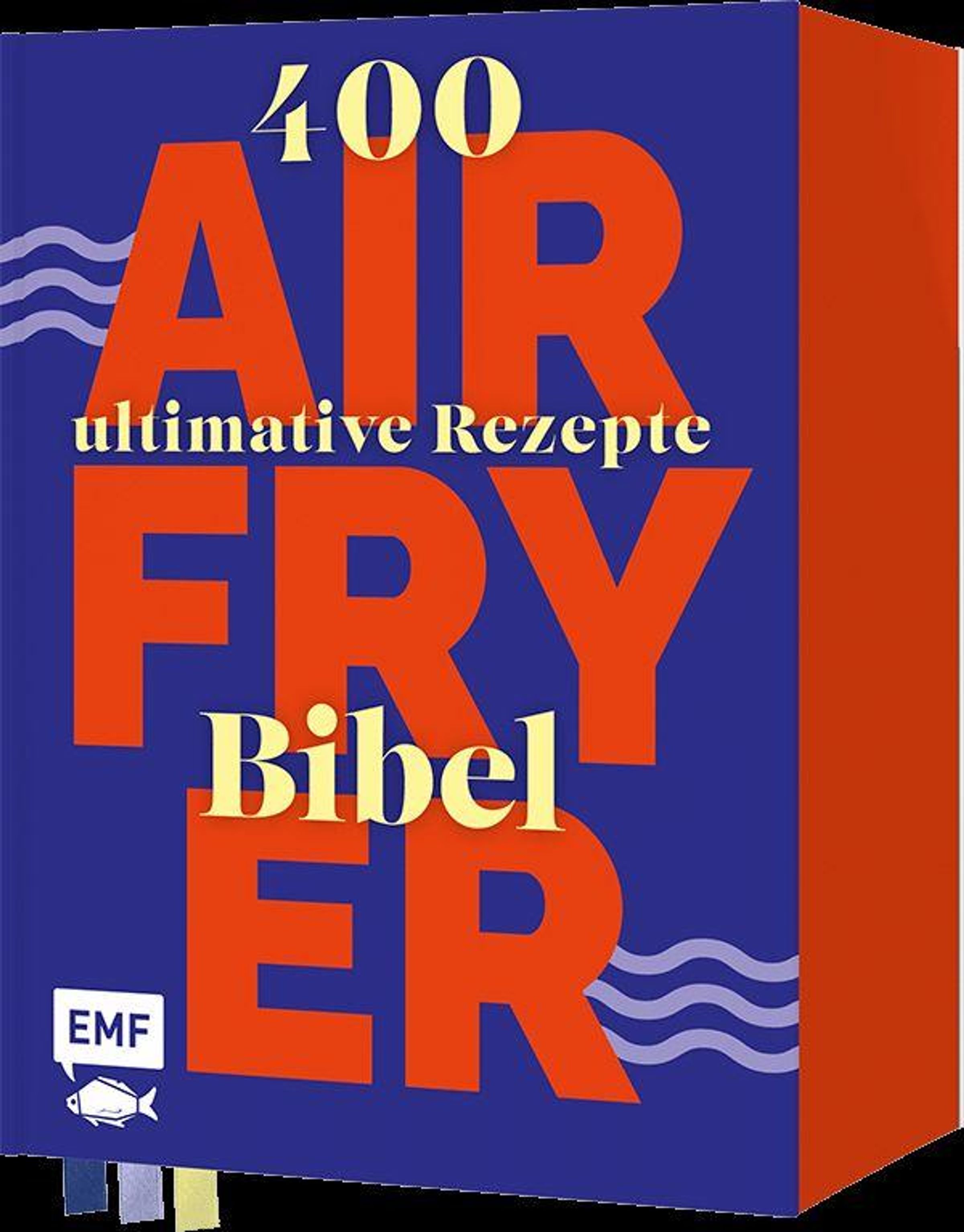 Text: "400 ultimative Rezepte AIR FRYER Bibel". Blaues Cover mit großen roten Buchstaben. Unten links ein kleines Logo., Buch