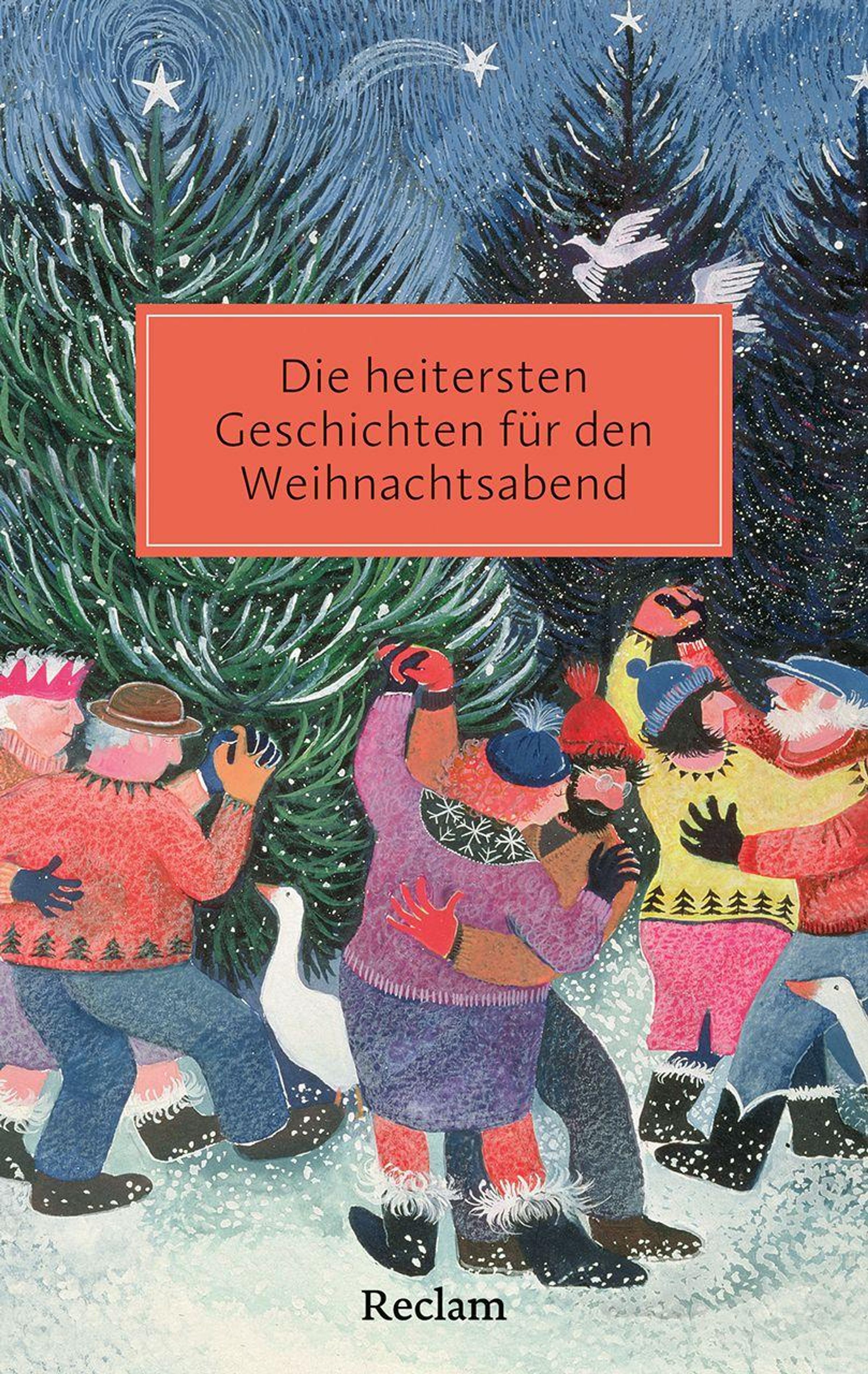 "Die heitersten Geschichten für den Weihnachtsabend." Illustration: Menschen tanzen im Schnee unter glitzernden Tannen., Buch
