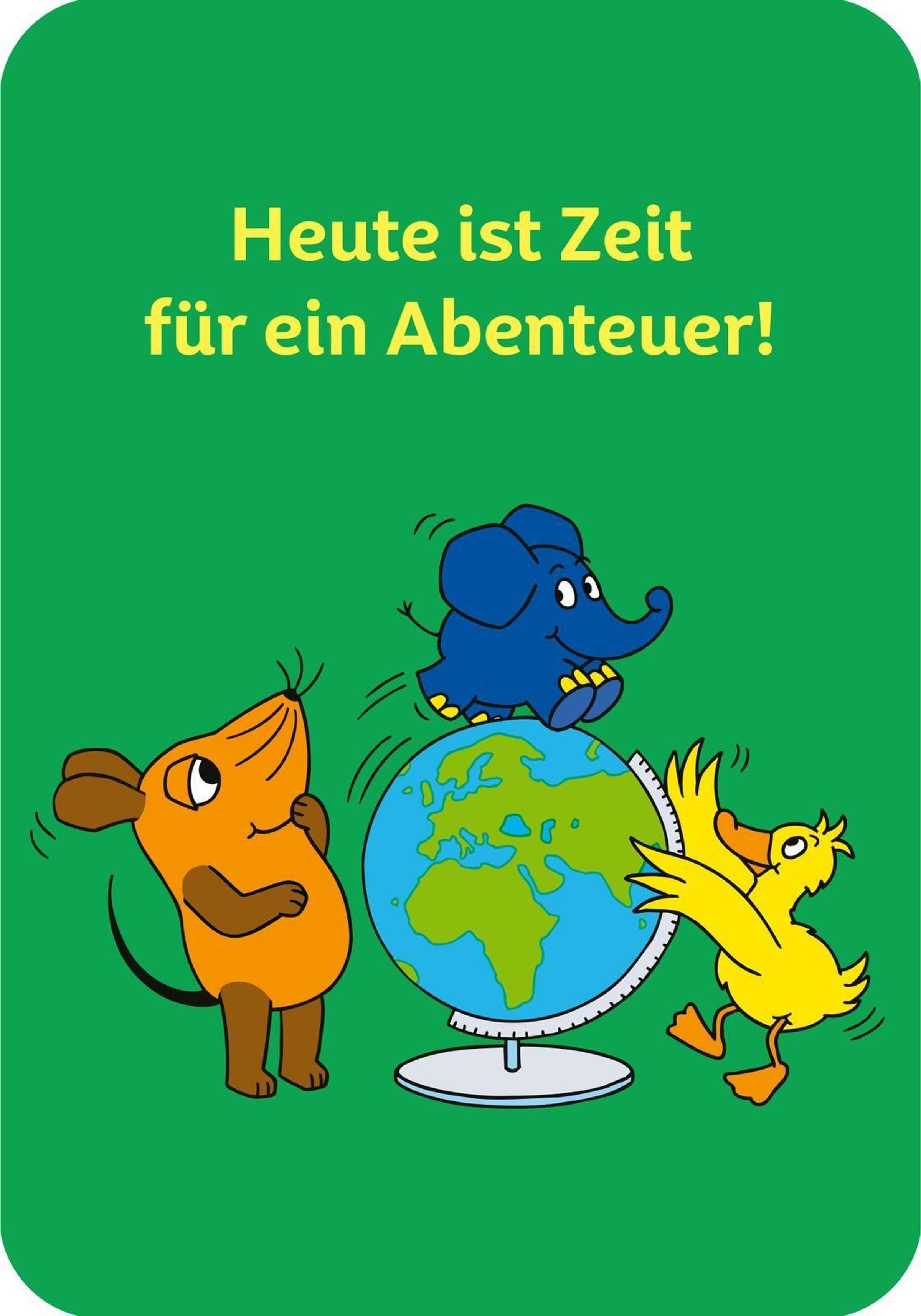 Text: "Mutmachkarten", "50 Karten für dich". Illustration mit Maus, Ente und Elefant auf grünem Hintergrund., Buch