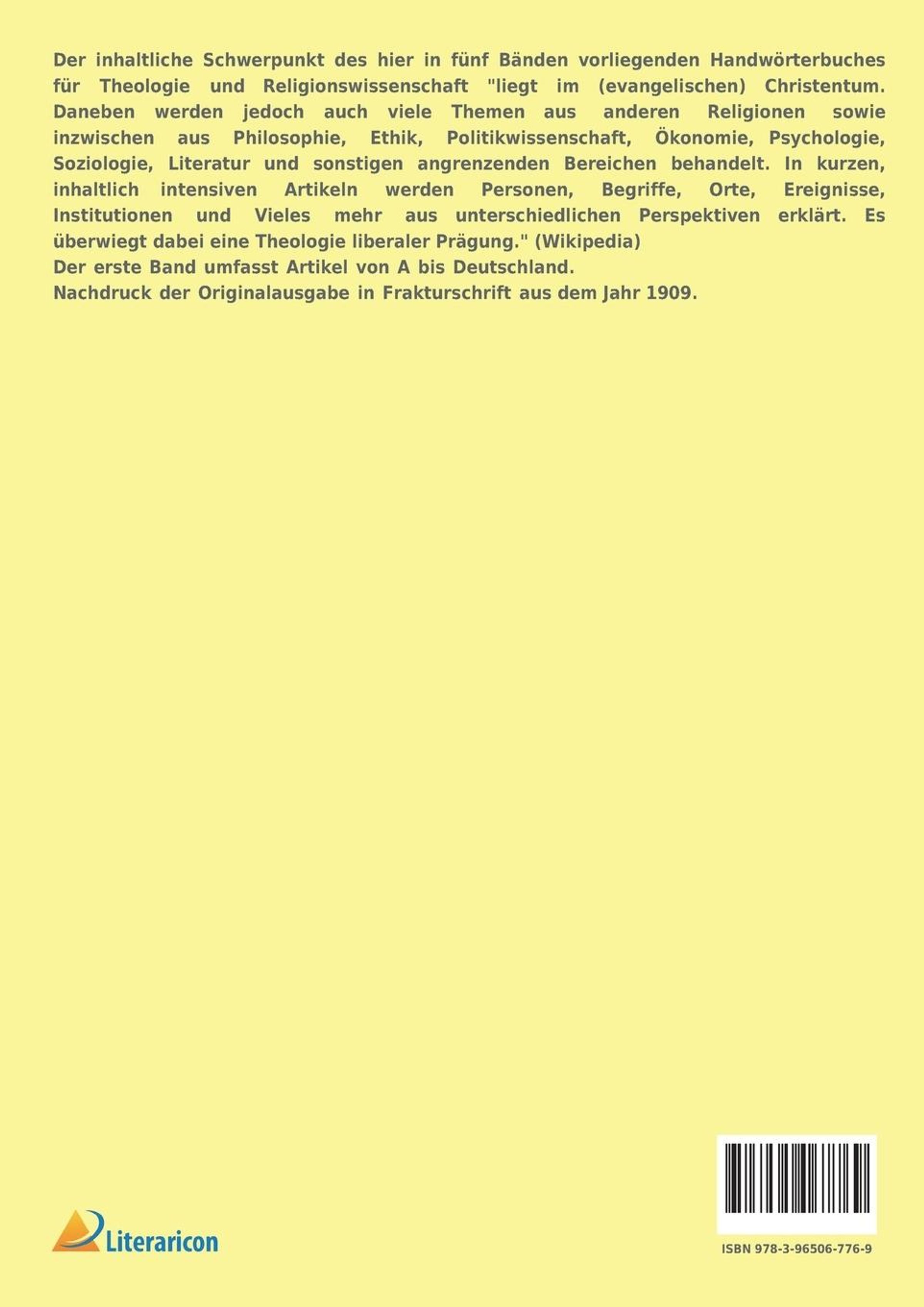 Der inhaltliche Schwerpunkt des hier in fünf Bänden vorliegenden Handwörterbuches für Theologie und Religionswissenschaft "liegt im (evangelischen) Christentum. Daneben werden jedoch auch viele Themen aus anderen Religionen sowie inzwischen aus Philosophie, Ethik, Politikwissenschaft, Ökonomie, Psychologie, Soziologie, Literatur und sonstigen angrenzenden Bereichen behandelt. In kurzen, inhaltlich intensiven Artikeln werden Personen, Begriffe, Orte, Ereignisse, Institutionen und Vieles mehr aus unterschiedlichen Perspektiven erklärt. Es überwiegt dabei eine Theologie liberaler Prägung." (Wikipedia) Der erste Band umfasst Artikel von A bis Deutschland. Nachdruck der Originalausgabe in Frakturschrift aus dem Jahr 1909.