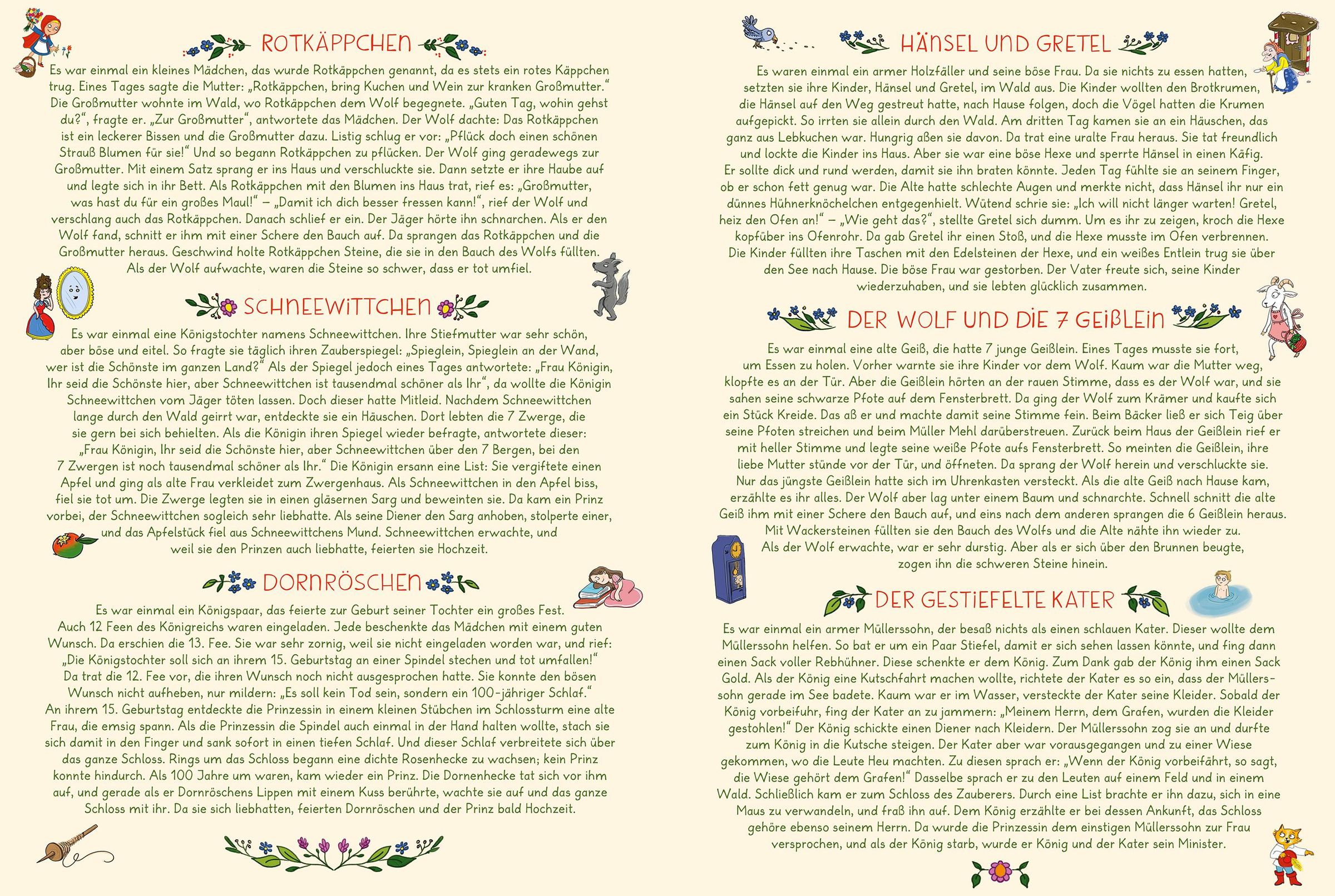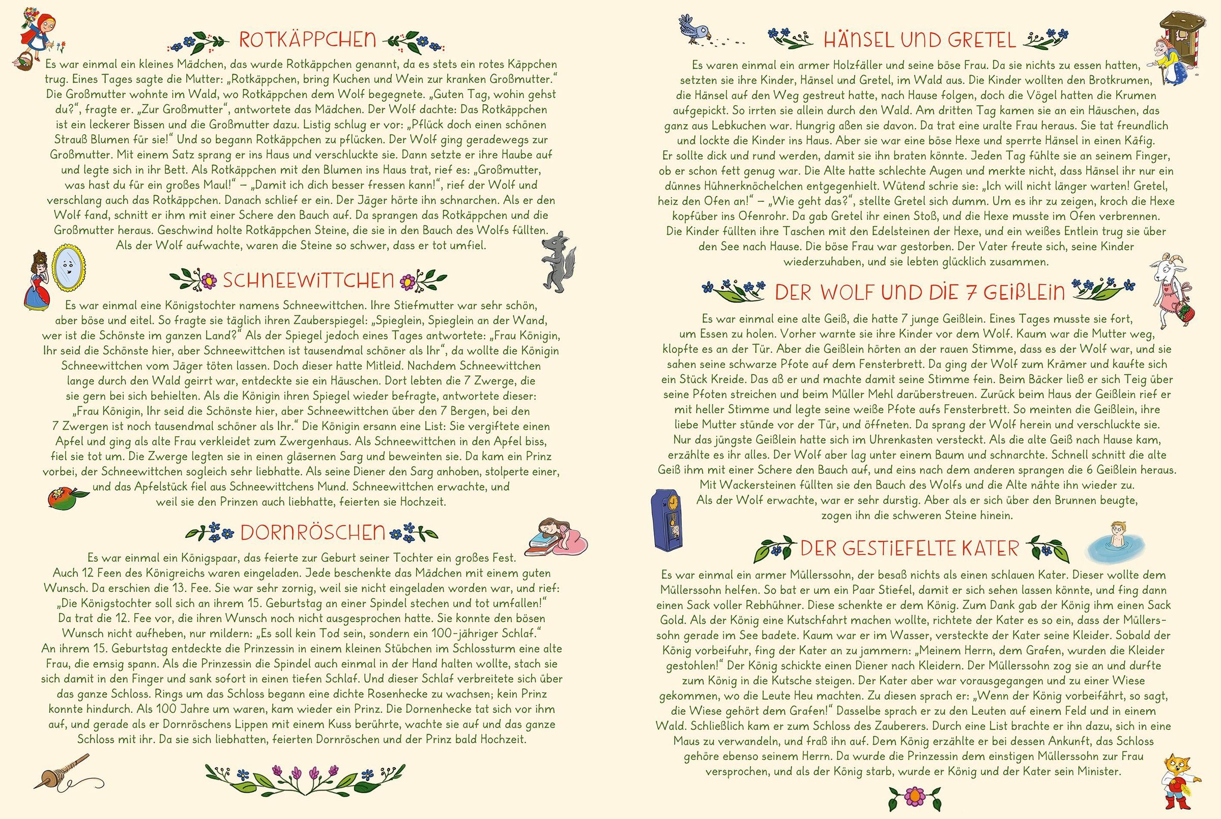 Dieses großformatige Wimmelmärchenbuch erzählt sechs der bekanntesten Märchen der Brüder Grimm in detailreichen Bildern: "Rotkäppchen", "Schneewittchen", "Dornröschen", "Hänsel & Gretel", "Der Wolf und die sieben Geißlein" und "Der gestiefelte Kater". Anhand der Bilderleiste können zentrale Figuren und Gegenstände der Märchen gesucht und zugleich die Geschichte nacherzählt werden. Auf der letzten Doppelseite finden sich noch einmal kurze Zusammenfassungen der Märchen.