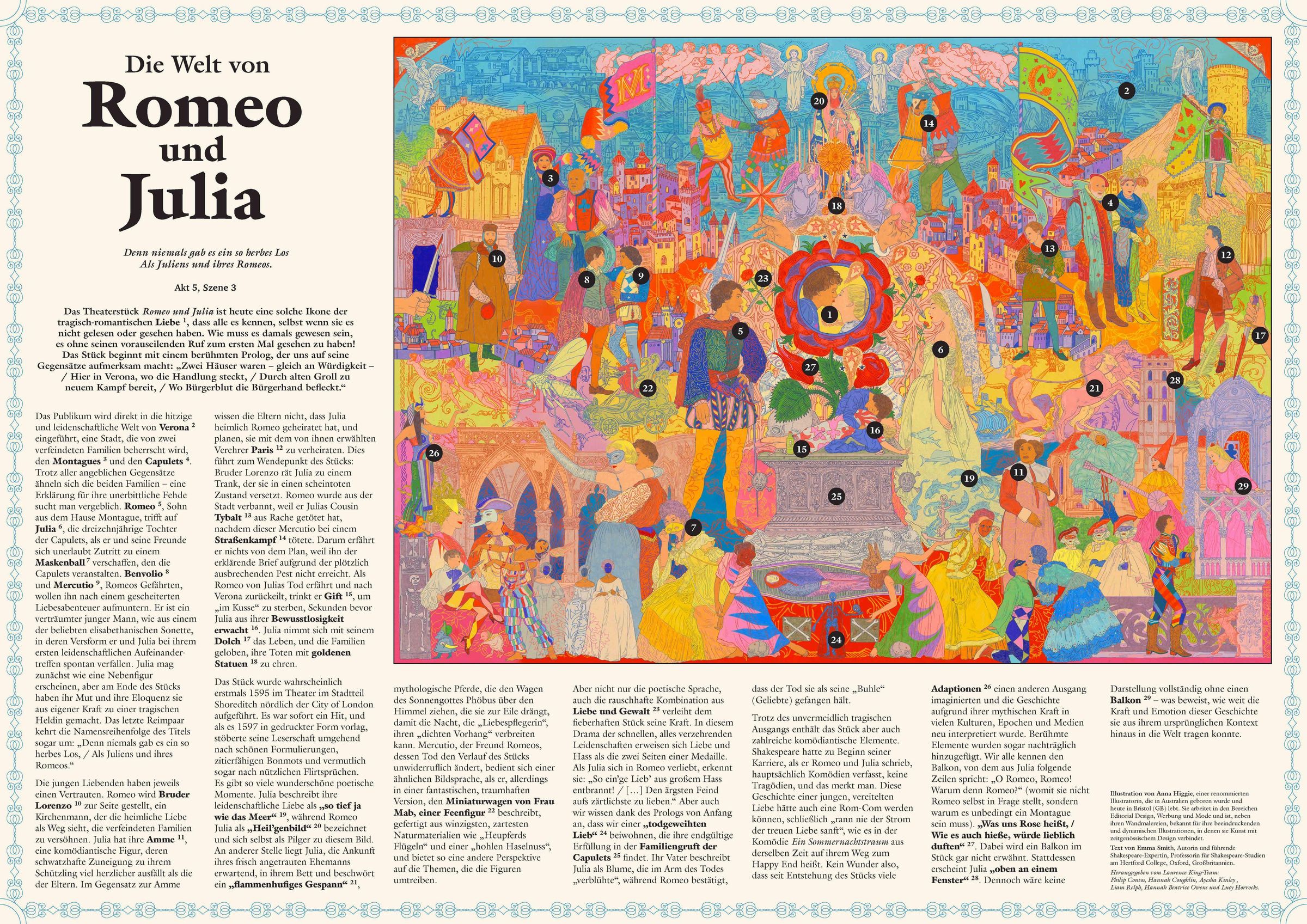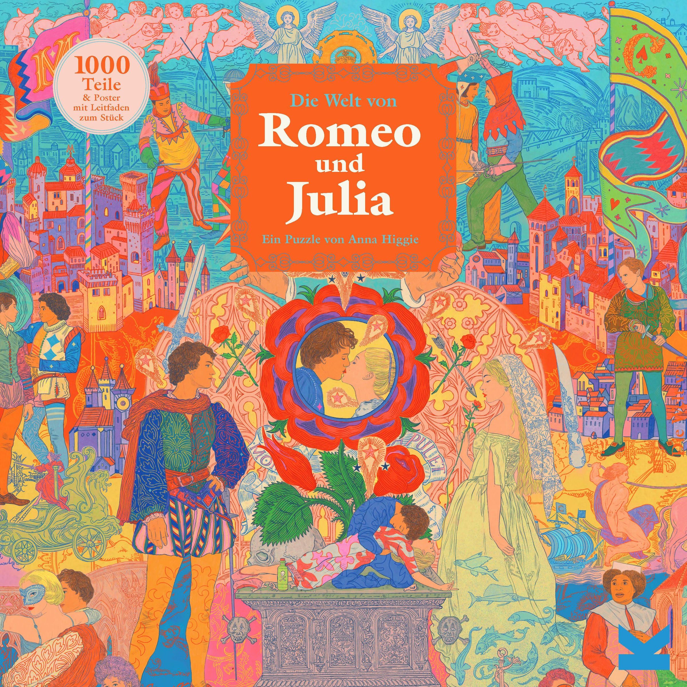 "Die Welt von Romeo und Julia, Ein Puzzle von Anna Higgie" steht zentral. Buntes, detailliertes Gemälde mit mittelalterlichen Figuren., Spiele