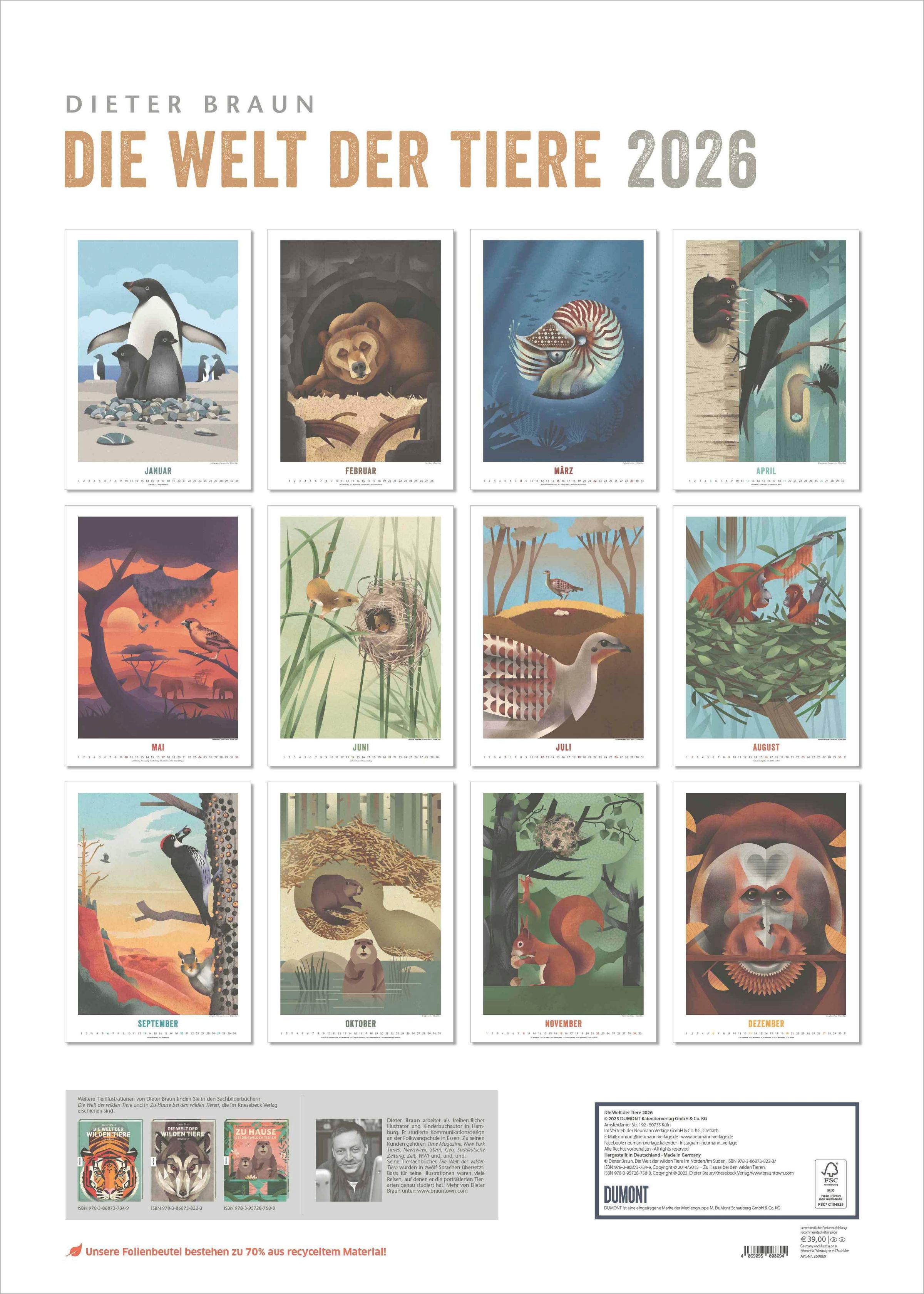 Erleben Sie die faszinierende Tierwelt in einzigartigen Grafiken: Der DUMONT Wandkalender 2026 -- Die Welt der Tiere von Dieter Braun begeistert mit eindrucksvollen Wildlife-Illustrationen, die Kunst und Natur perfekt verbinden.