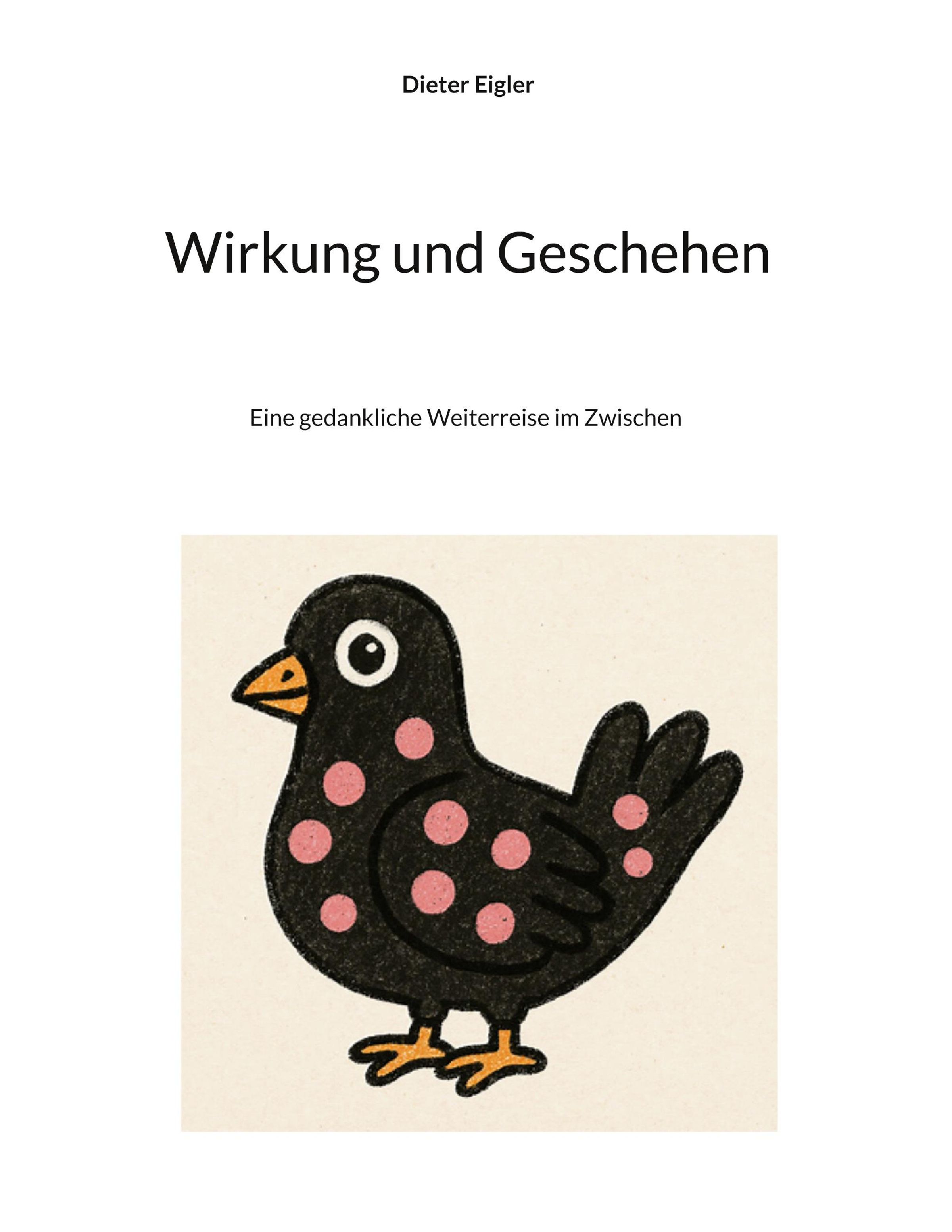 „Wirkung und Geschehen“ von Dieter Eigler. Illustration: Ein schwarzer Vogel mit rosa Punkten., Buch