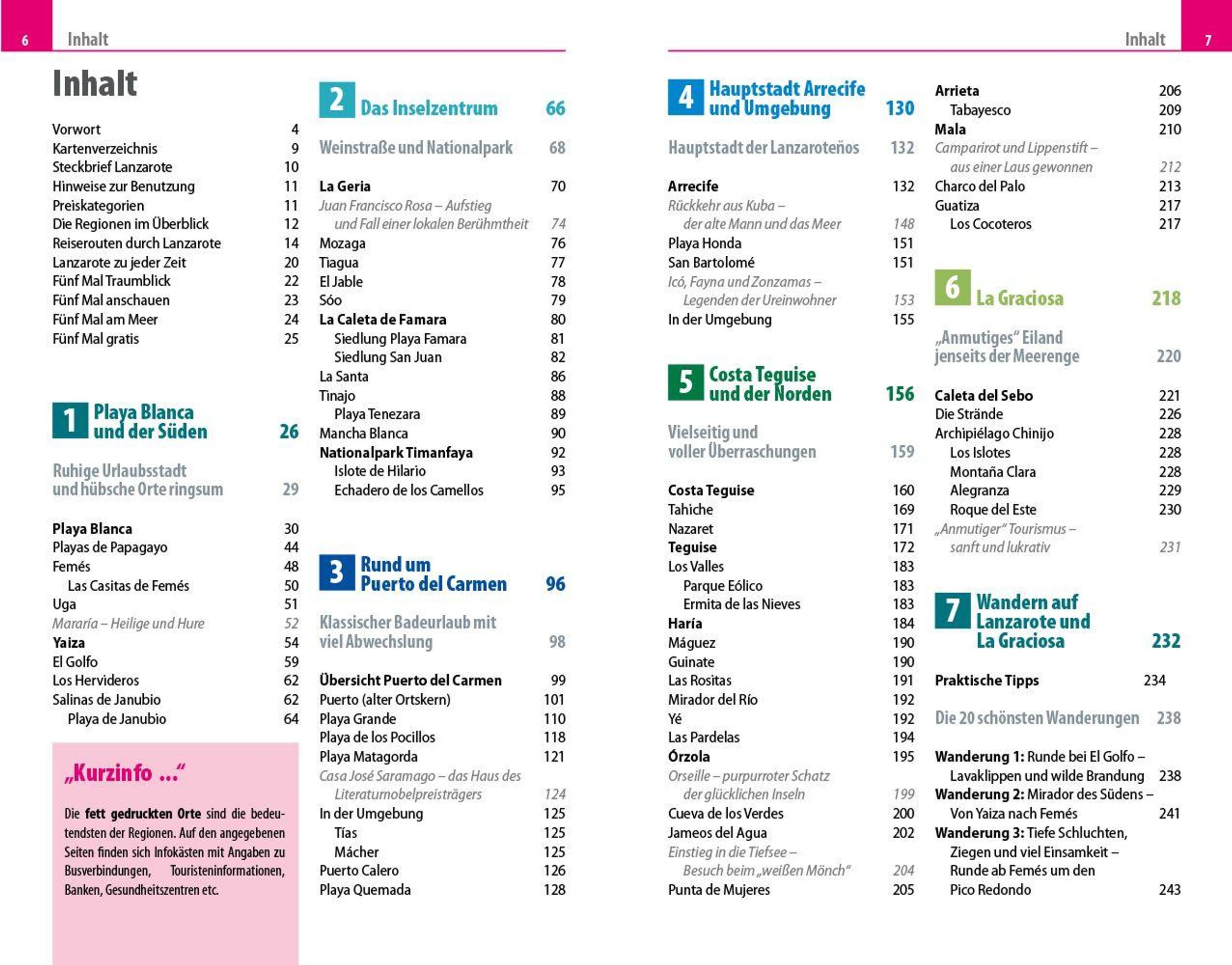Übersichtsseiten mit den bedeutendsten Regionen der Insel: Playa Blanca und der Süden, das Inselzentrum, Puerto del Carmen, Arrecife und Umgebung, Costa Teguise und der Norden sowie La Graciosa
