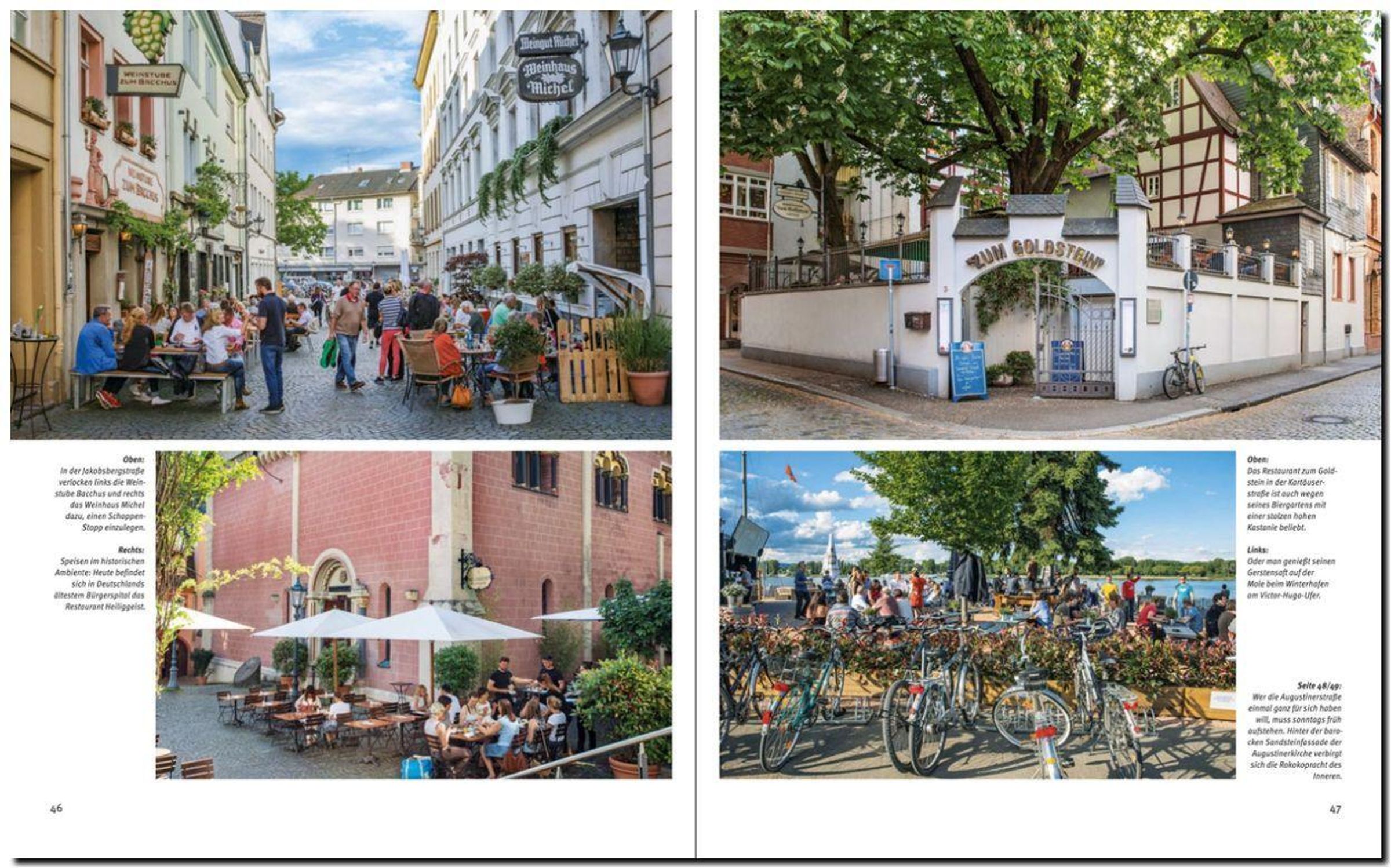 Heute genießt man in der Rheinmetropole das sommerliche Leben am Fluss, in der Fünften Jahreszeit verwandeln kostümierte Fastnachter Helau rufend, schunkelnd und tanzend die Straßen in ein einziges Tollhaus. Am Kirschgarten machen Fachwerkhäuser und ein Brunnen die Postkartenidylle fast perfekt, den Puls der Stadt spürt man an der "Lu" (Ludwigsstraße), der Flaniermeile, die schon Kaiser Napoleon als "Grand Rue Napoleon" zwischen Dom und Schillerplatz plante. In der Mainzer Neustadt locken viele Plätze, verkehrsberuhigte Straßen, Kneipen und Cafés.