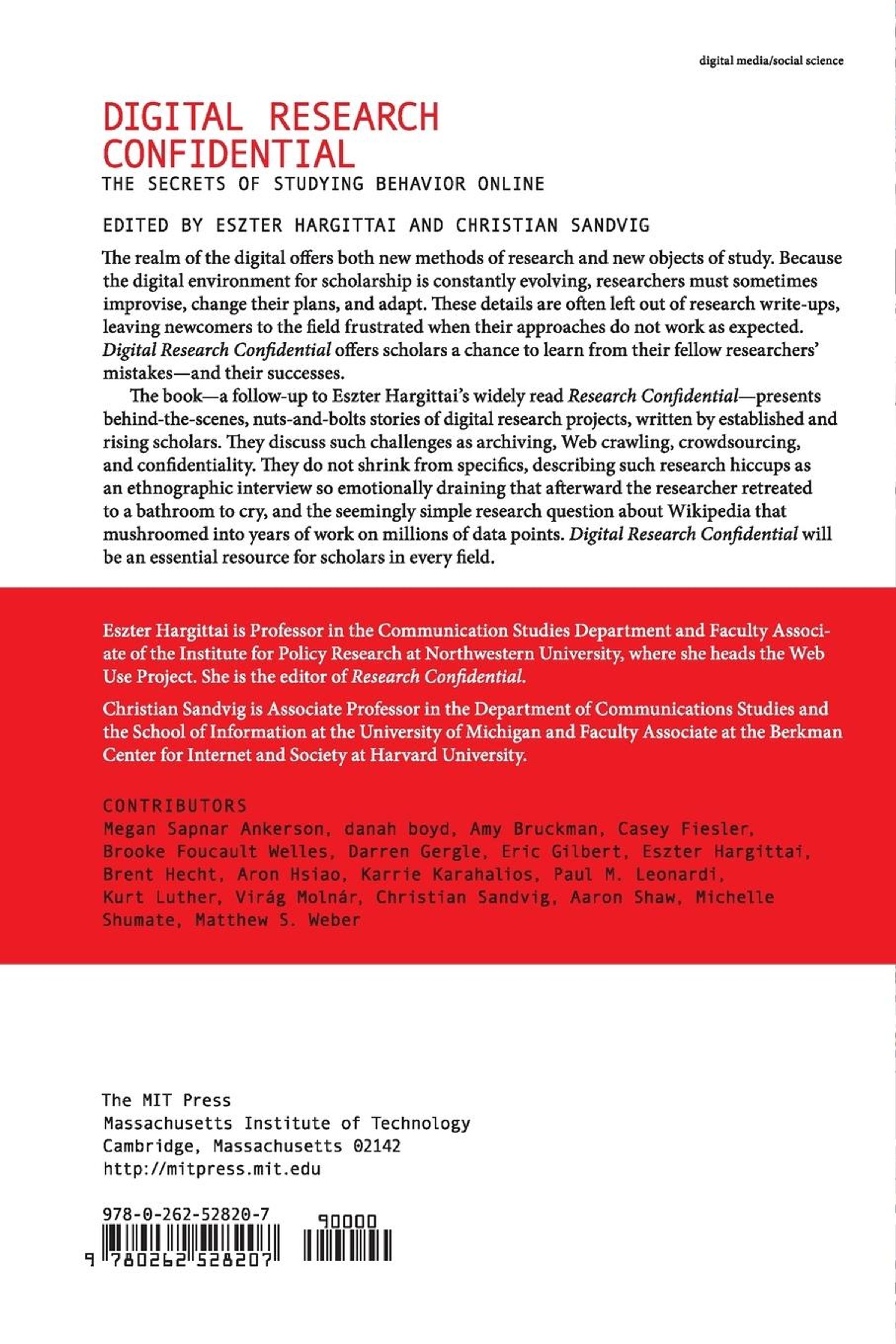 The book---a follow-up to Eszter Hargittai's widely read Research Confidential ---presents behind-the-scenes, nuts-and-bolts stories of digital research projects, written by established and rising scholars. They discuss such challenges as archiving, Web crawling, crowdsourcing, and confidentiality. They do not shrink from specifics, describing such research hiccups as an ethnographic interview so emotionally draining that afterward the researcher retreated to a bathroom to cry, and the seemingly simple research question about Wikipedia that mushroomed into years of work on millions of data points. Digital Research Confidentialwill be an essential resource for scholars in every field.
