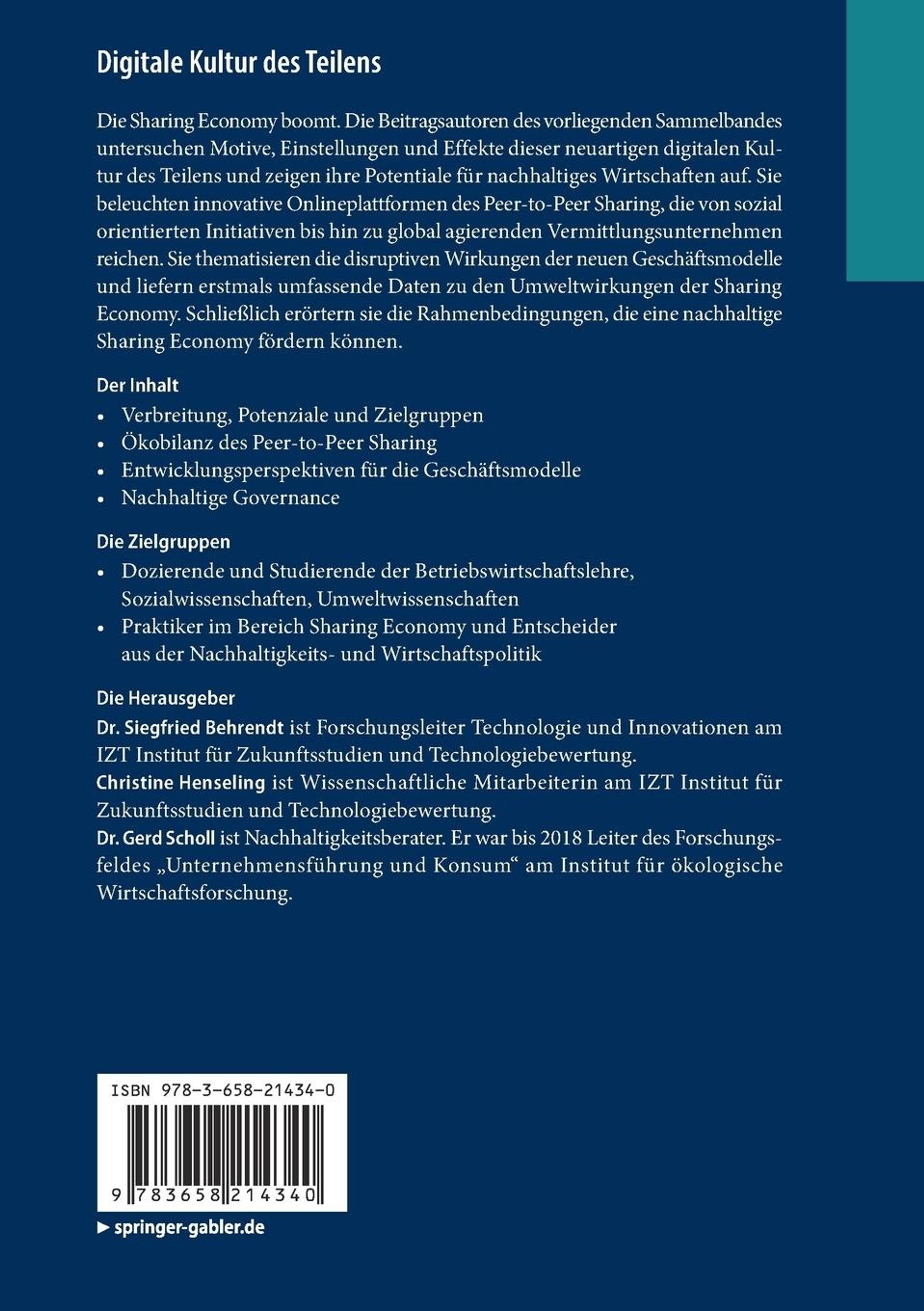 Die Sharing Economy boomt. Die Beitragsautoren des vorliegenden Sammelbandes untersuchen Motive, Einstellungen und Effekte dieser neuartigen digitalen Kultur des Teilens und zeigen ihre Potentiale für nachhaltiges Wirtschaften auf. Sie beleuchten innovative Onlineplattformen des Peer-to-Peer Sharing, die von sozial orientierten Initiativen bis hin zu global agierenden Vermittlungsunternehmen reichen. Sie thematisieren die disruptiven Wirkungen der neuen Geschäftsmodelle und liefern erstmals umfassende Daten zu den Umweltwirkungen der Sharing Economy. Schließlich erörtern sie die Rahmenbedingungen, die eine nachhaltige Sharing Economy fördern können.