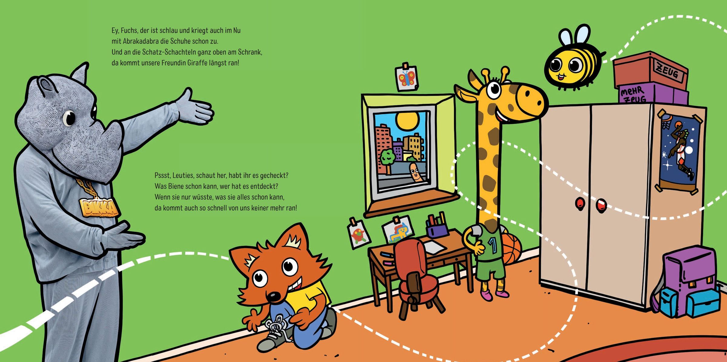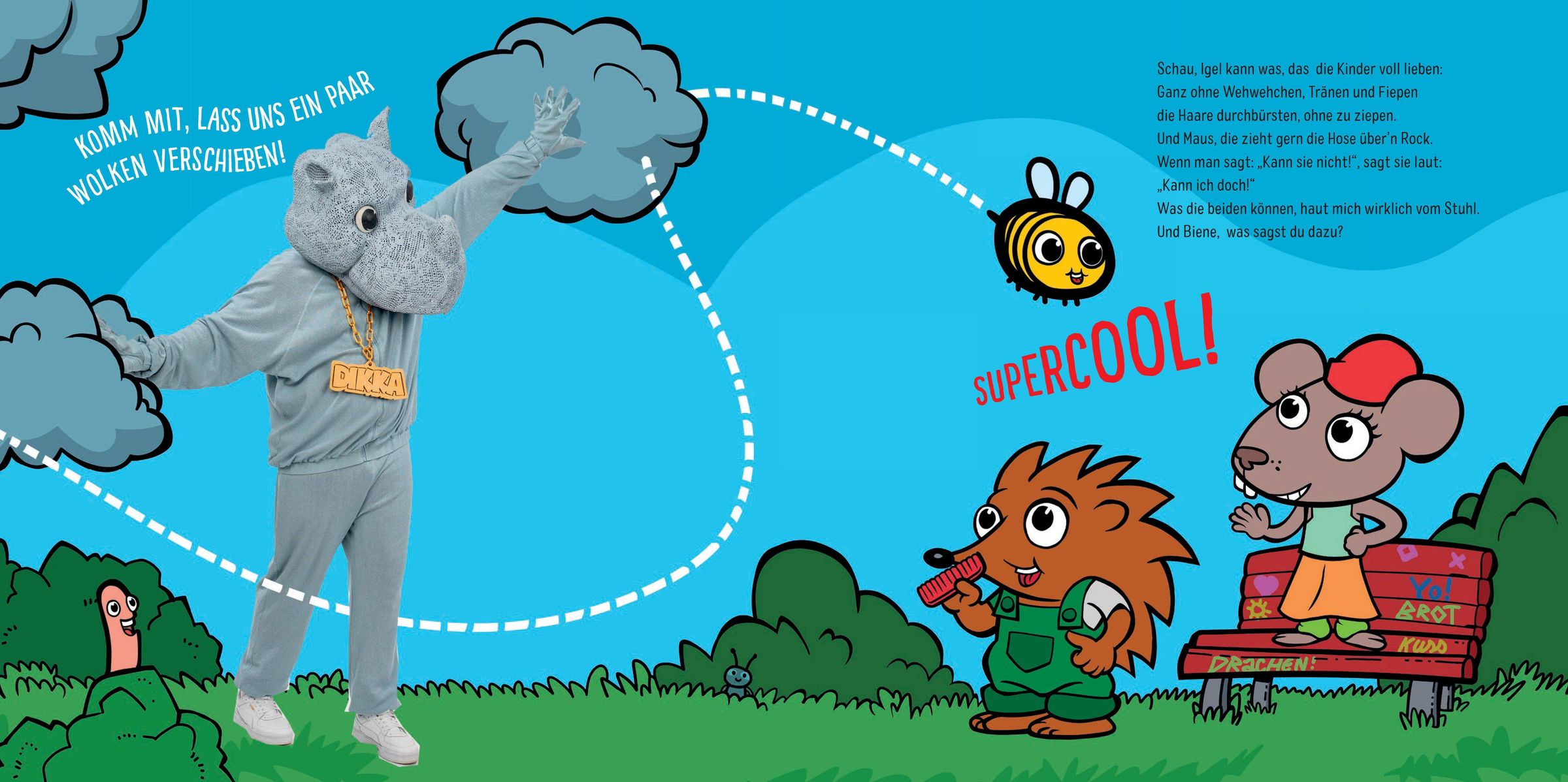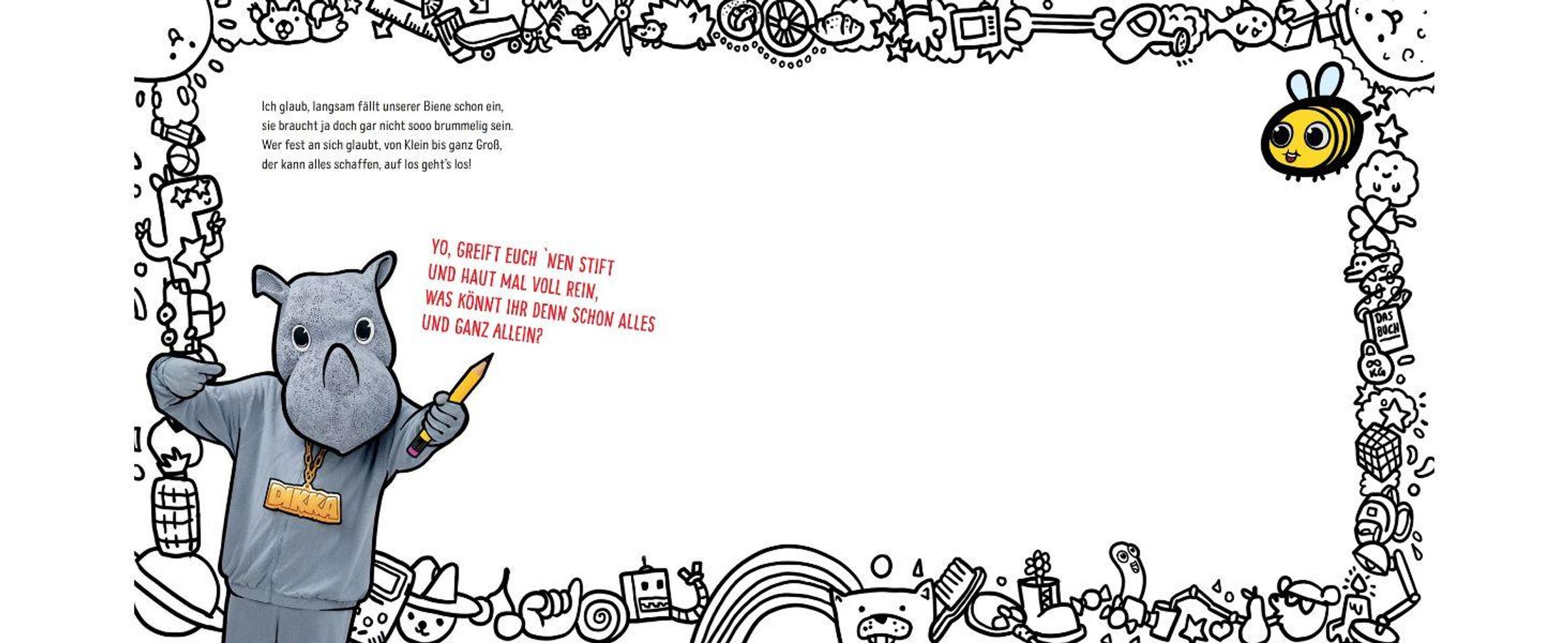 Das Nashorn DIKKA ist aktuell der erfolgreichste Musiker im Kinderbereich. Wenn seine Songs ertönen, gibt es bei Klein und Groß kein Halten mehr: Hier treffen freche Texte auf altbekannte Hip-Hop-Beats. DIKKA ist der coole große Freund, der die Kinder ermutigt, ihr Ding zu machen. Und nun gibt's das beliebte Nashorn nicht mehr nur auf die Ohren, sondern auch im Bilderbuch: Die kleine Biene ist schüchtern und verunsichert, bis DIKKA sie an die Hand nimmt. Zusammen mit seinen Freunden zeigt er ihr, was sie eigentlich schon alles kann: "Ich zieh gern 'ne Hose über 'nen Rock. Du sagst, kann ich nicht, haha, kann ich doch!" DIKKA macht Kindern Mut, die Welt auf ihre eigene Weise zu erobern.