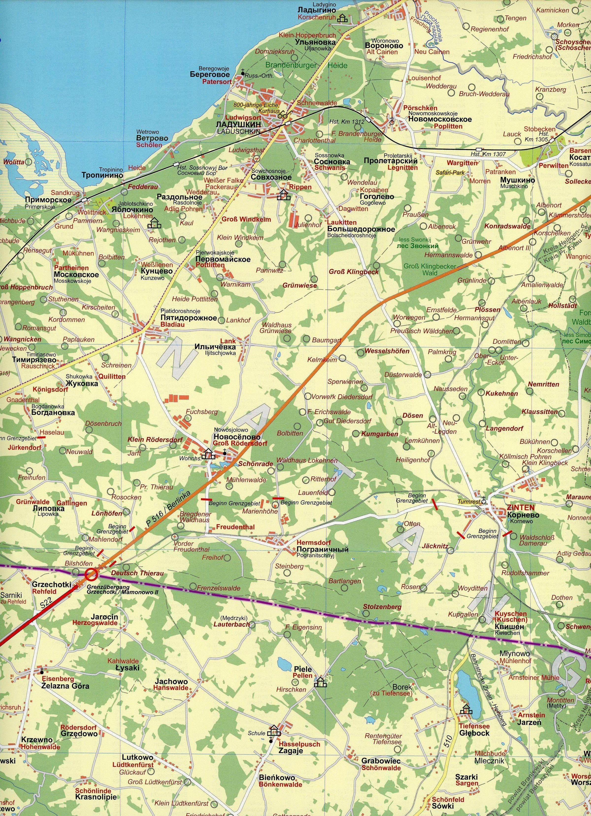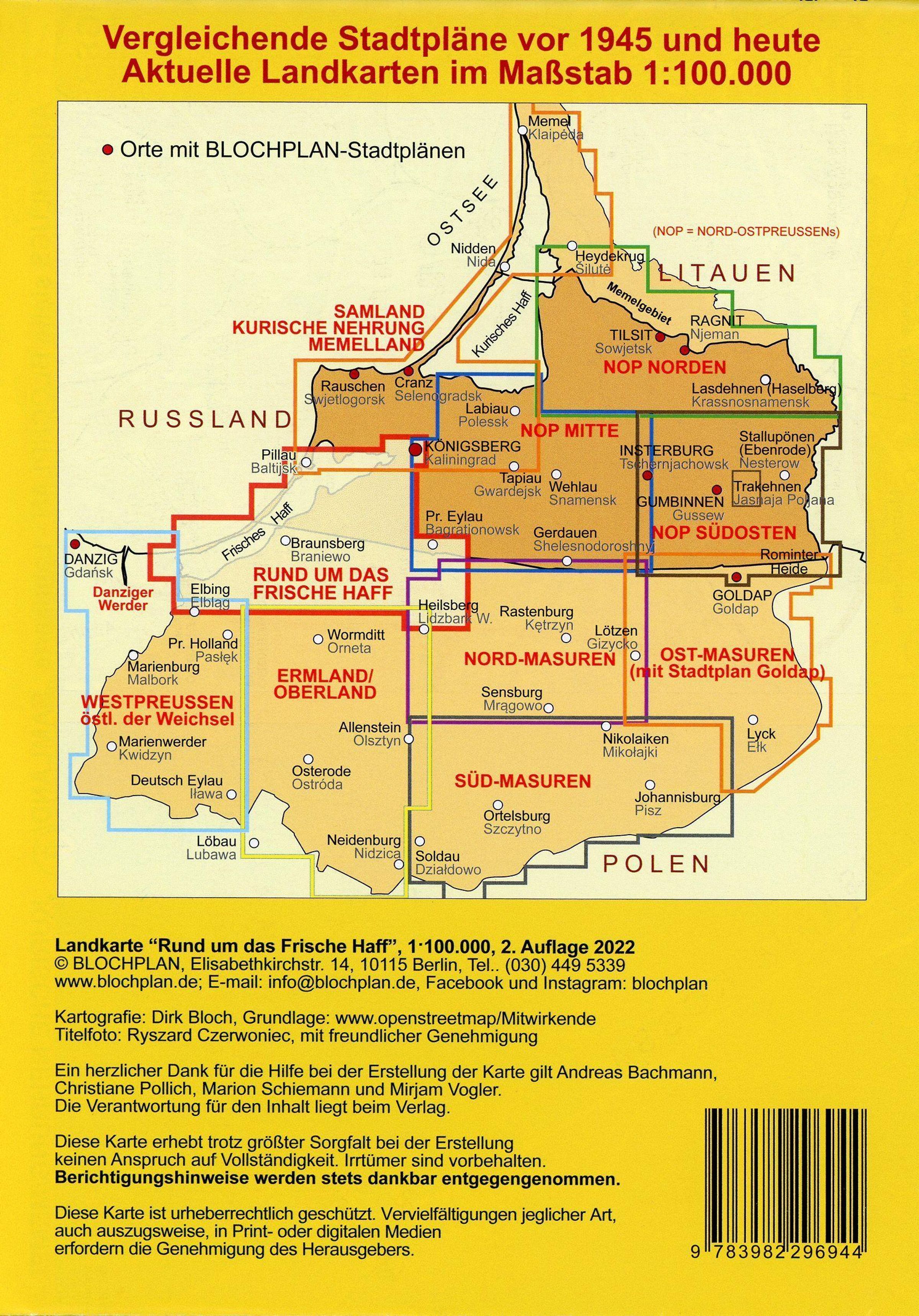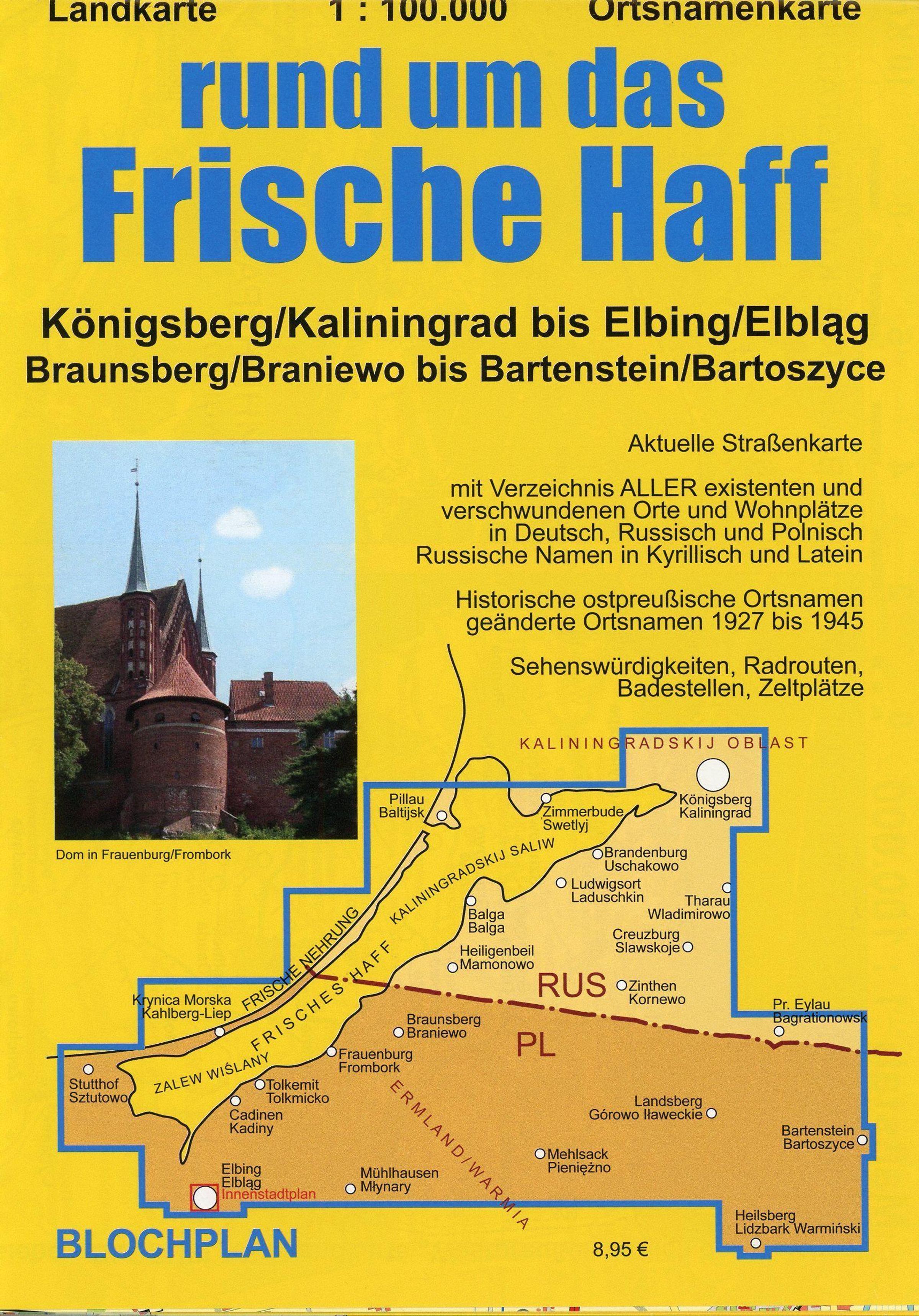 Die aktuelle Landkarte "rund um das Frische Haff" zeigt im detaillierten Maßstab 1: 100.000 den Bereich zwischen Königsberg / Kaliningrad im Nordosten, Elbing / Elbl¿g im Südwesten und Heilsberg / Lidzbark Warminski sowie Bartenstein / Bartoszyce im Südosten. Darin enthalten ist auch das Umfeld der Städte Heiligenbeil / Mamonowo, Braunsberg / Braniewo, Frauenburg / Frombork, Mehlsack / Pien¿¿no, Zinten / Kornewo, Pr. Eylau / Bagrationowsk und Landsberg / Górowo I¿awieckie. Die Karte zeigt somit fast die gesamten historischen ostpreußischen Landkreise Heiligenbeil und Bartenstein mit den landschaftlich reizvollen Bereichen der Elbinger Höhe, der Frischen Nehrung oder des Stablack. Die Karte zeigt auch, wie die von Stalin gezogene Grenze die Landschaft mit ihren historisch gewachsenen Verkehrswegen durchschneidet. Die Landkarte enthält ALLE in diesem Gebiet vor 1945 vorhandenen Orte und Wohnplätze (darunter zahlreiche Förstereien mit eigenem Wohnplatzstatus), die jeweils mit ihrem historischen Namen, dem ggf. in den 1930er Jahren germanisierten Namen und - wenn heute noch vorhanden - mit den aktuellen Namen in Polnisch und Russisch (in kyrillischer Schrift und lateinischer Umschrift) bezeichnet werden. Von den hier einst vorhandenen ca. 1200 Orten und Wohnplätzen sind heute im russischen Teil nur noch 40% und im polnischen Teil wenigstens noch 70% existent. Die "verschwundenen" Orte sind als solche dargestellt. Außerdem enthält die Karte Hinweise auf besondere Sehenswürdigkeiten wie z. B. die Ordensburg-Ruinen in Brandenburg, Balga oder Mehlsack, die (im russischen Teil wenigen) erhaltenen Guts- und Herrenhäuser aber auch z. B. die Radrouten im touristisch gut erschlossenen polnischen Ermland und Natangen. Zur besseren Orientierung sind neben den Straßen und nur zum Teil befahrbaren Wegen noch die aktuellen aber auch die stillgelegten Eisenbahnstrecken und die Kreisgrenzen von 1937 dargestellt. Ein aktueller Innenstadtplan von Elbing / Elbl¿g mit zusätzlicher Bezeichnung der früheren deutschen Straßennamen ergänzt die Karte.
