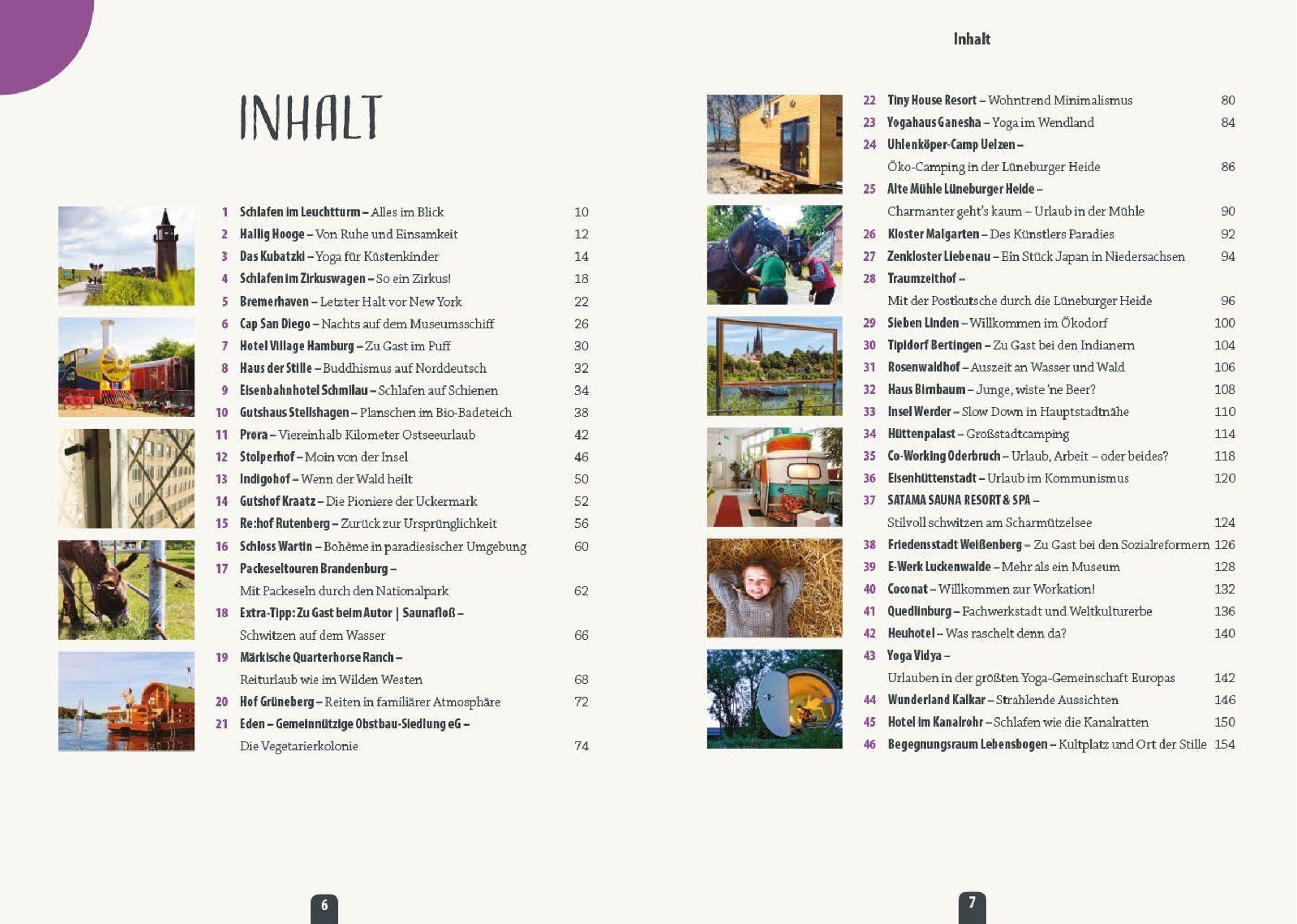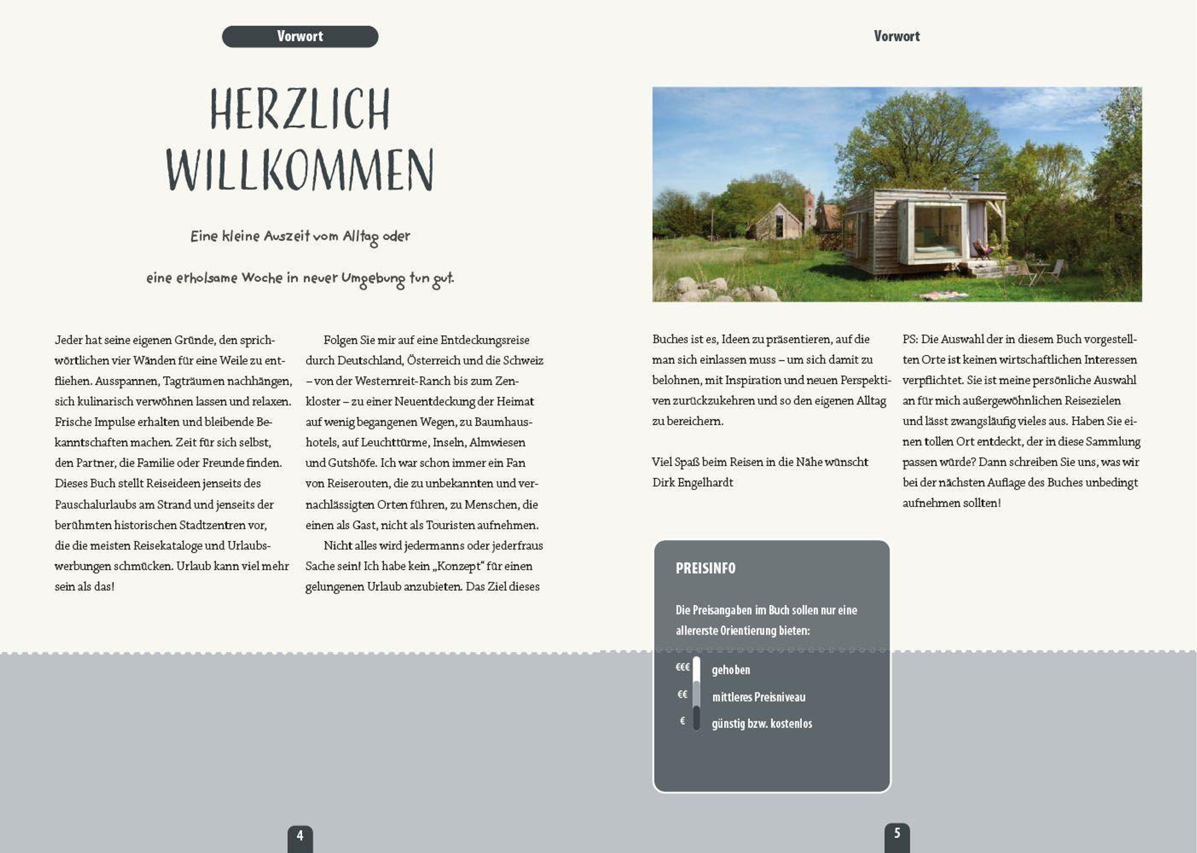 Um einen erholsamen und inspirierenden Urlaub zu erleben, muss man nicht auf die Bahamas fliegen ¿ auch vor der eigenen Haustür gibt es eine Menge zu erleben! Vom naturnahen Yoga-Retreat am See über Zen-Klöster in wilden Bergtälern, einsame Berghütten und Hotelzimmer in alten Eisenbahnwaggons bis hin zum morbiden Schloss in der Uckermark, in dem die Bohème zu Gast ist ¿ alternative Reiseziele, die durch ihre Nähe eine nachhaltige Art zu Reisen ermöglichen, gibt es auch in heimischen Gefilden.