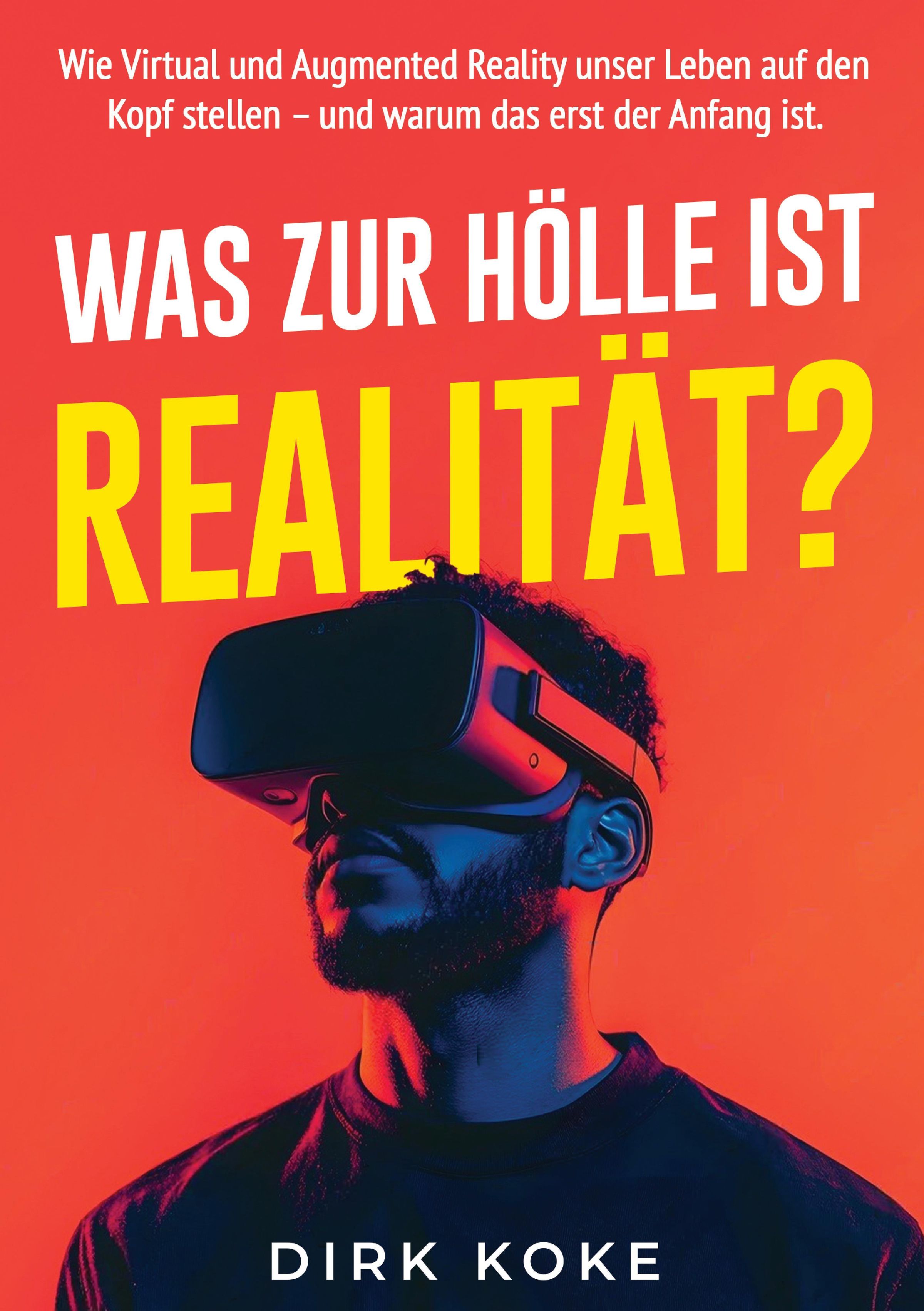 "Was zur Hölle ist Realität?" Oben: Virtual/Augmented Reality. Unten: Dirk Koke. Illustration: Person mit VR-Brille vor rotem Hintergrund., Buch